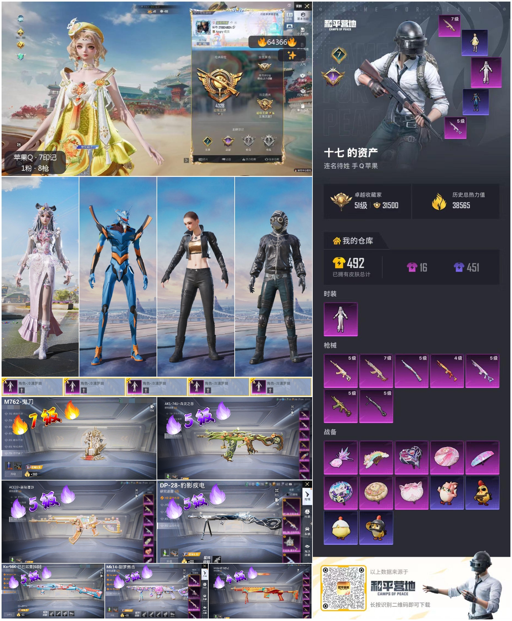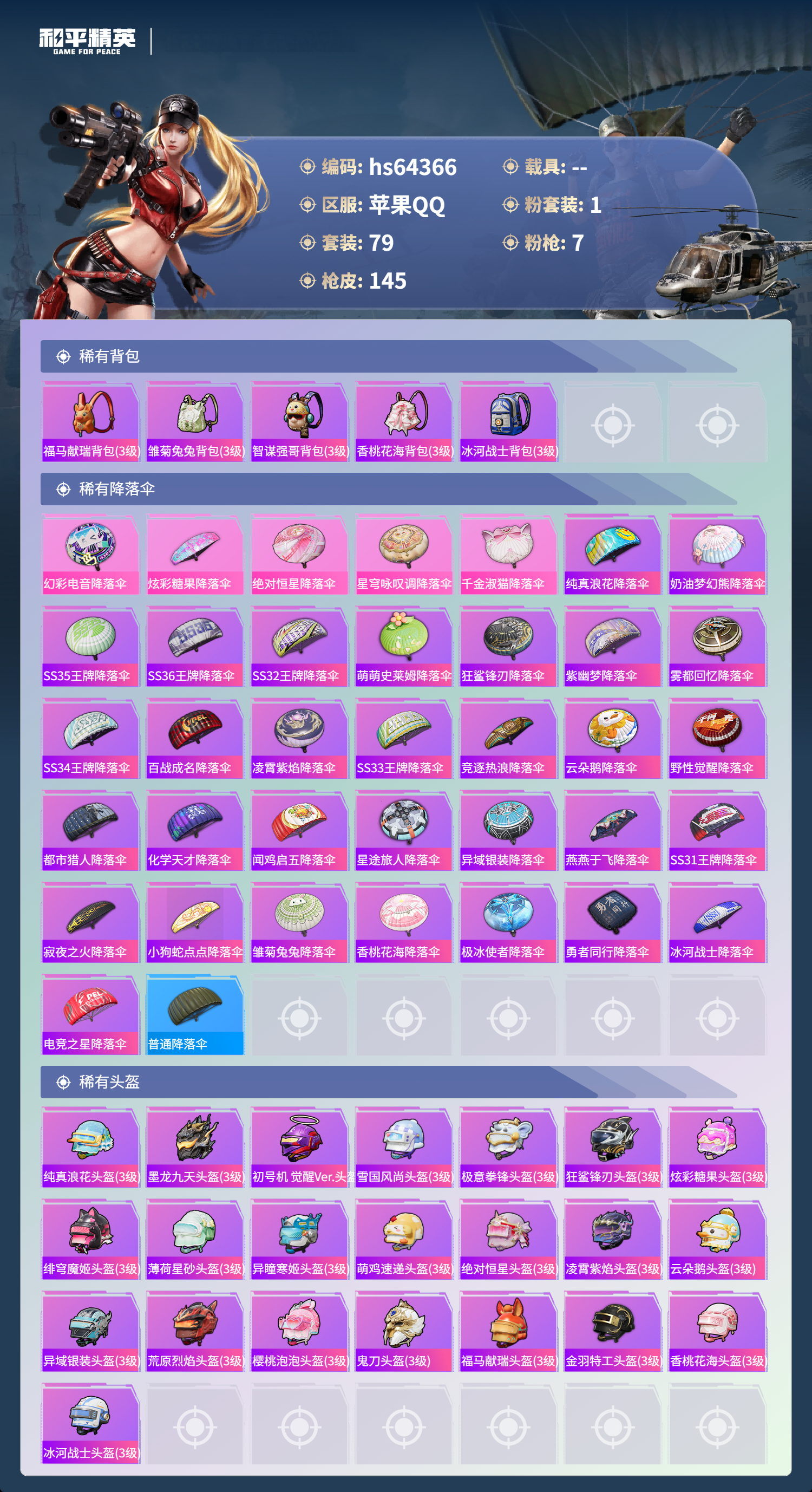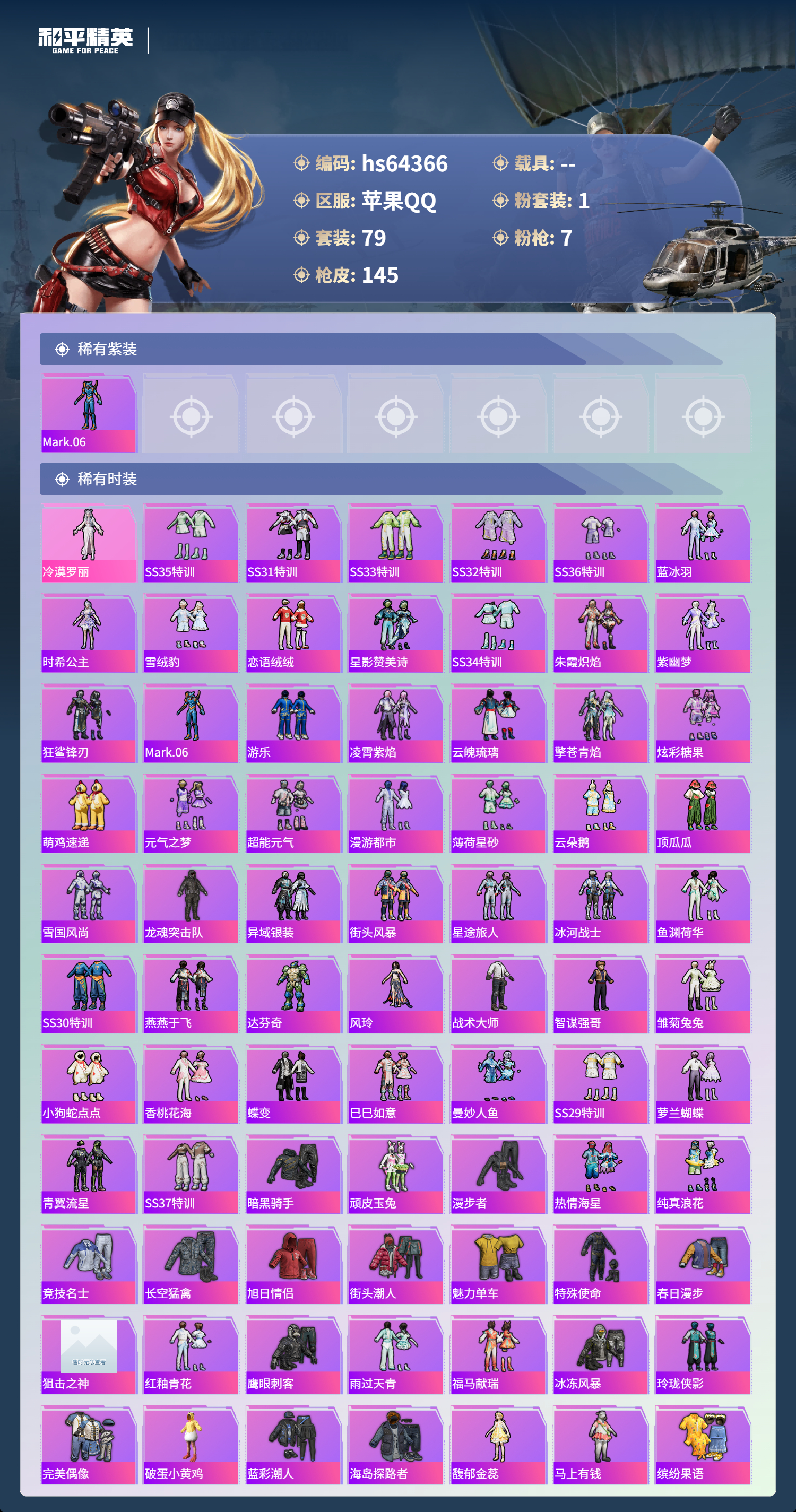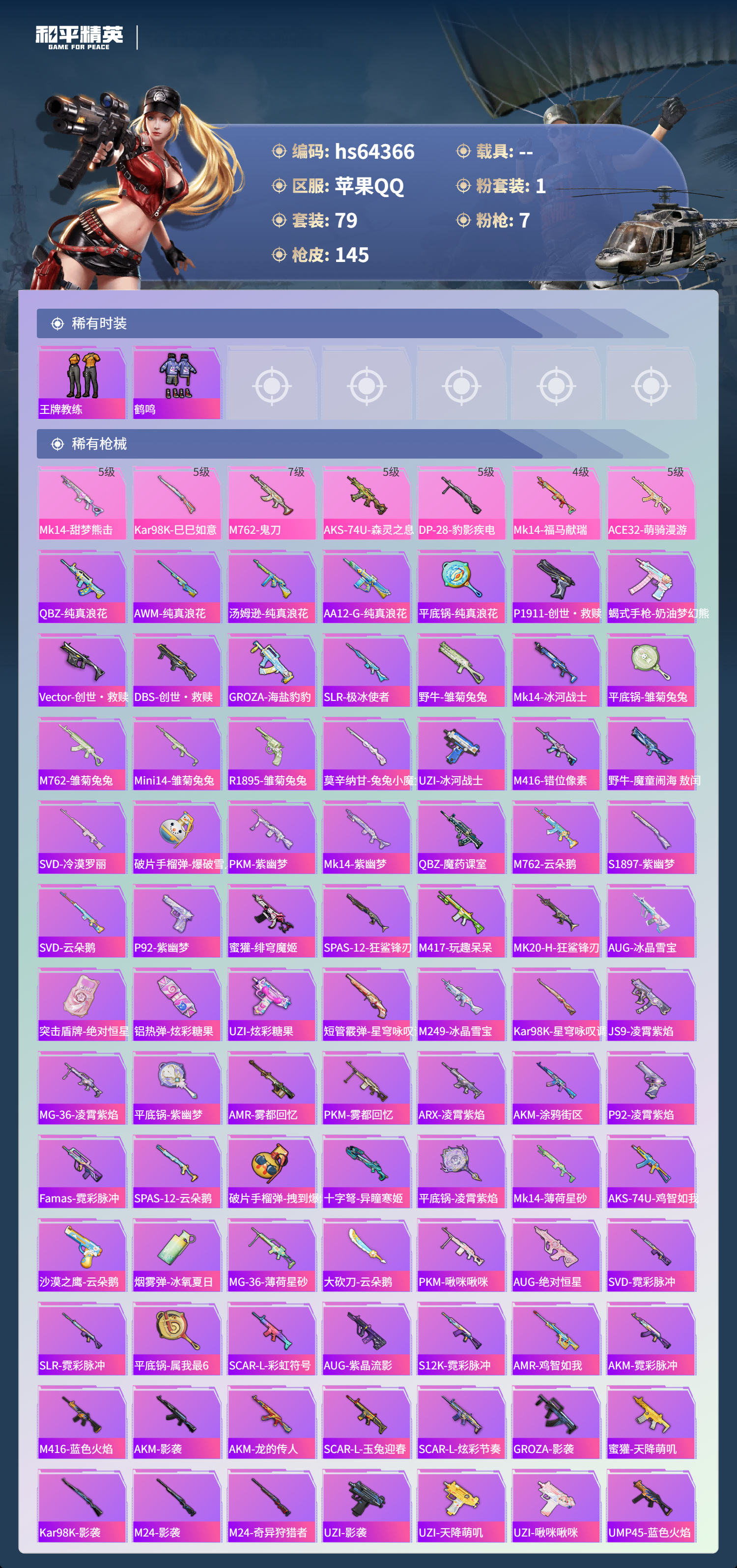 hs64366 苹果手Q-7王牌印记-1粉装-7特效枪-38565热力值-79套装-145枪皮-1卓越印记