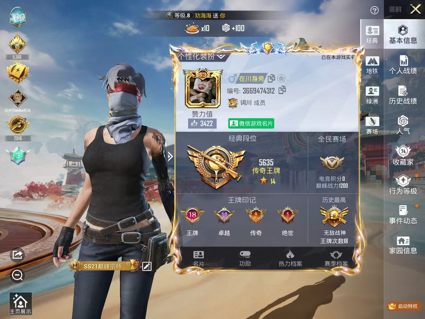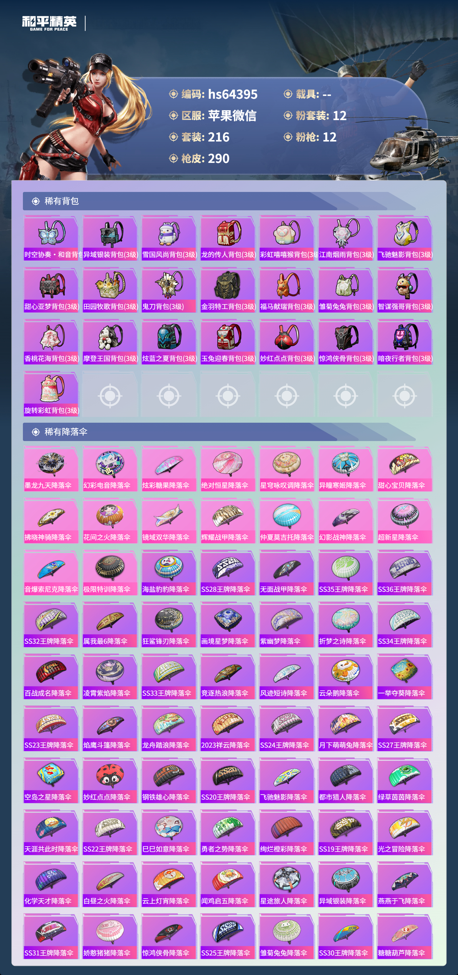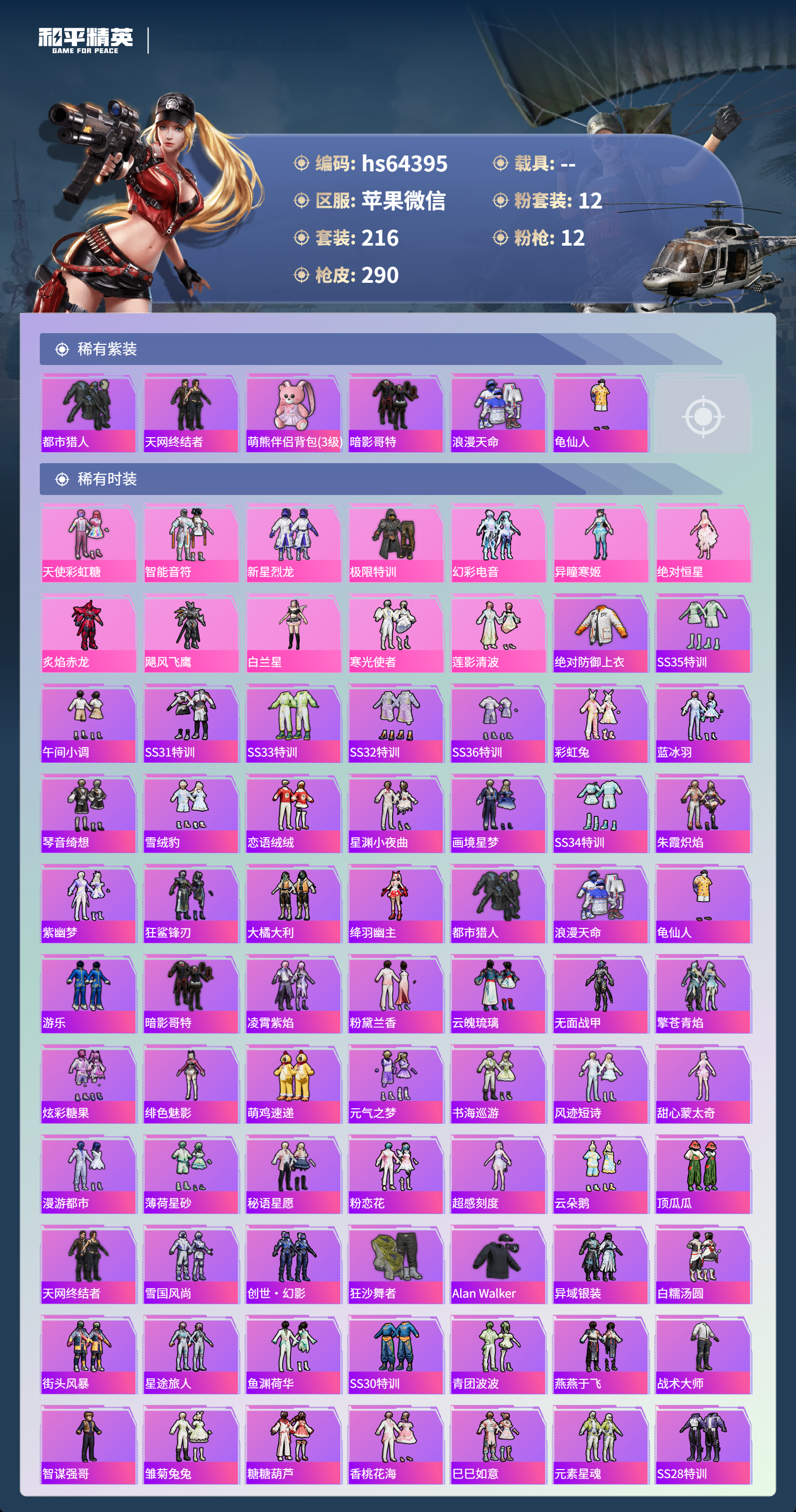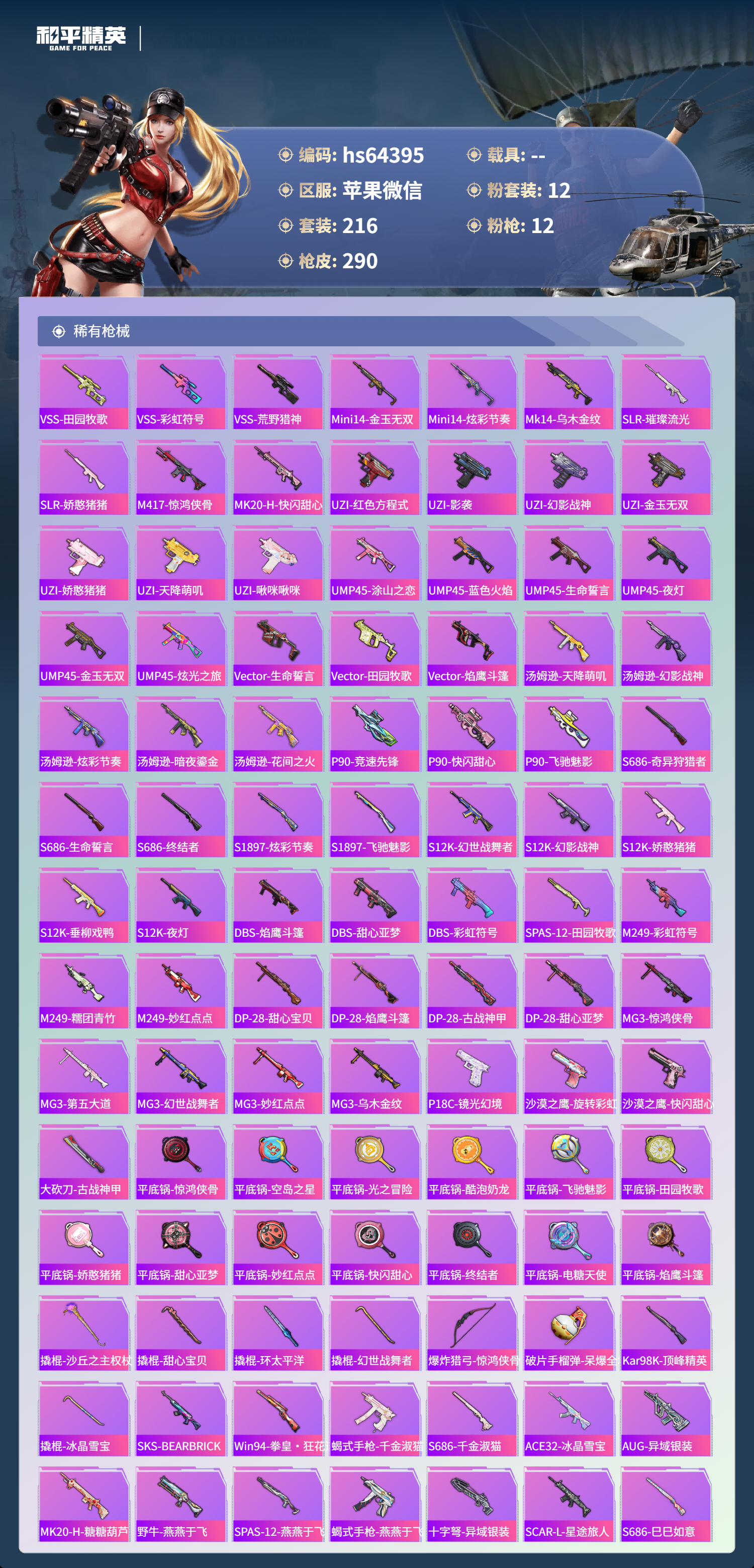hs64395 苹果微信-18王牌印记-有战神框-12粉装-12特效枪-85670热力值-216套装-290枪皮-10卓越印记-9传奇印记