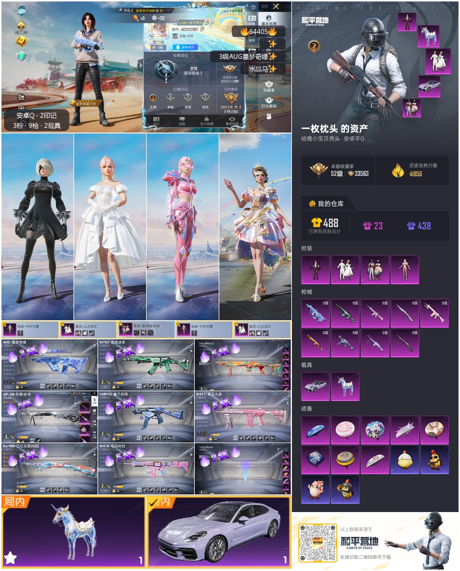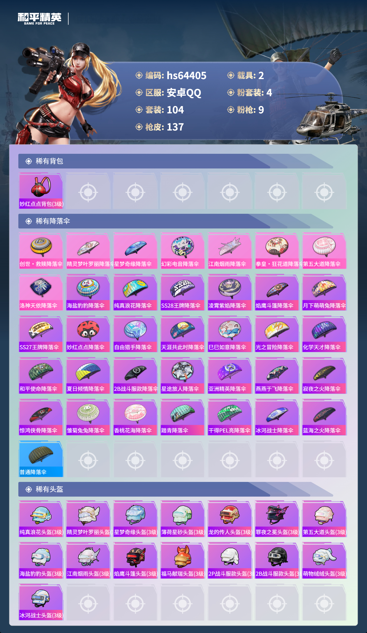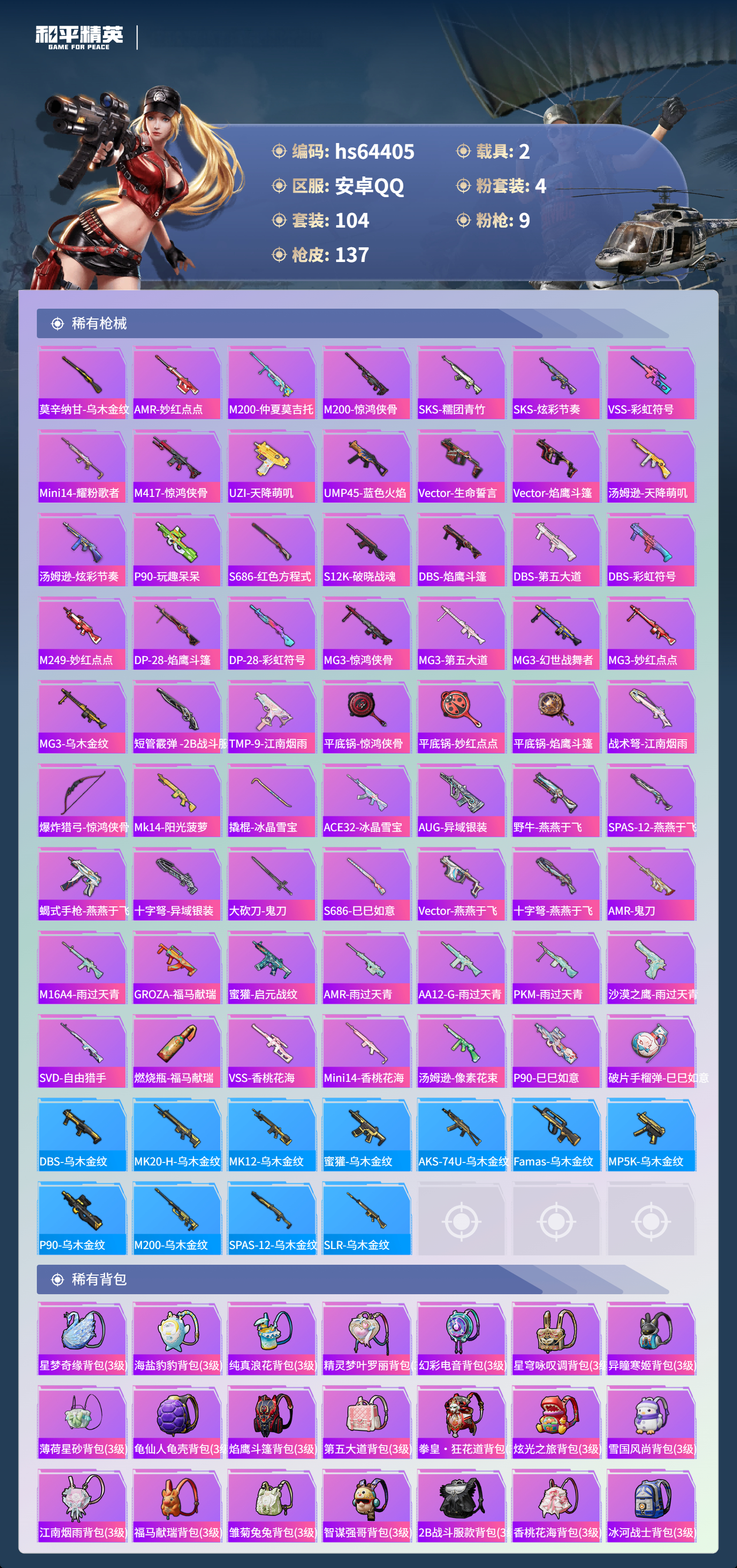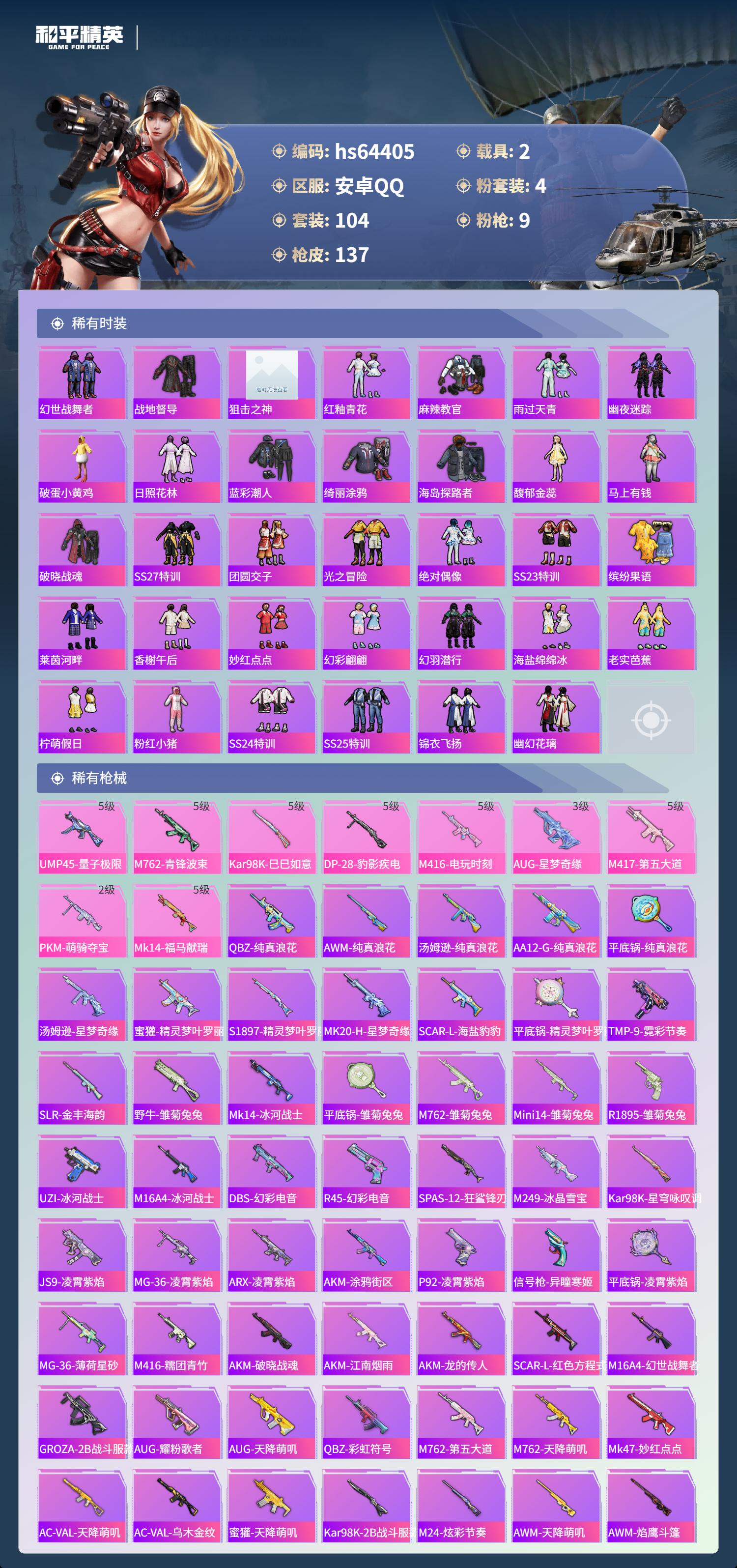 hs64405 安卓手Q-2王牌印记-4粉装-9特效枪-2载具-41856热力值-104套装-137枪皮