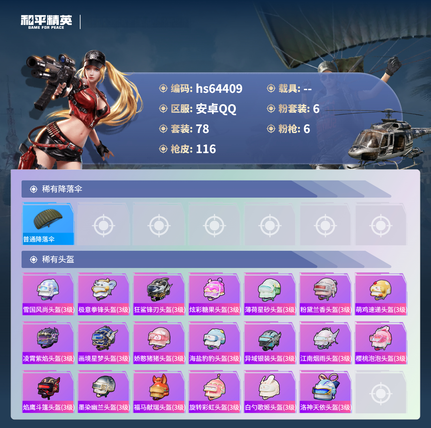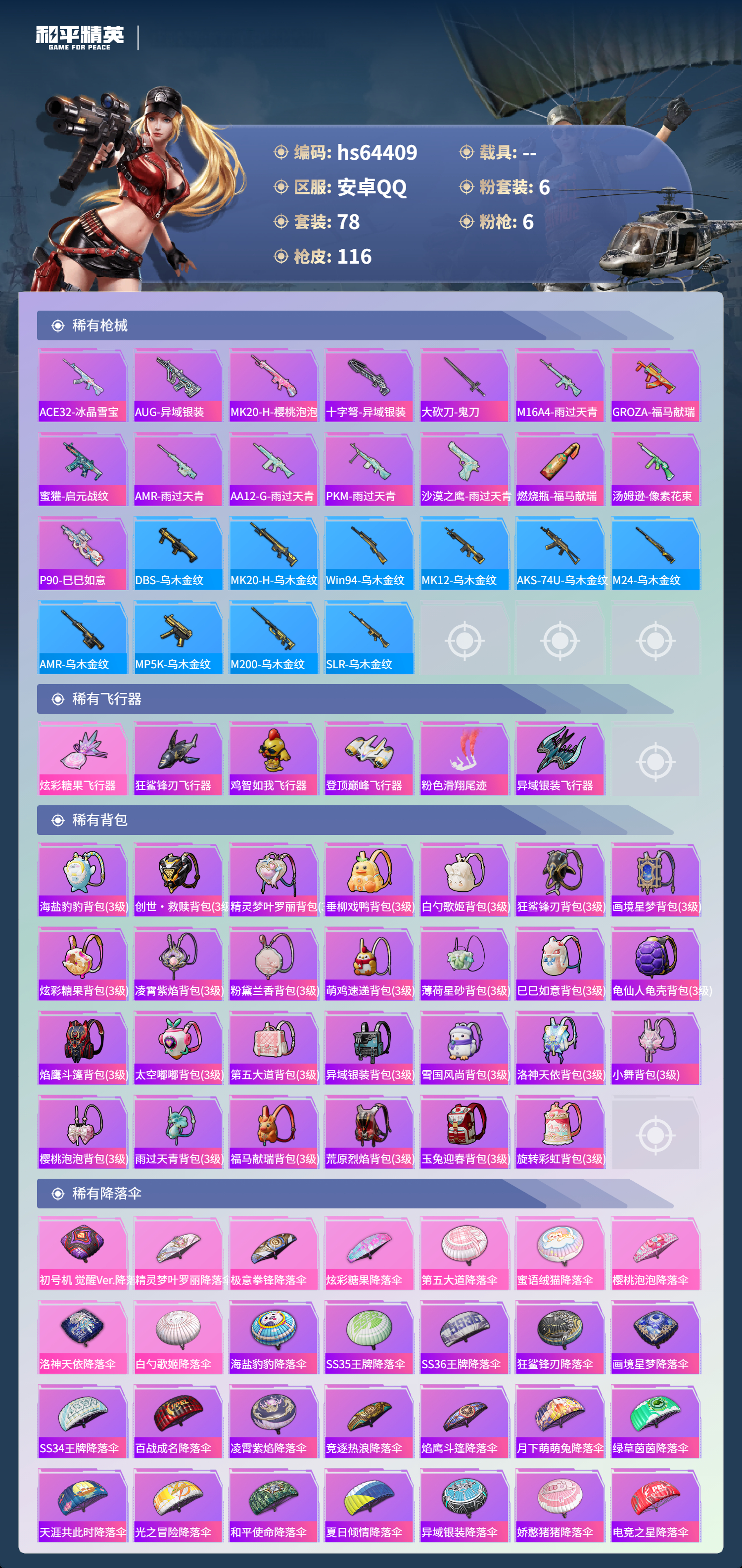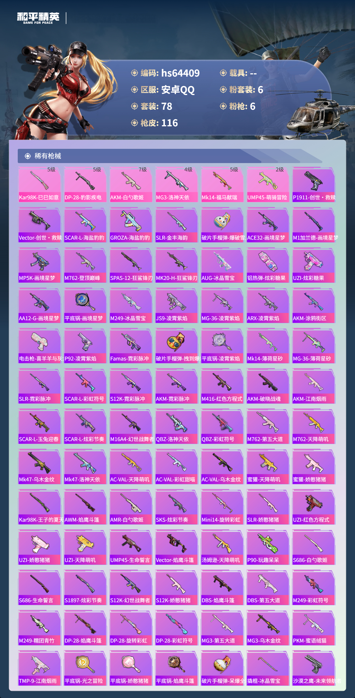 hs64409 安卓手Q-5王牌印记-6粉装-6特效枪-35539热力值-78套装-116枪皮-4卓越印记-3传奇印记