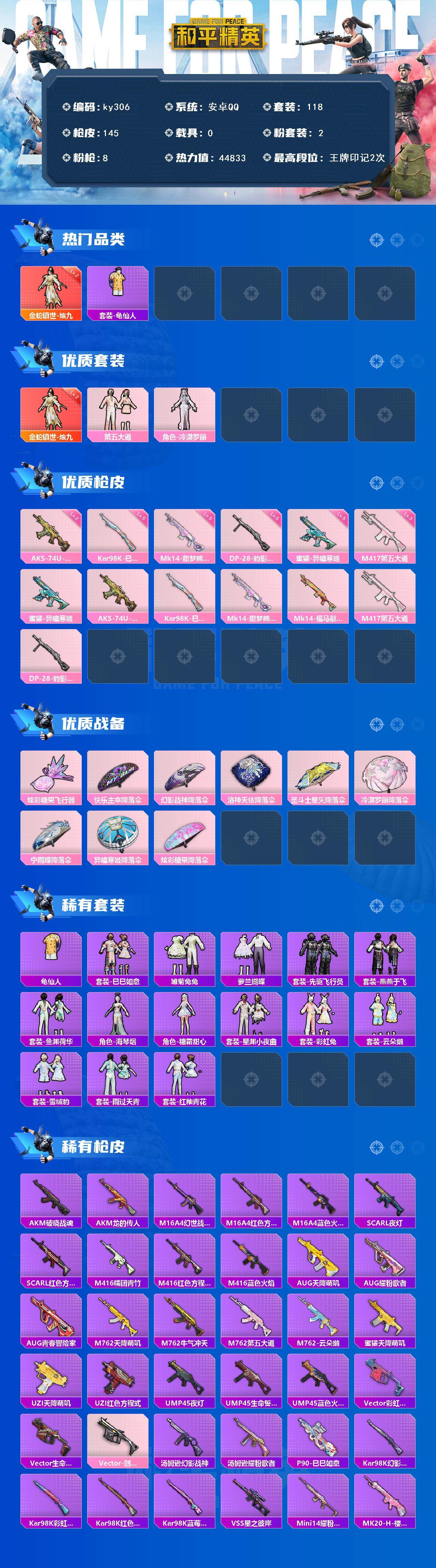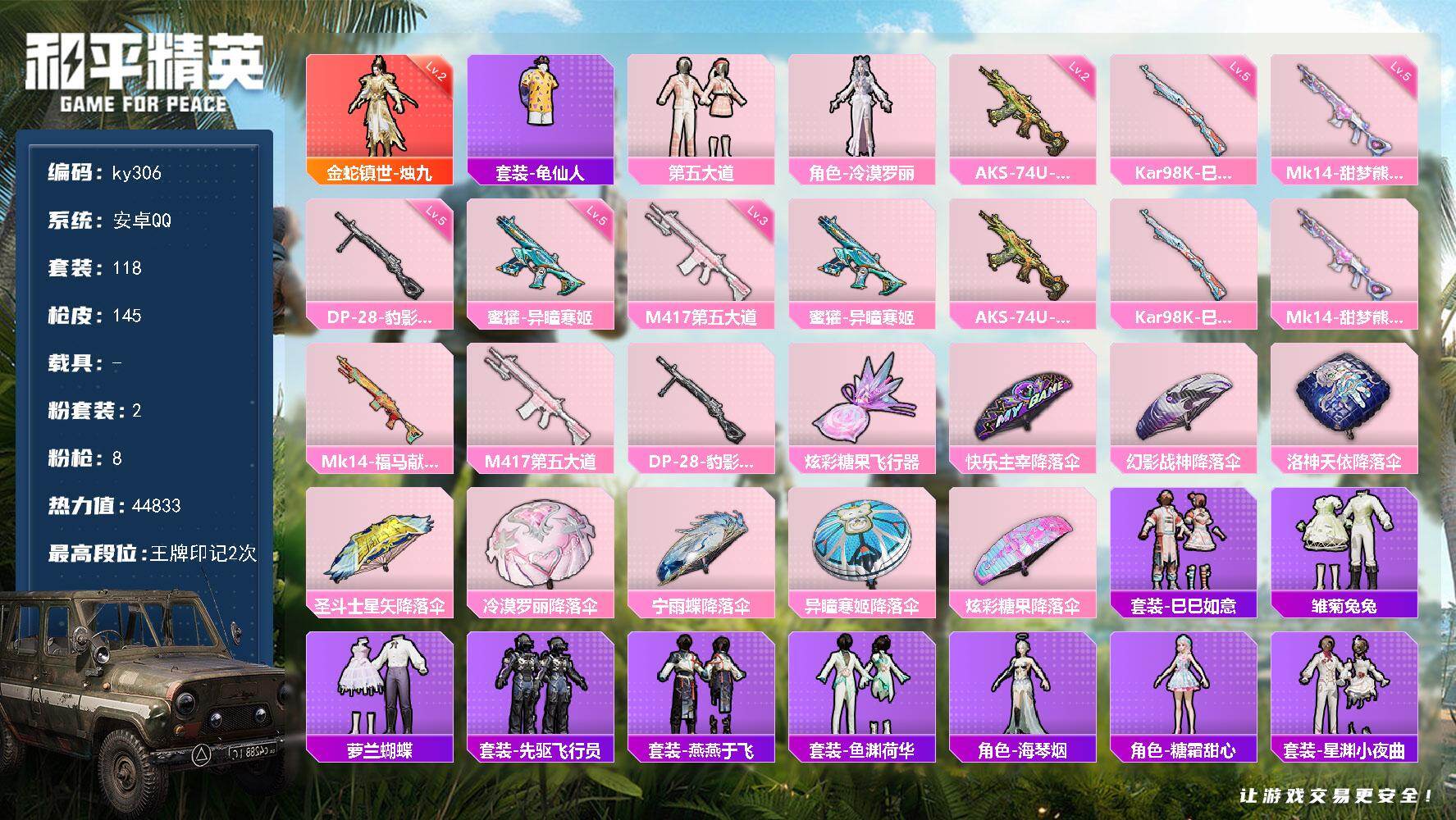 安卓 手Q-1神装-2粉装-8特效枪-0载具-1粉色飞行器-44833热力值-2王牌印记-118套装-145枪皮