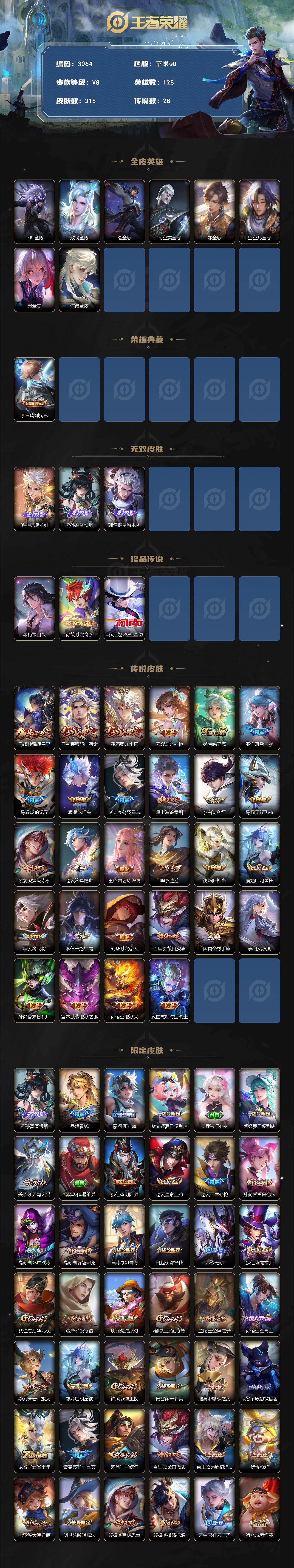 苹果Q-V8-最强王者段位-128英雄-318皮肤-1典藏皮肤-3无双-3珍品