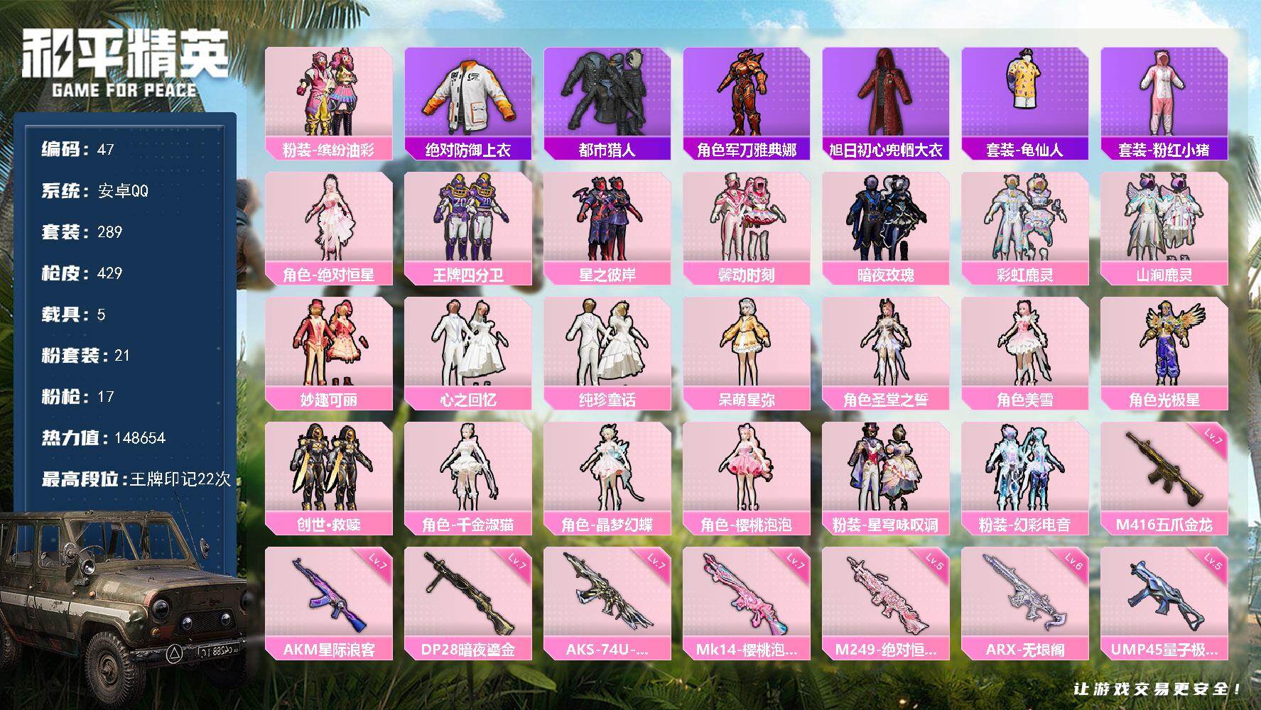 安卓 手Q-21粉装-18特效枪-5载具-8粉色飞行器-149172热力值-22王牌印记-292套装-432枪皮