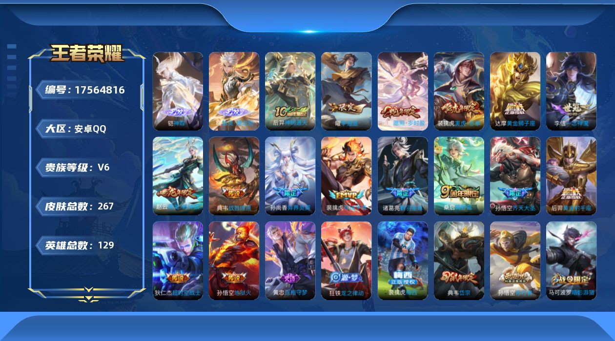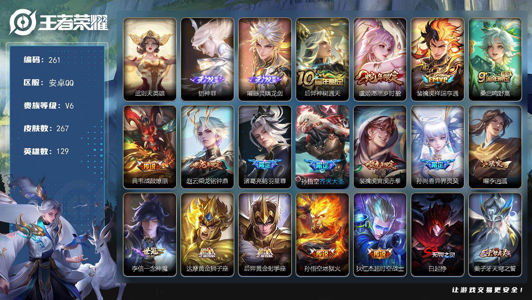【编号39320 可秒换绑】【店长推荐铠+曜高质量无双皮!qq钱包无法注销不影响游戏!!】 安卓Q-V6-尊贵铂金IV段位-129英雄-267皮肤-1典藏英雄-2无双-16传说-69史诗【英雄全皮】:孙权全皮,敖隐全皮【荣耀典藏】:武则天英雄【无双皮肤】:铠神罪,曜器灵螭龙剑【传说皮肤】:后羿神树通天,虞姬愿照岁时盈,裴擒虎祥瑞亨通,桑启鸣野蒿,典韦战鼓燎原,赵云乘龙铭钟鼎,诸葛亮鹤羽星尊,孙悟空齐天大圣,裴擒虎寅虎赤拳,孙尚香异界灵契,曜李逍遥 ,李信一念神魔,达摩黄金狮子座,后羿黄金射手座,