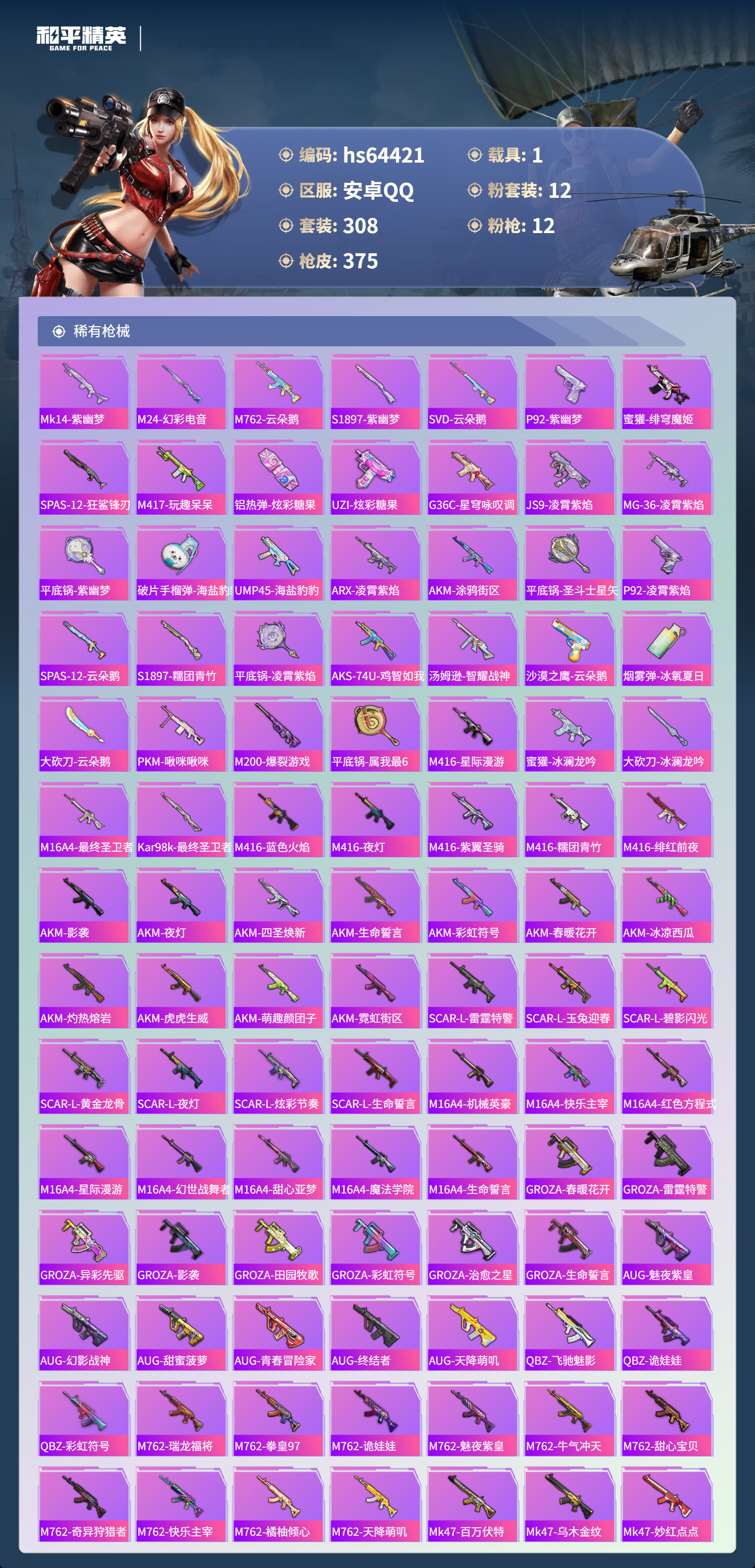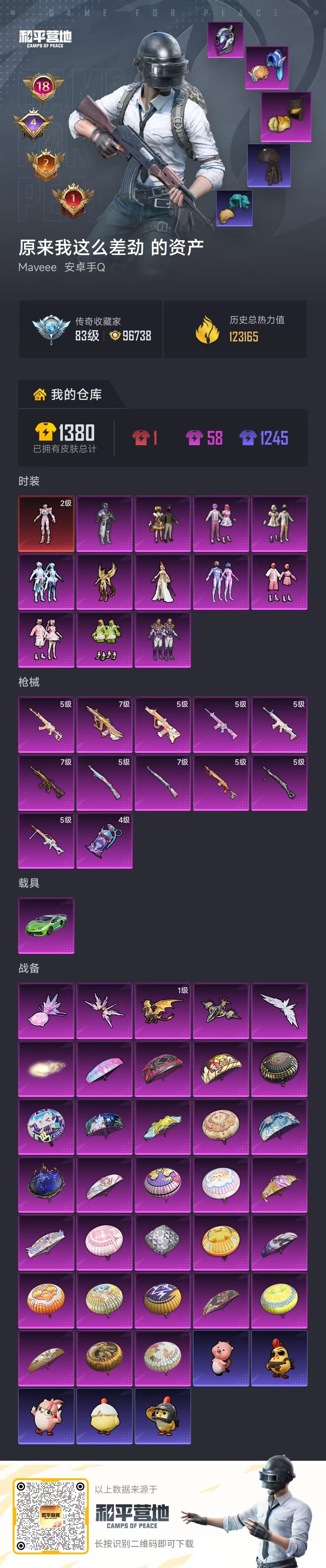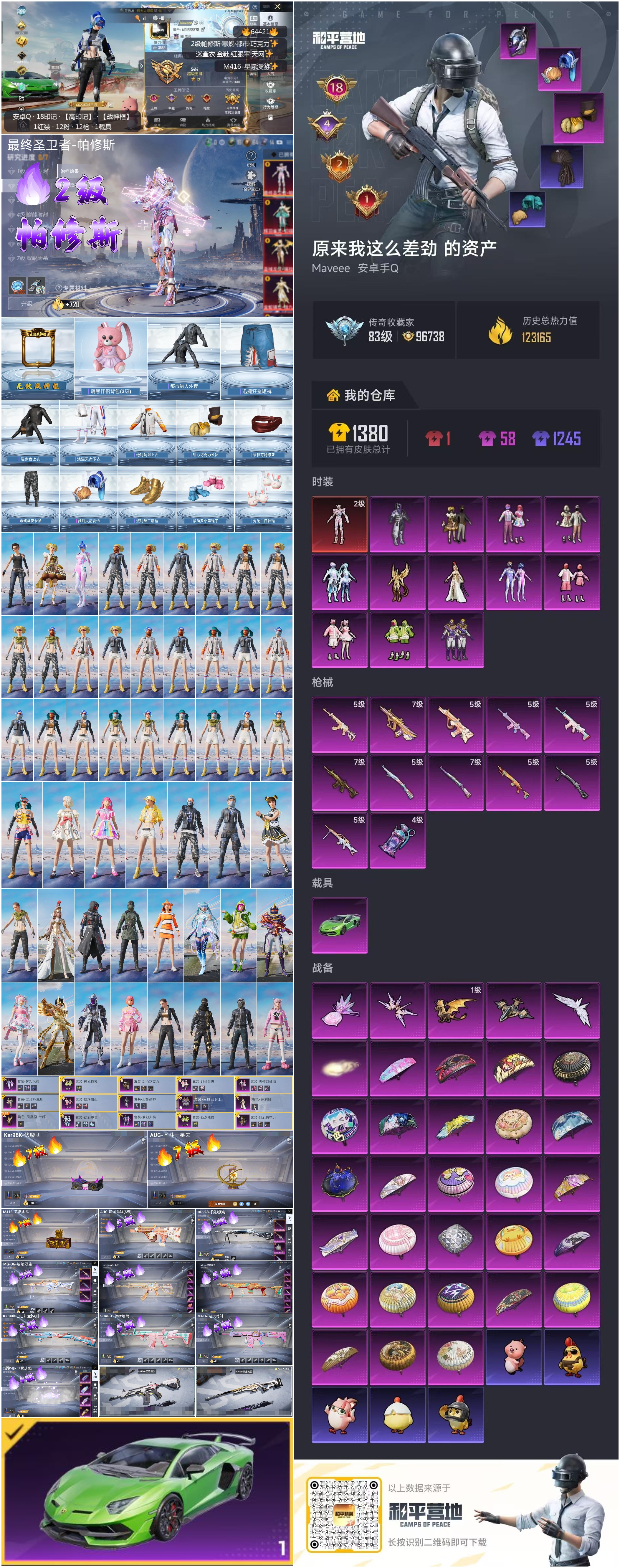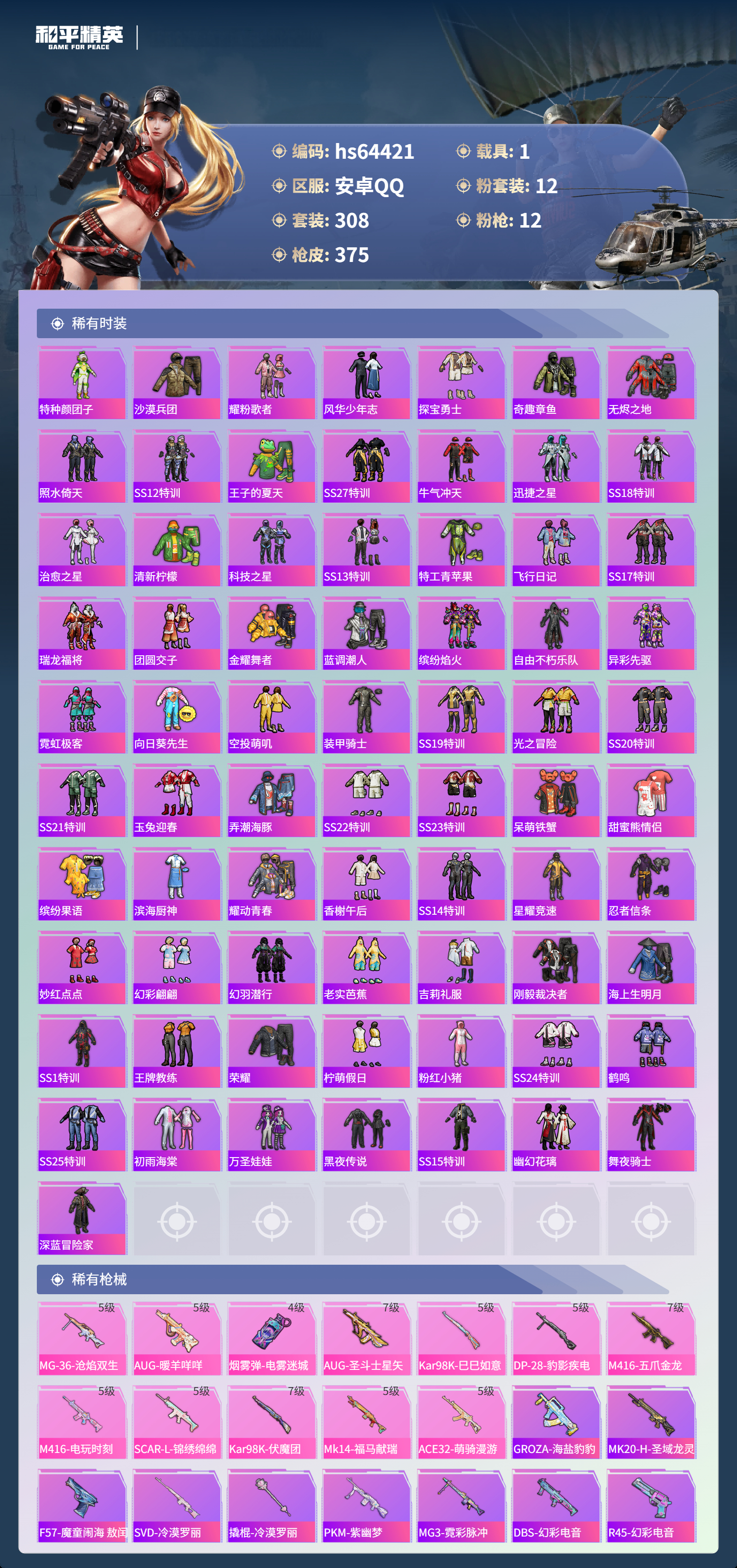 hs64421 安卓手Q-18王牌印记-有战神框-1红装-12粉装-12特效枪-1载具-热力值-308套装-375枪皮-4卓越印记-2传奇印记