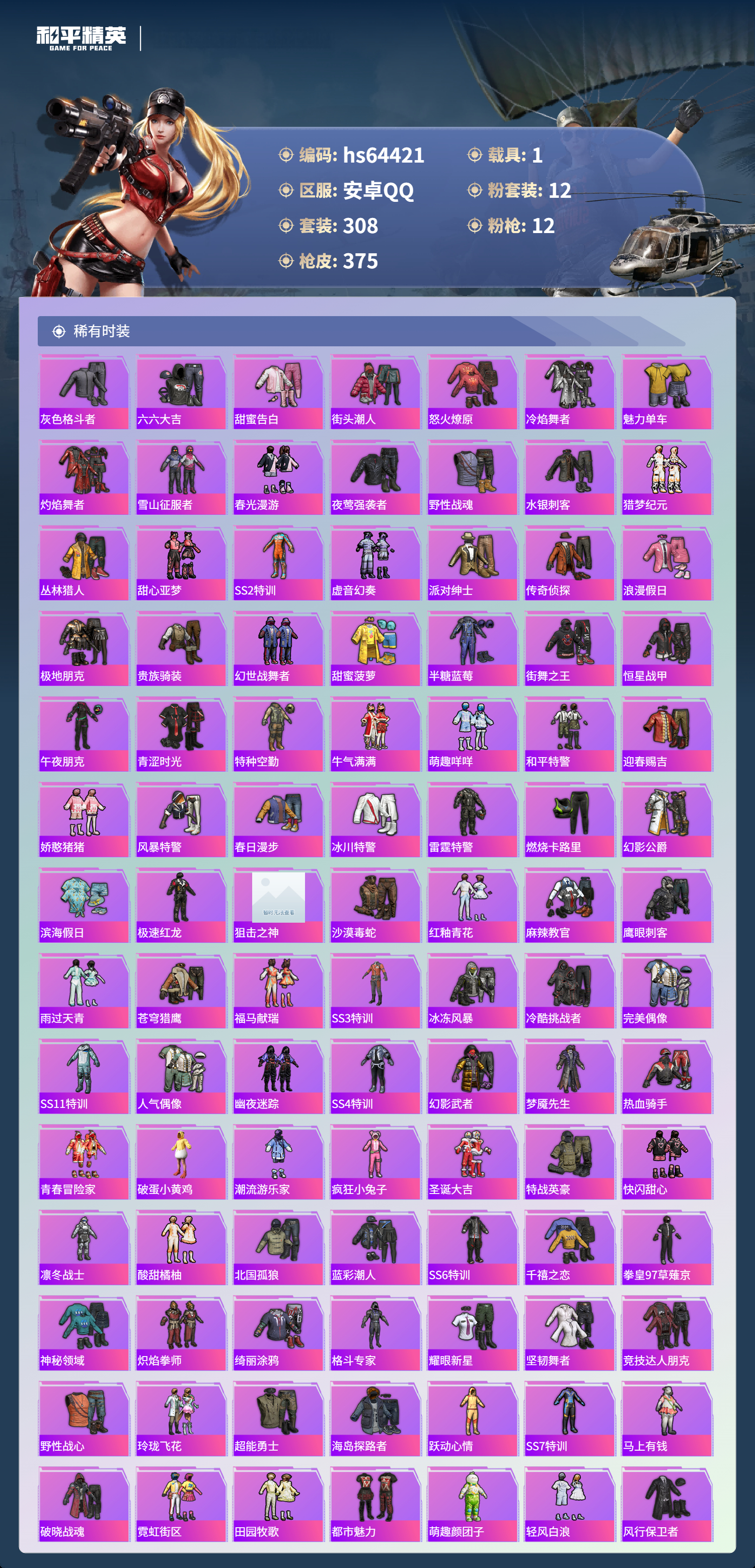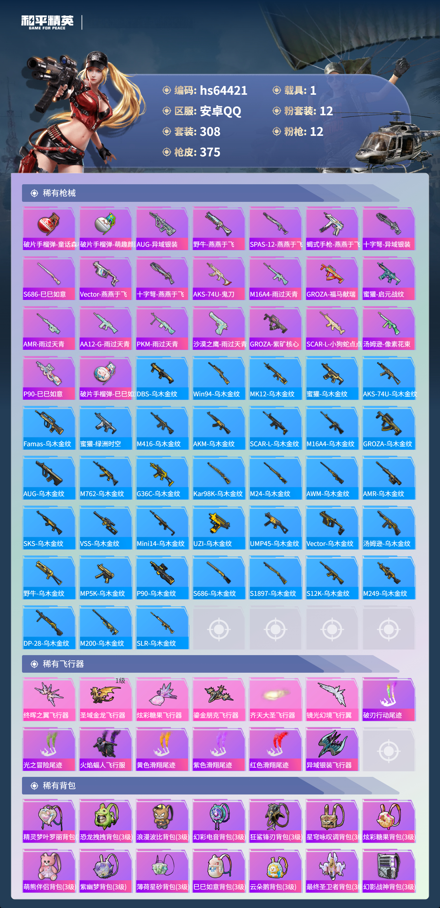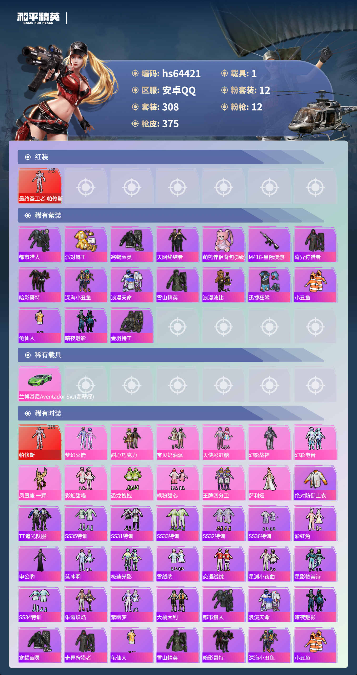 hs64421 安卓手Q-18王牌印记-有战神框-1红装-12粉装-12特效枪-1载具-热力值-308套装-375枪皮-4卓越印记-2传奇印记