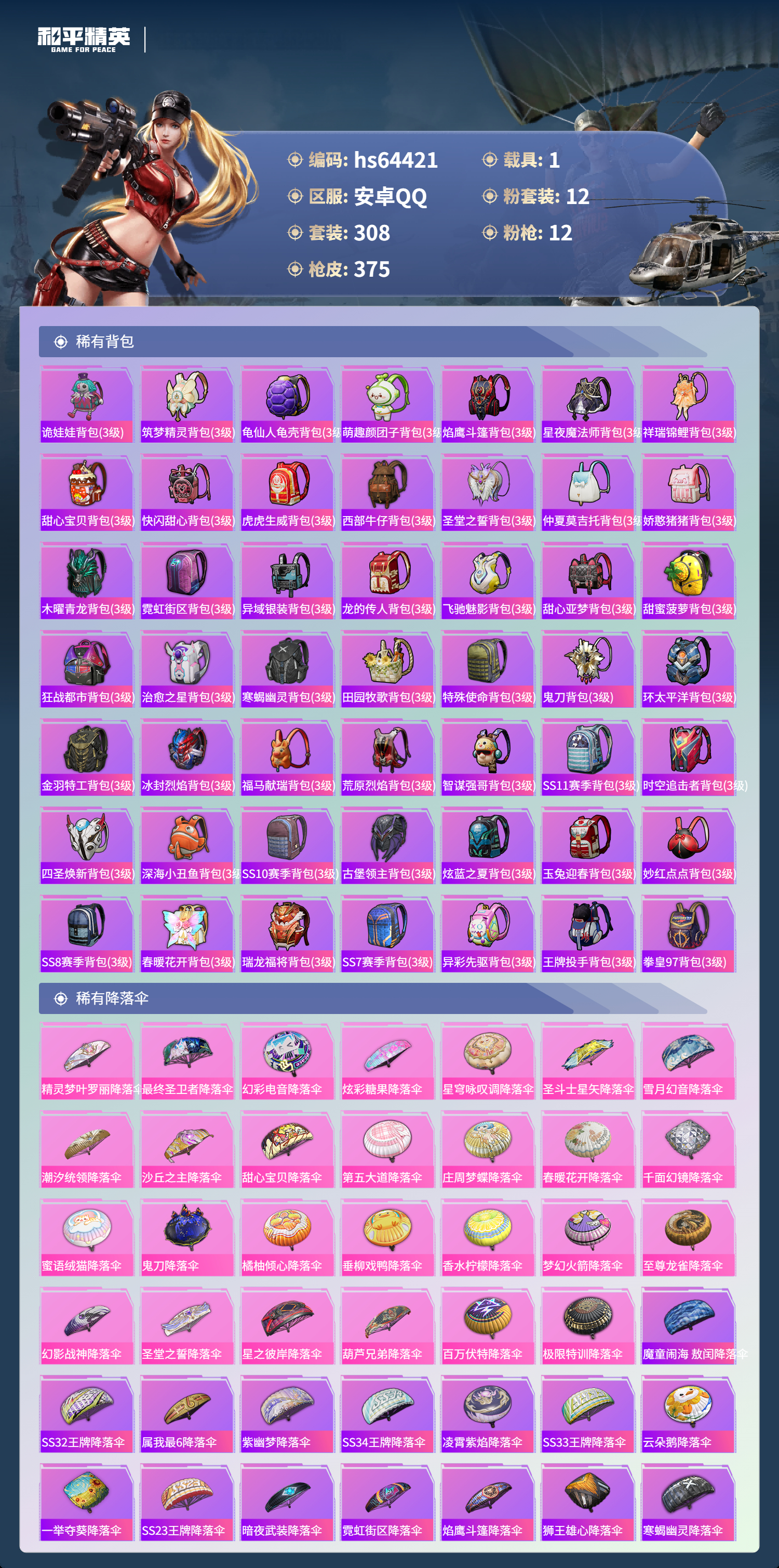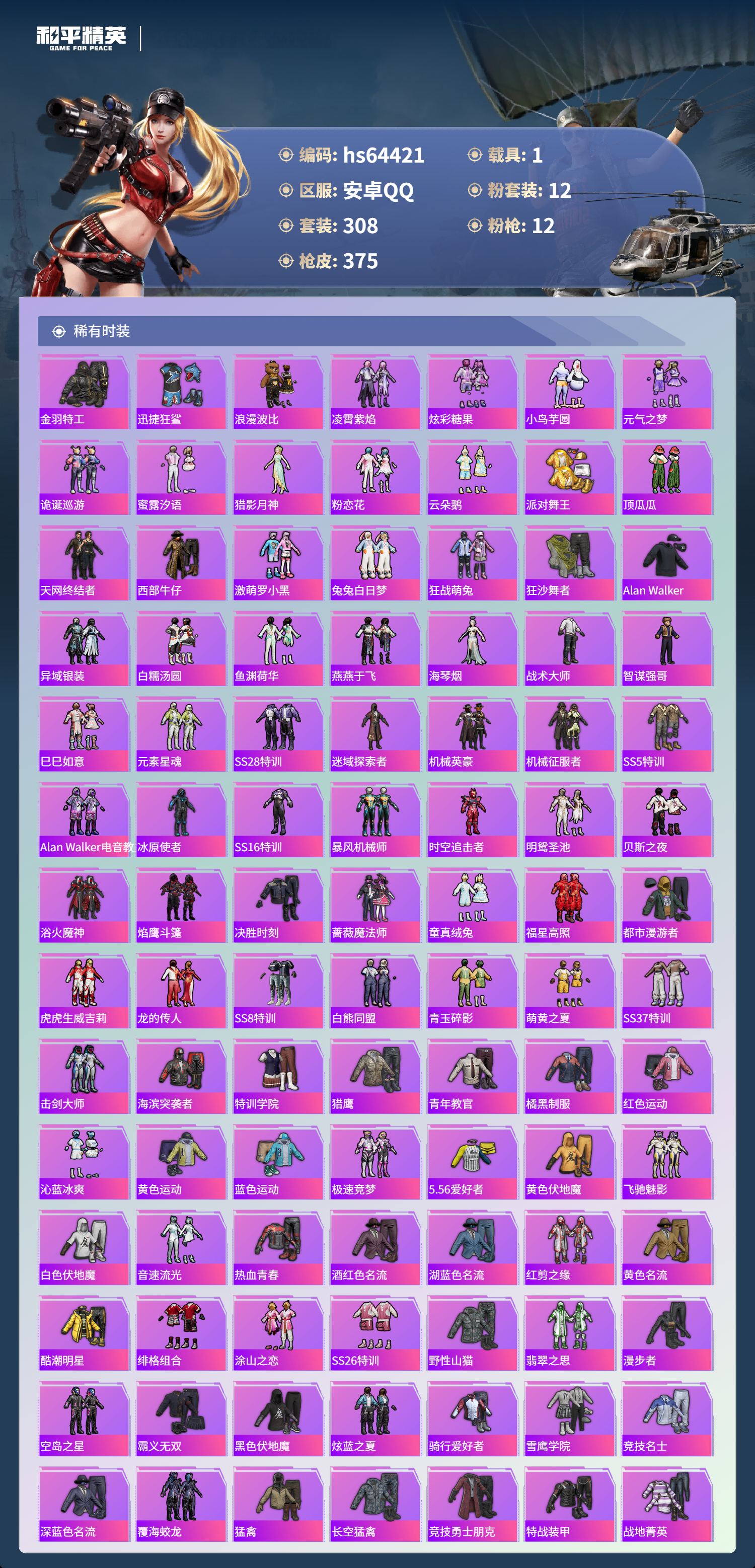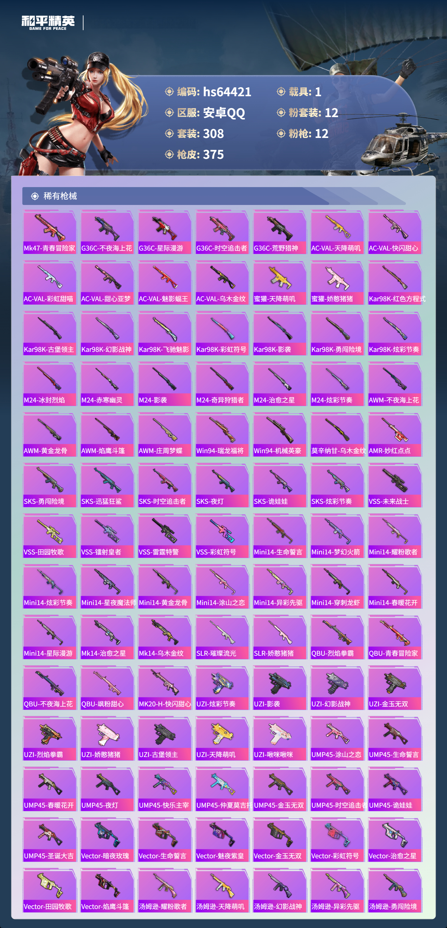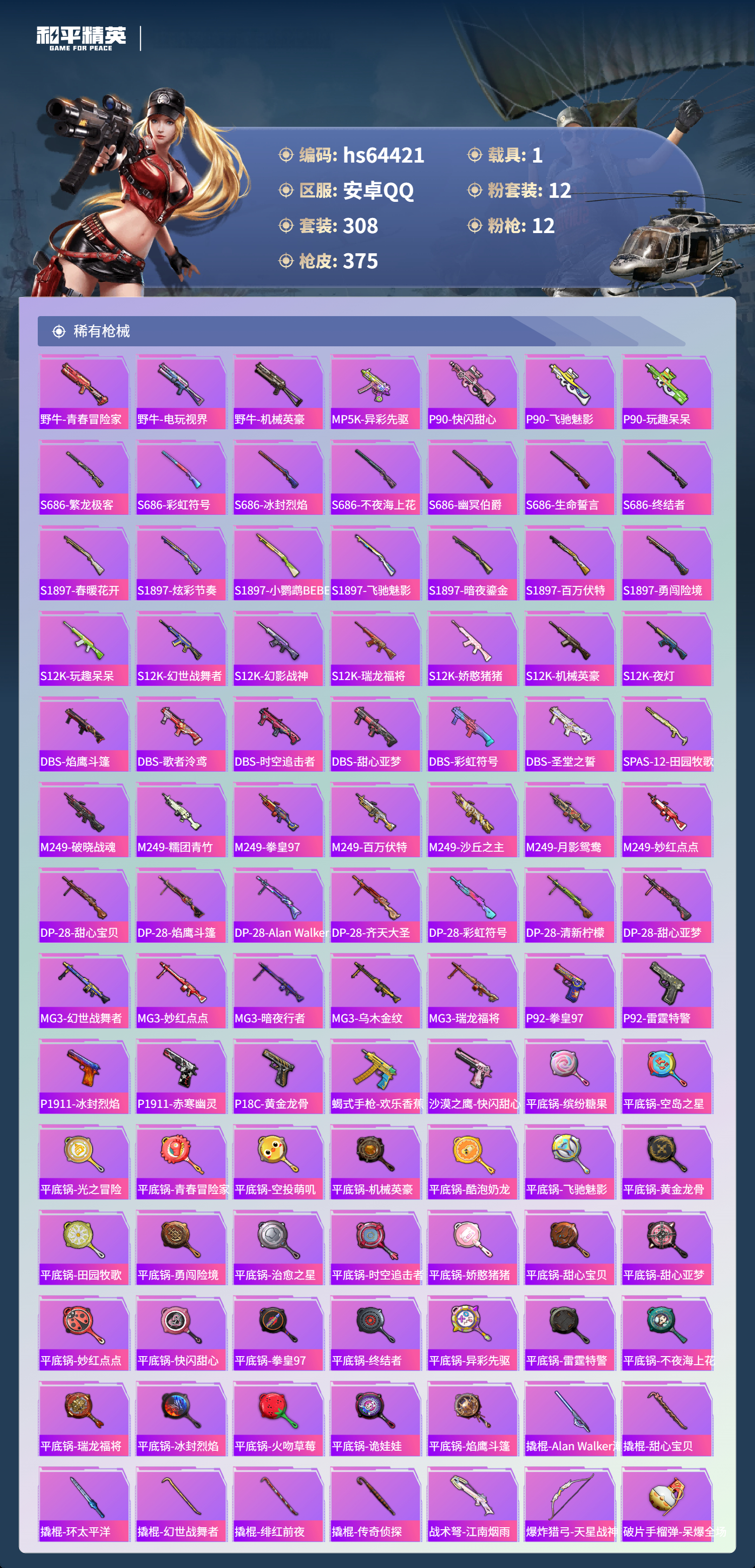hs64421 安卓手Q-18王牌印记-有战神框-1红装-12粉装-12特效枪-1载具-热力值-308套装-375枪皮-4卓越印记-2传奇印记