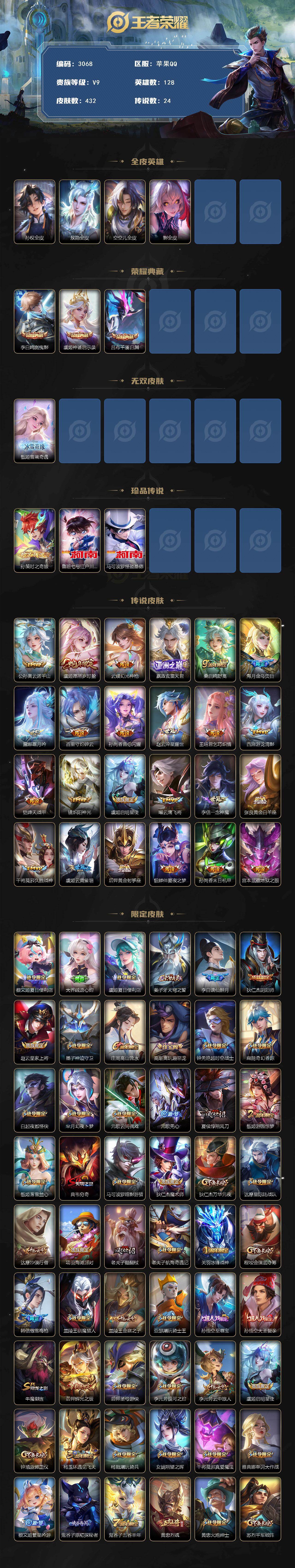 苹果Q-V9-永恒钻石IV段位-128英雄-432皮肤-3典藏皮肤-1无双-3珍品传说-24传说-129史诗