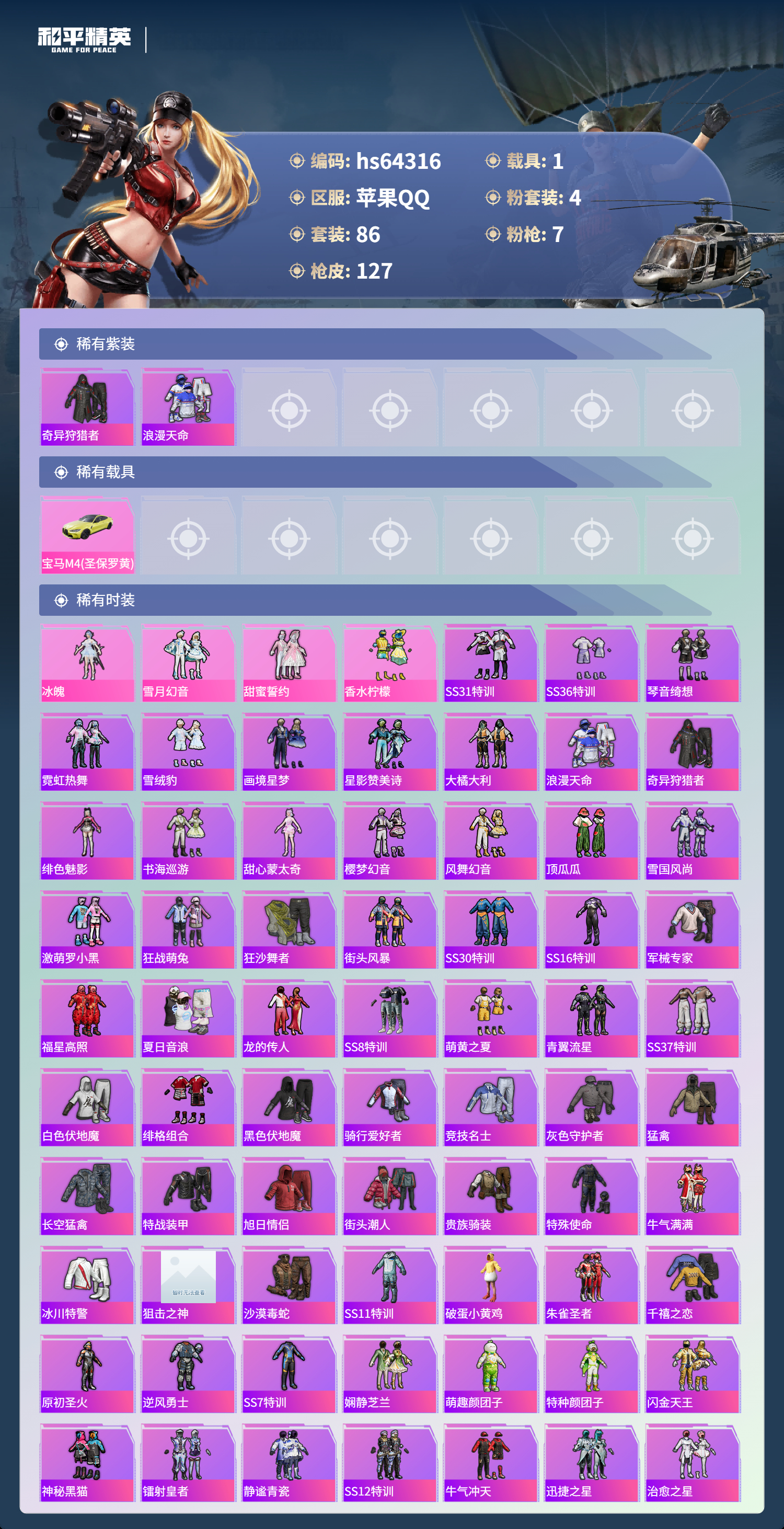 hs64316 苹果手Q-3王牌印记-4粉装-7特效枪-1载具-43278热力值-86套装-127枪皮-1卓越印记-1传奇印记