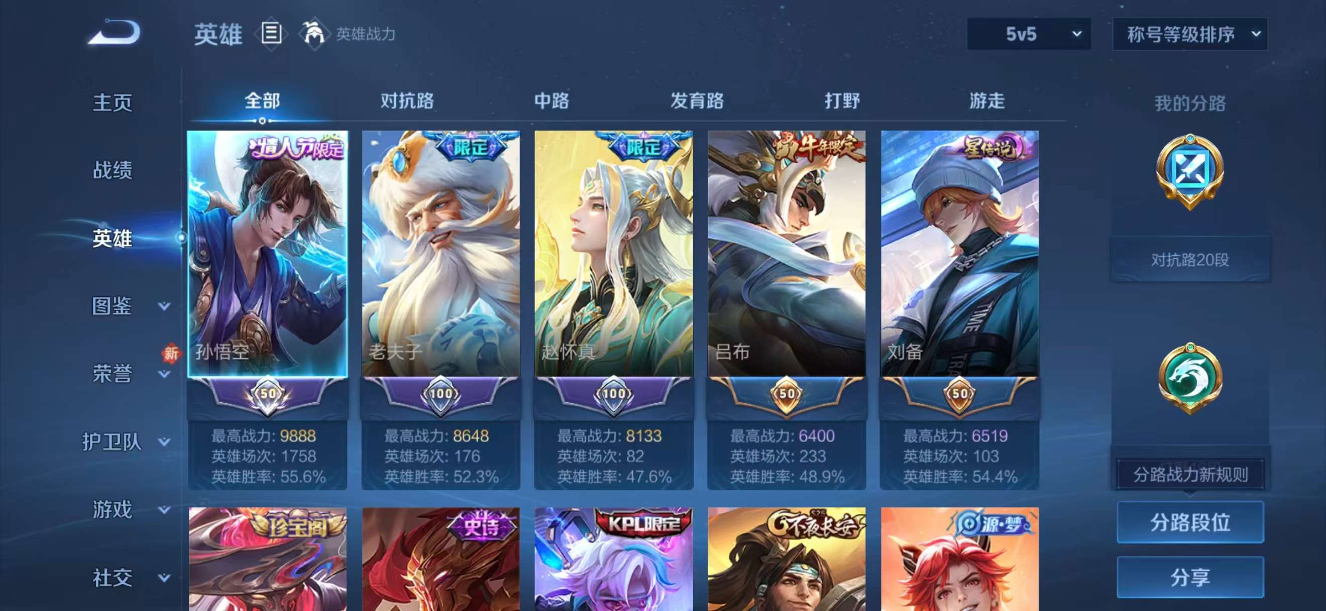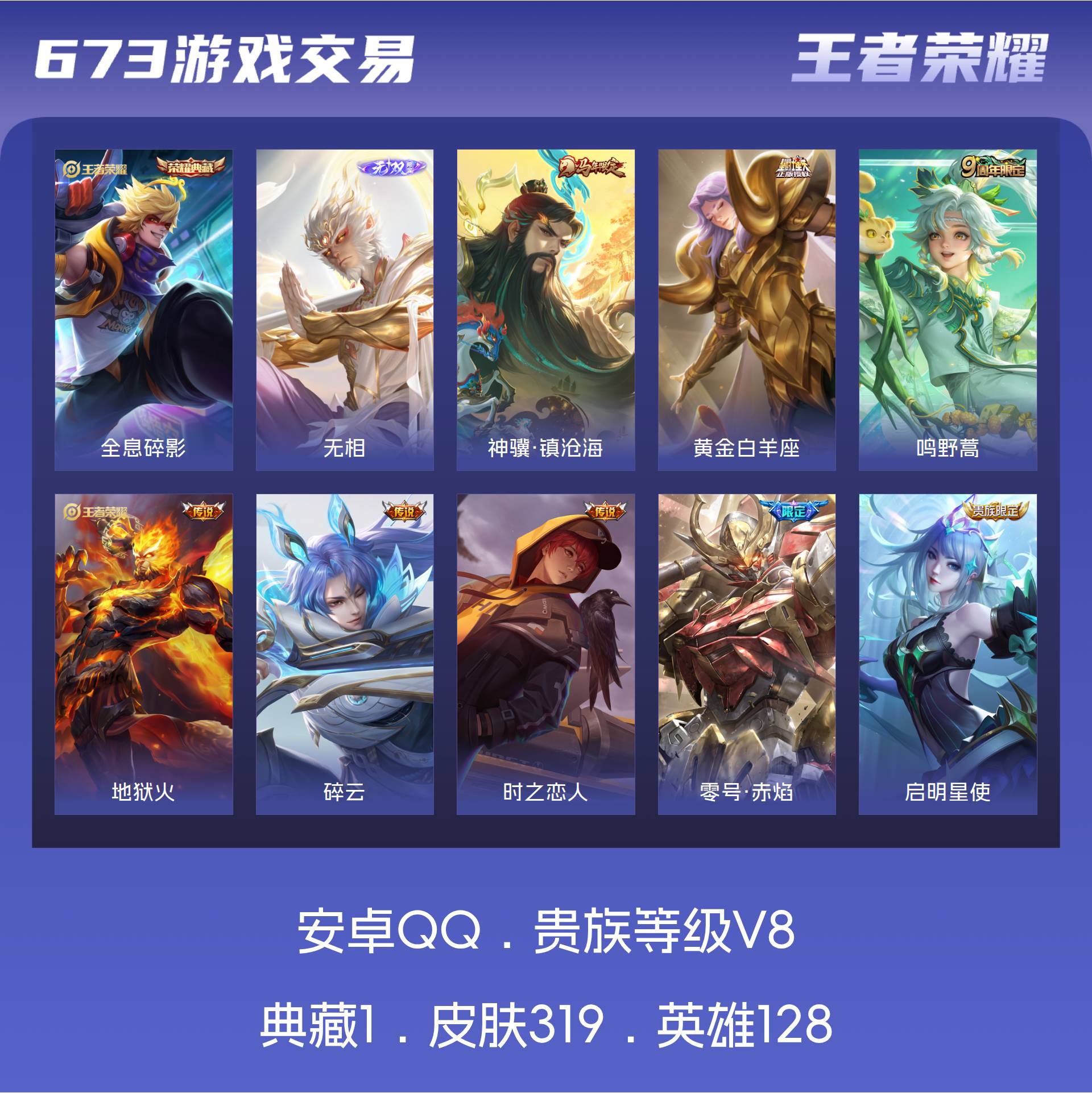安卓QQ/传奇王者/319皮肤/128英雄/1典藏/0珍品无双/1无双/0珍品传说/18传说/102