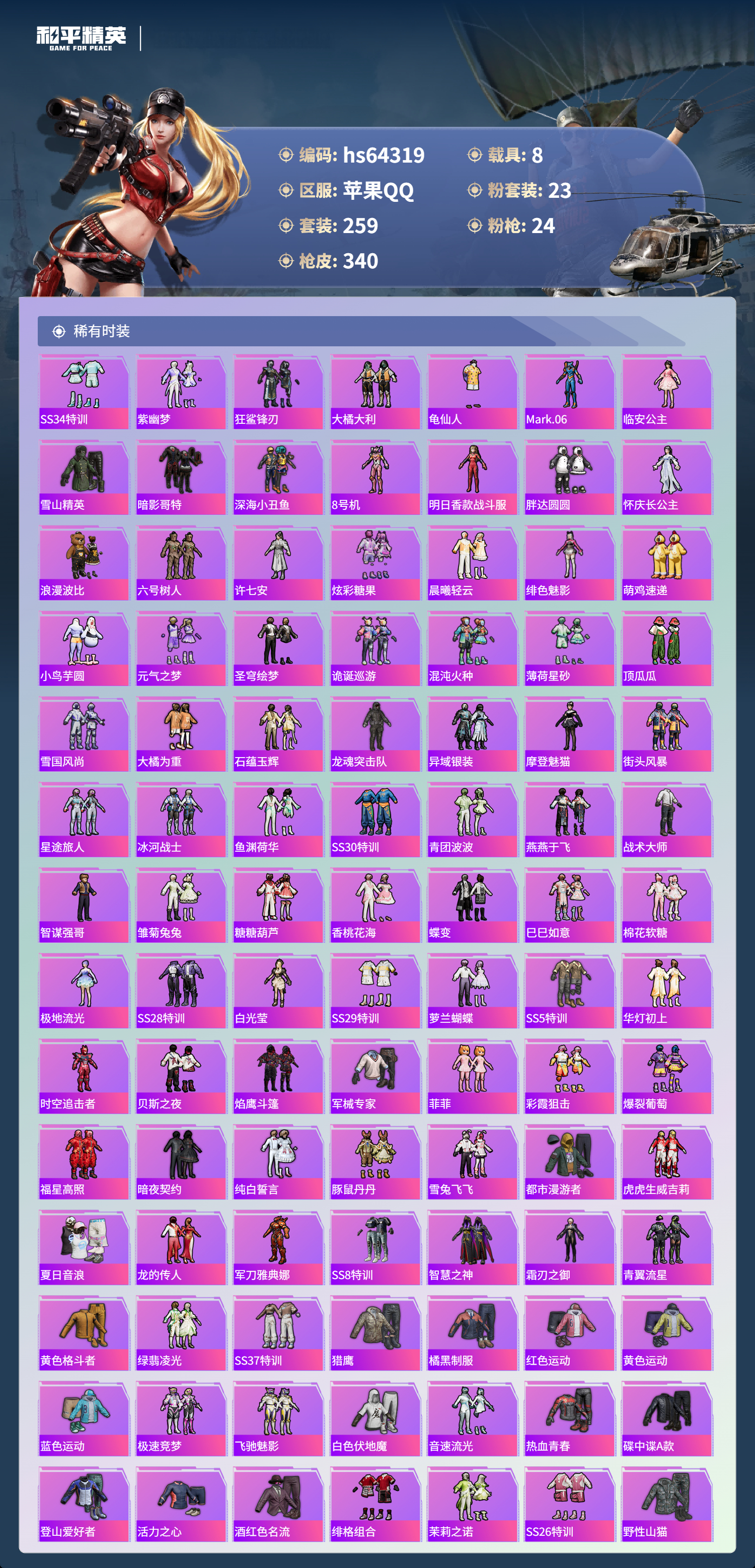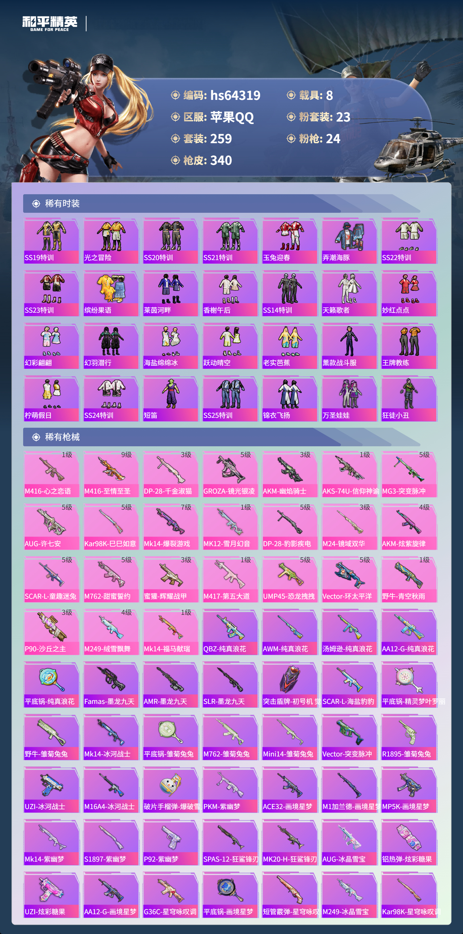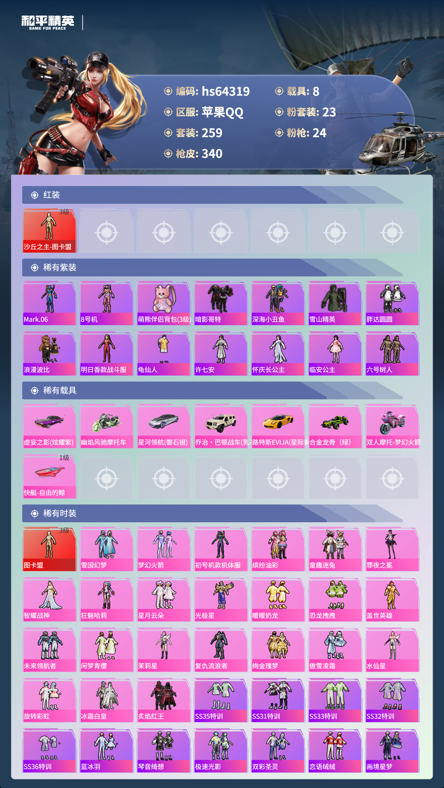 hs64319 苹果手Q-18王牌印记-1红装-23粉装-24特效枪-8载具-热力值-259套装-340枪皮-4卓越印记-2传奇印记
