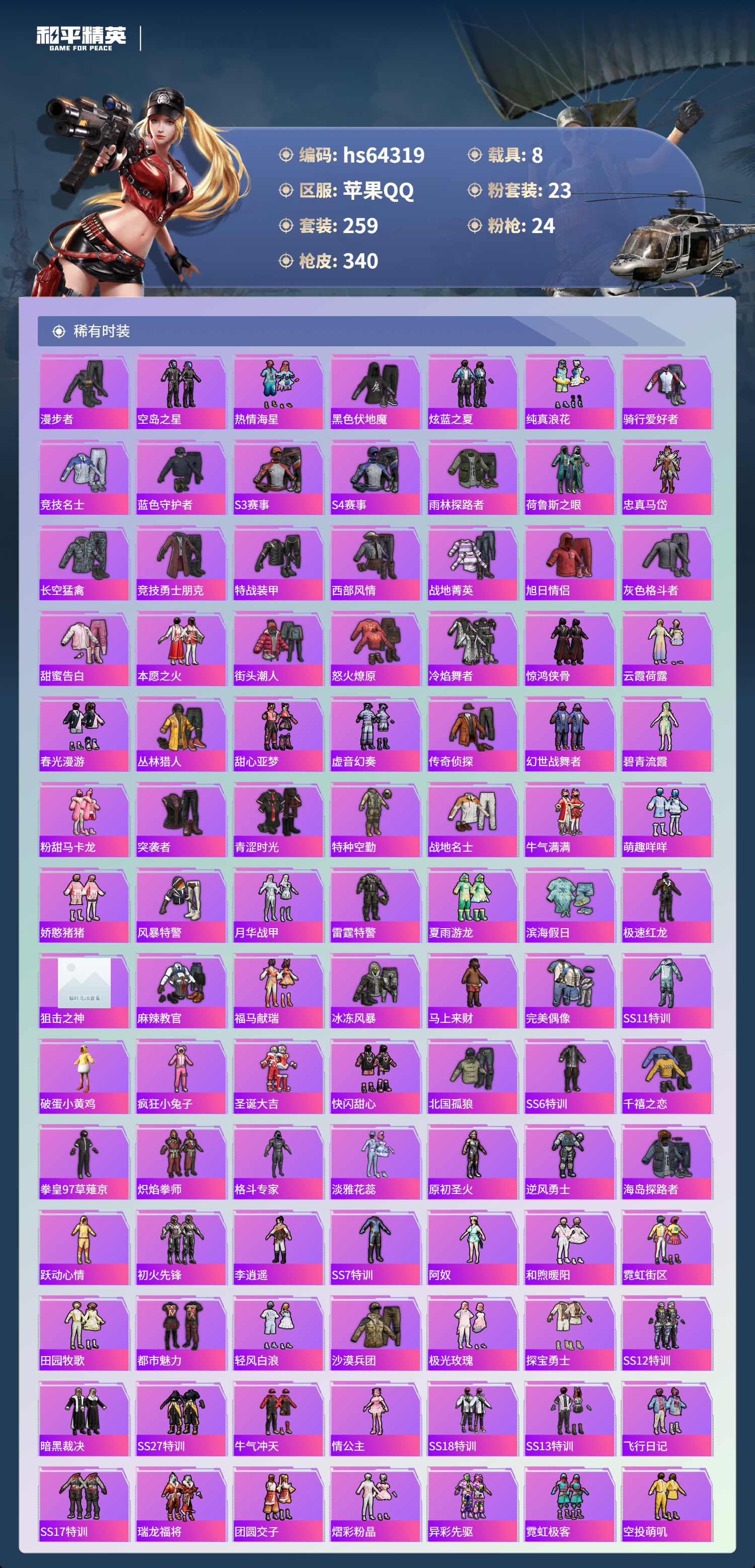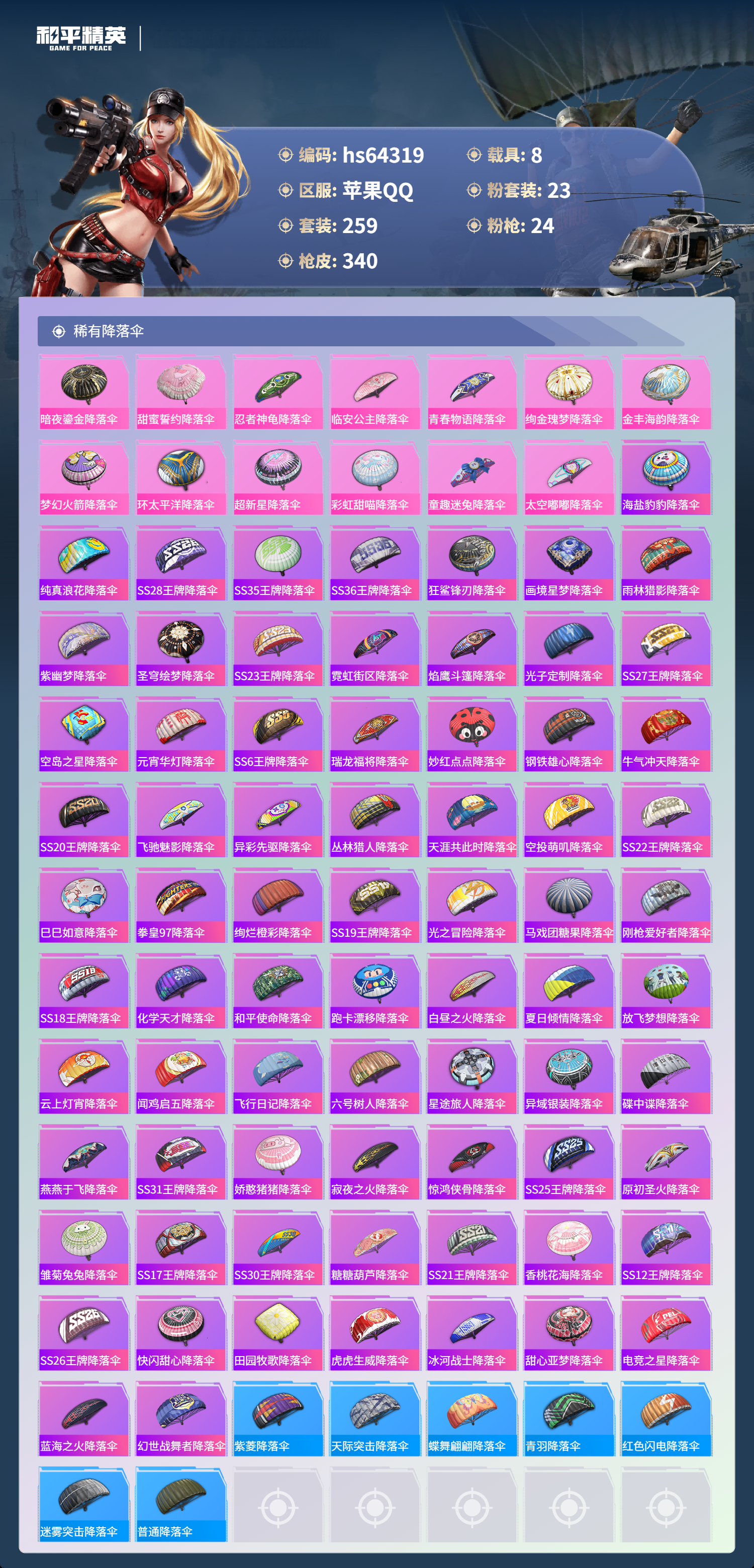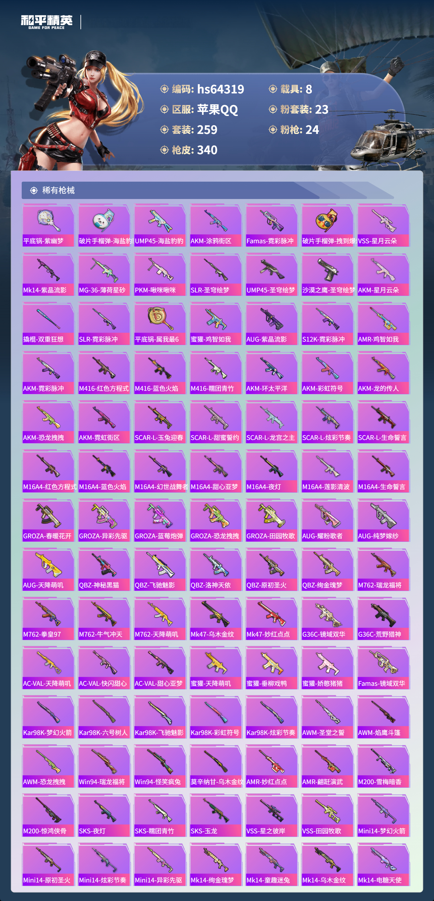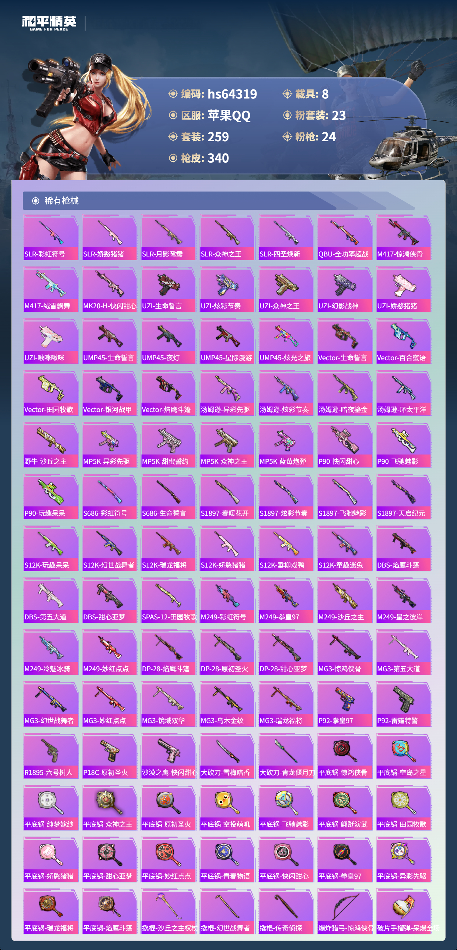 hs64319 苹果手Q-18王牌印记-1红装-23粉装-24特效枪-8载具-热力值-259套装-340枪皮-4卓越印记-2传奇印记