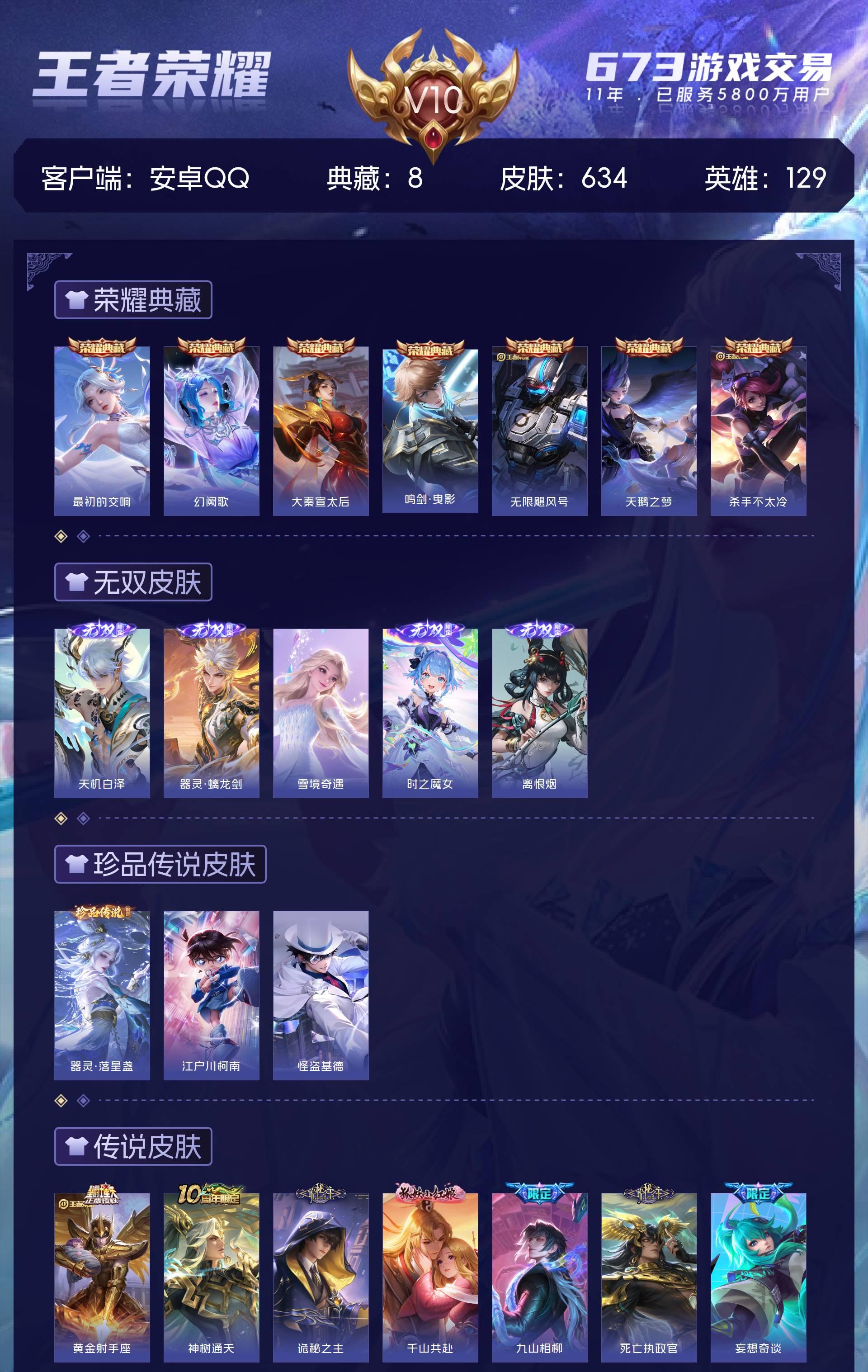 安卓QQ/荣耀王者/634皮肤/129英雄/7典藏/0珍品无双/5无双/3珍品传说/99传说/212