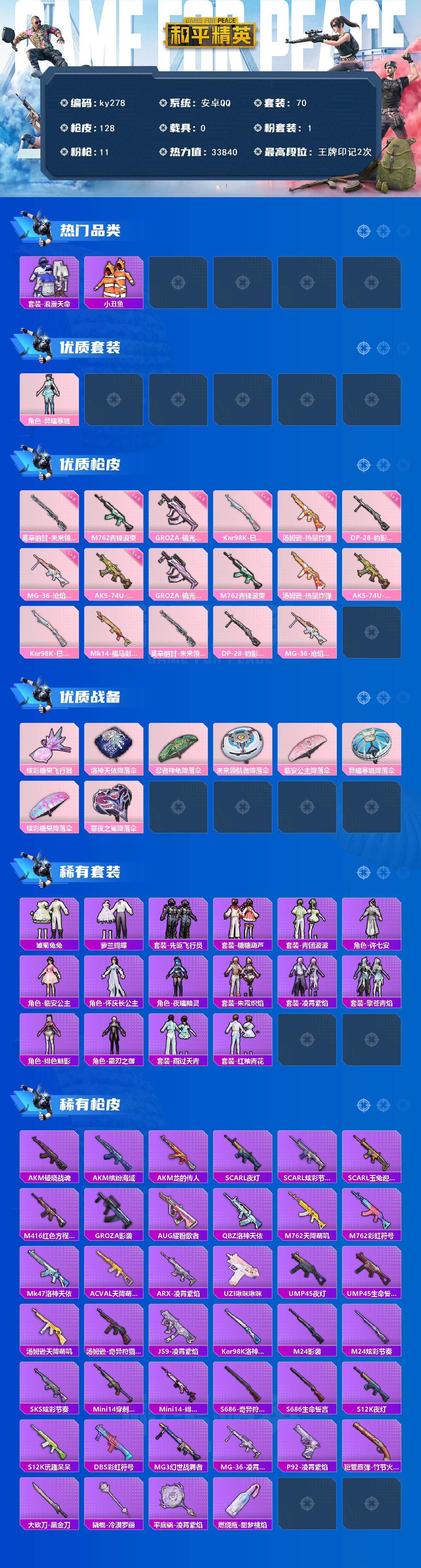 安卓 手Q-1粉装-11特效枪-0载具-1粉色飞行器-33840热力值-2王牌印记-70套装-128枪皮