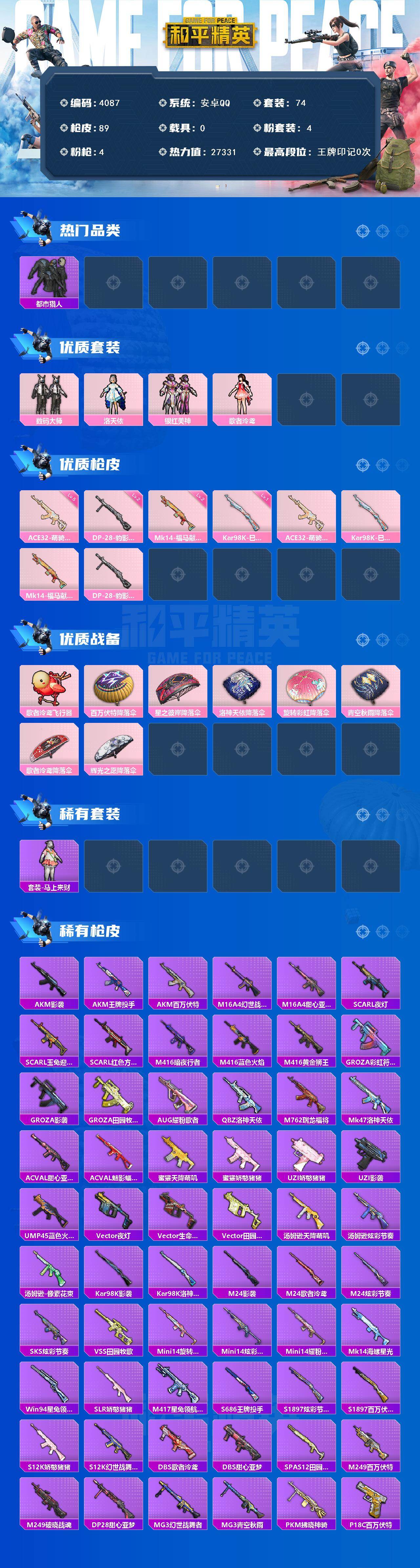 安卓 手Q-4粉装-4特效枪-0载具-1粉色飞行器-27331热力值-1王牌印记-74套装-89枪皮