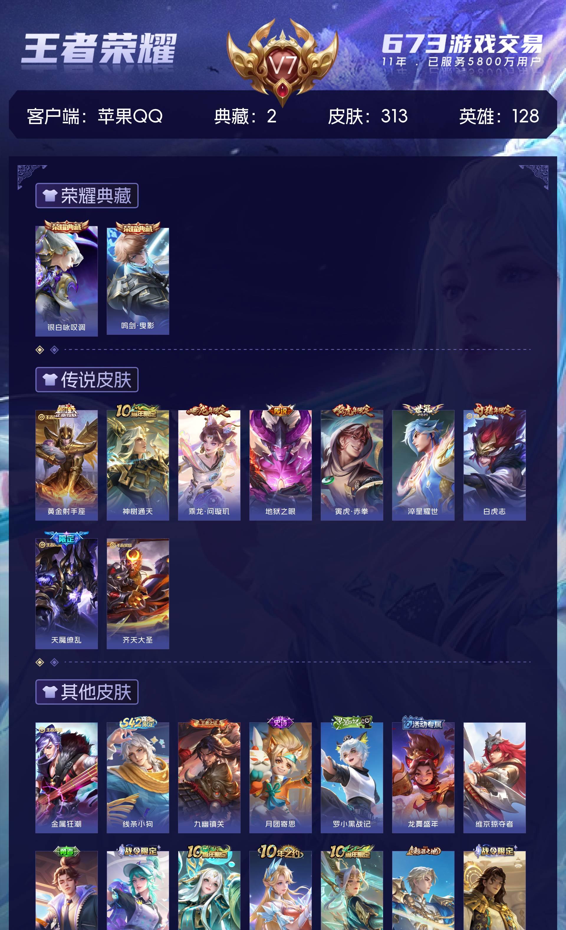 苹果QQ/至尊星耀/313皮肤/128英雄/2典藏/0珍品无双/0无双/0珍品传说/8传说/99史诗