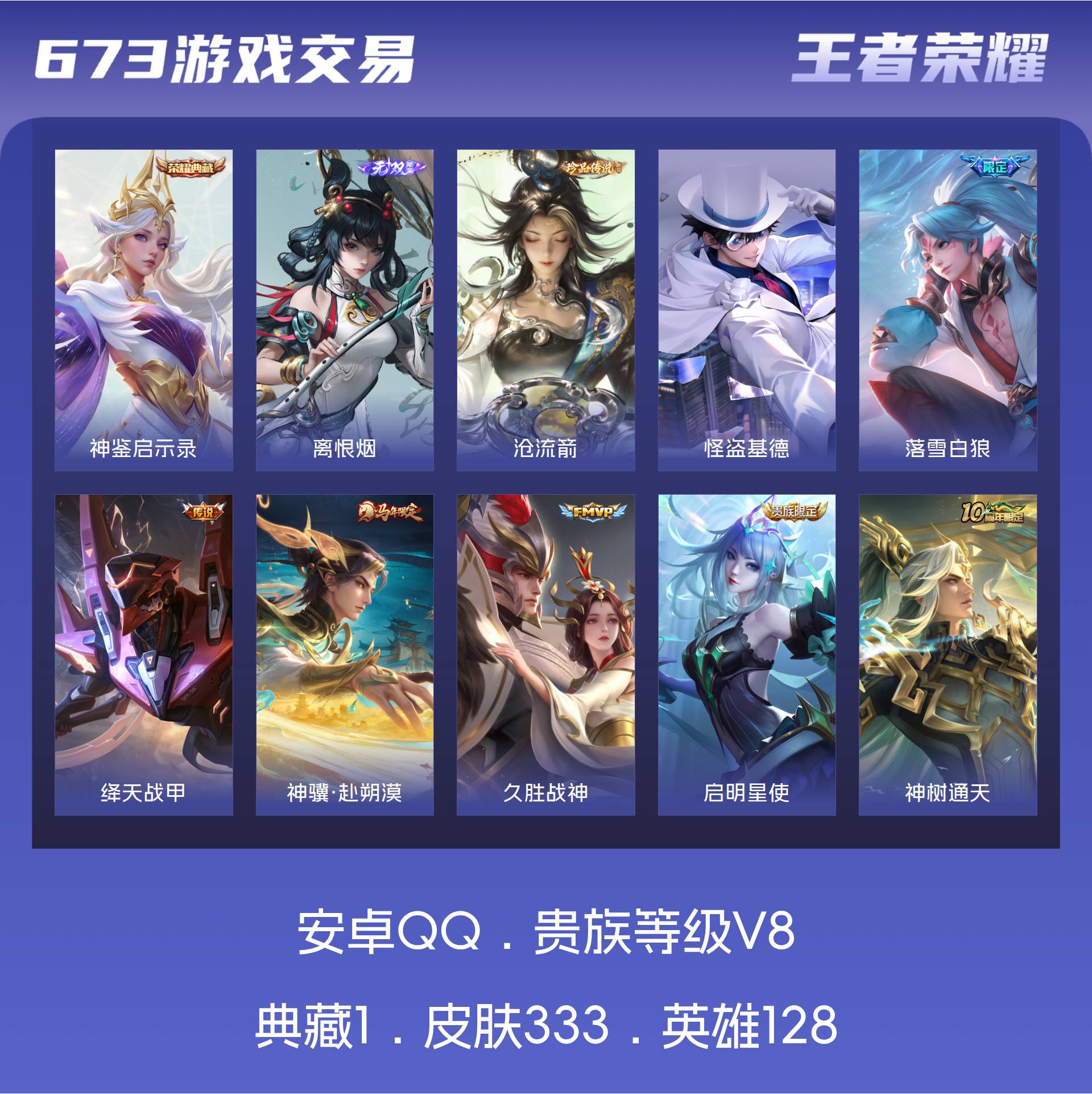 安卓QQ/最强王者/333皮肤/128英雄/1典藏/0珍品无双/1无双/2珍品传说/15传说/114