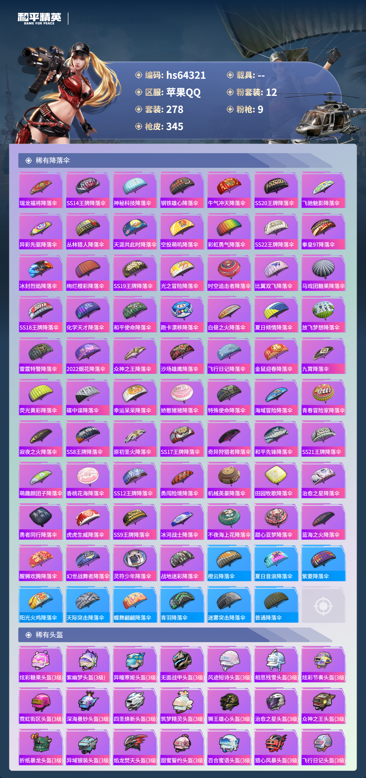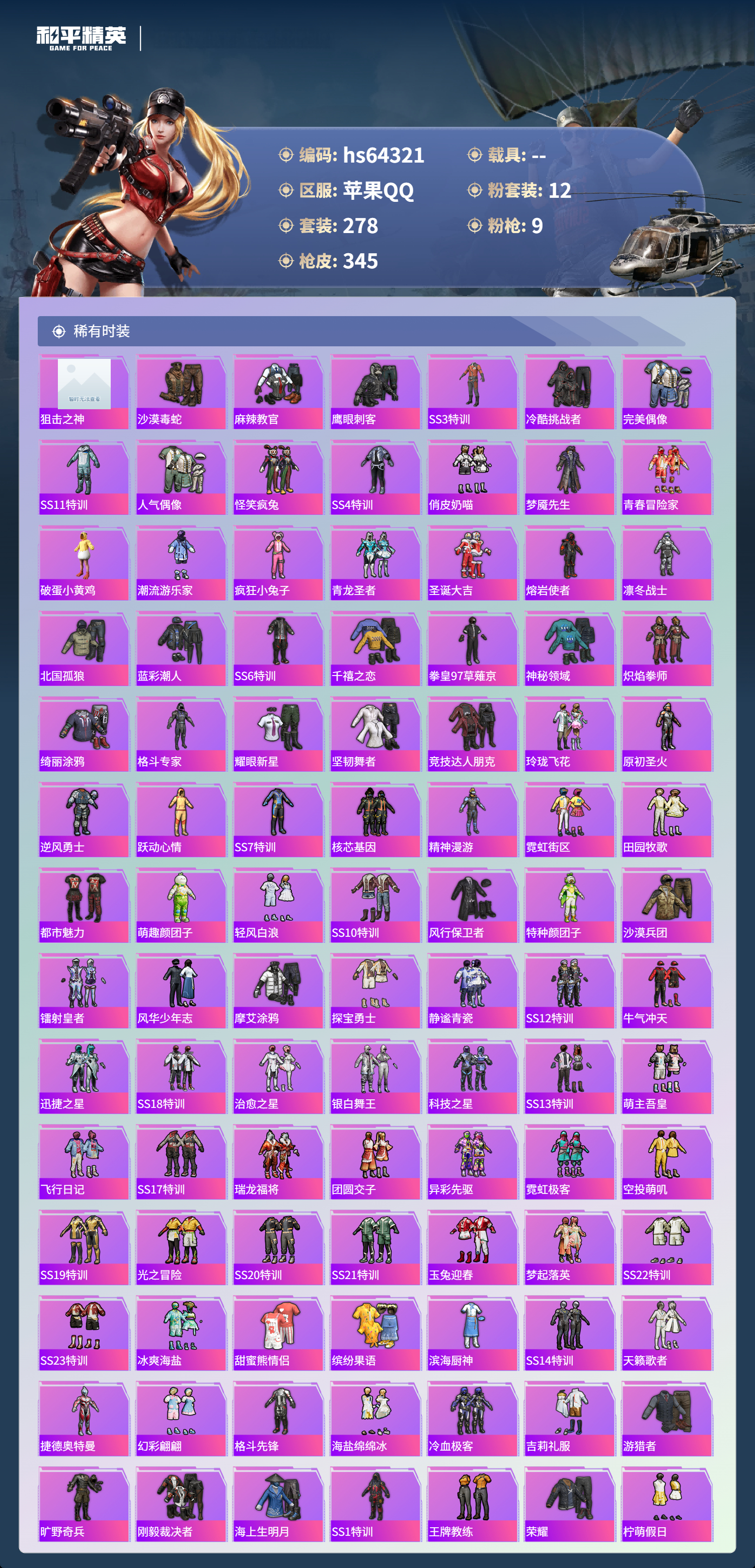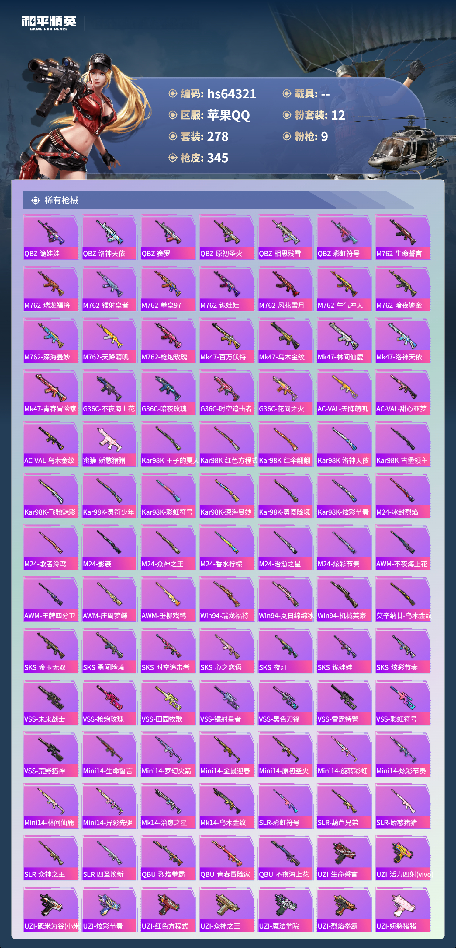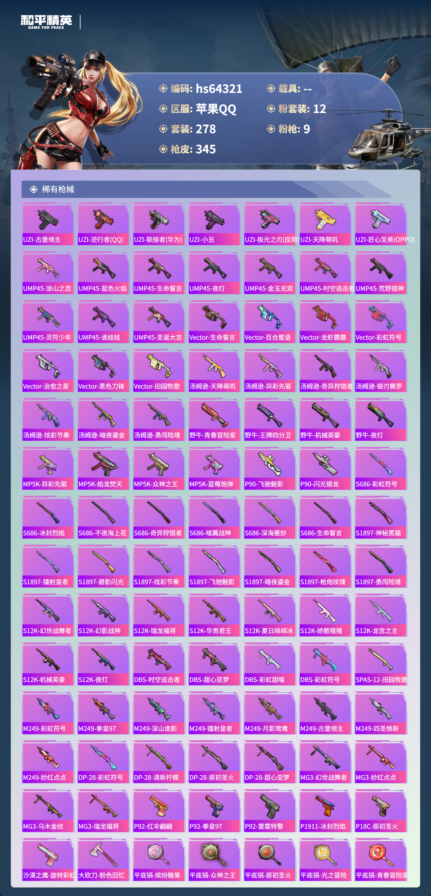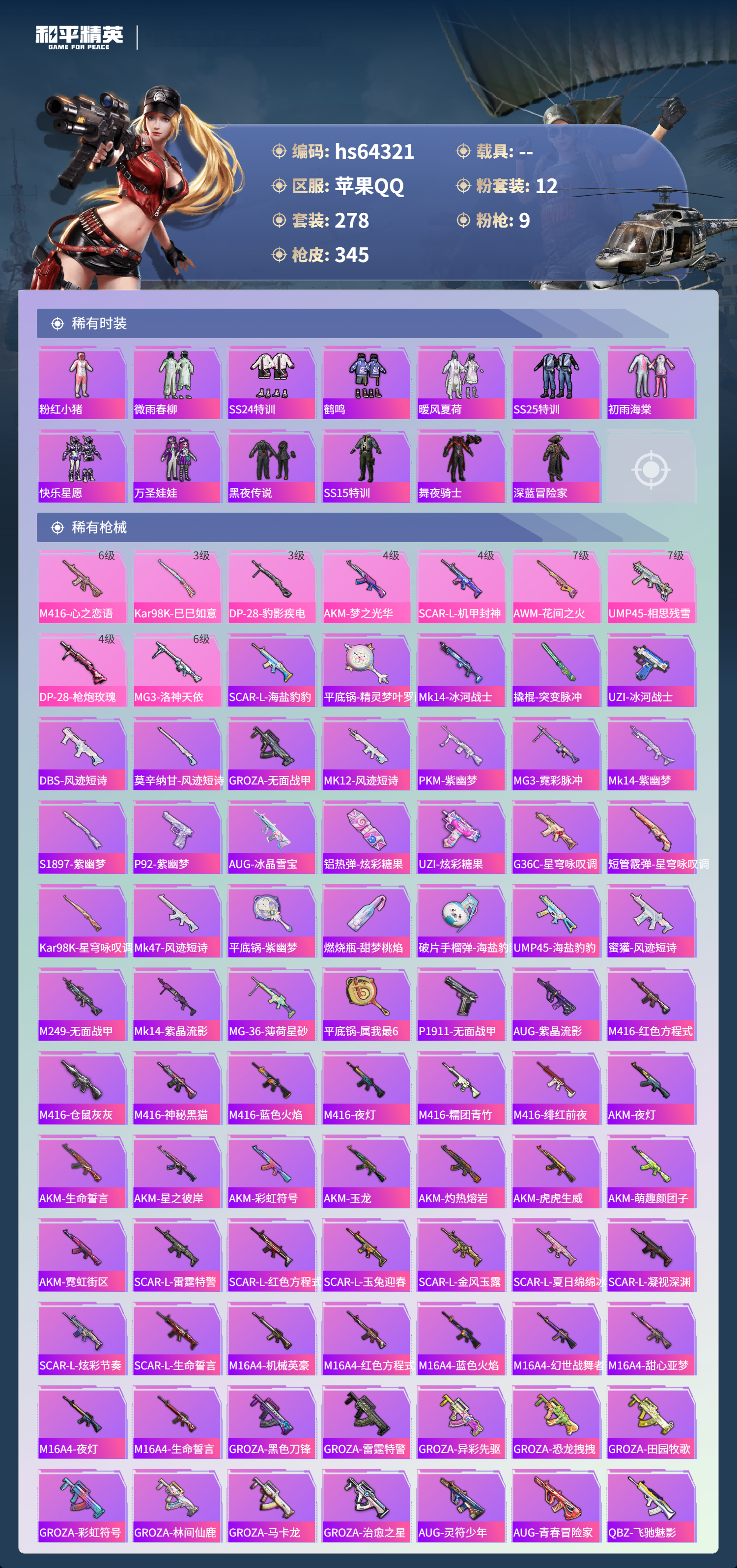 hs64321 苹果手Q-16王牌印记-12粉装-9特效枪-热力值-278套装-345枪皮