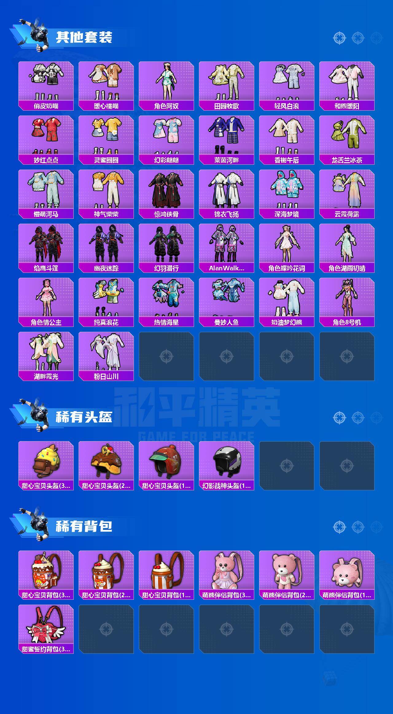 【粉色套装】:粉装-甜心巧克力,粉装-宝贝奶油派,粉装-天使彩虹糖,粉装-缤纷油彩,粉装-绚金战神,粉装-冰霜白皇,粉装-炙焰红王,粉装-吟月归客,角色-复仇流浪者,粉装-彩虹甜喵,粉装-第五大道,粉装-仲夏莫吉托,粉装-未来歌姬,角