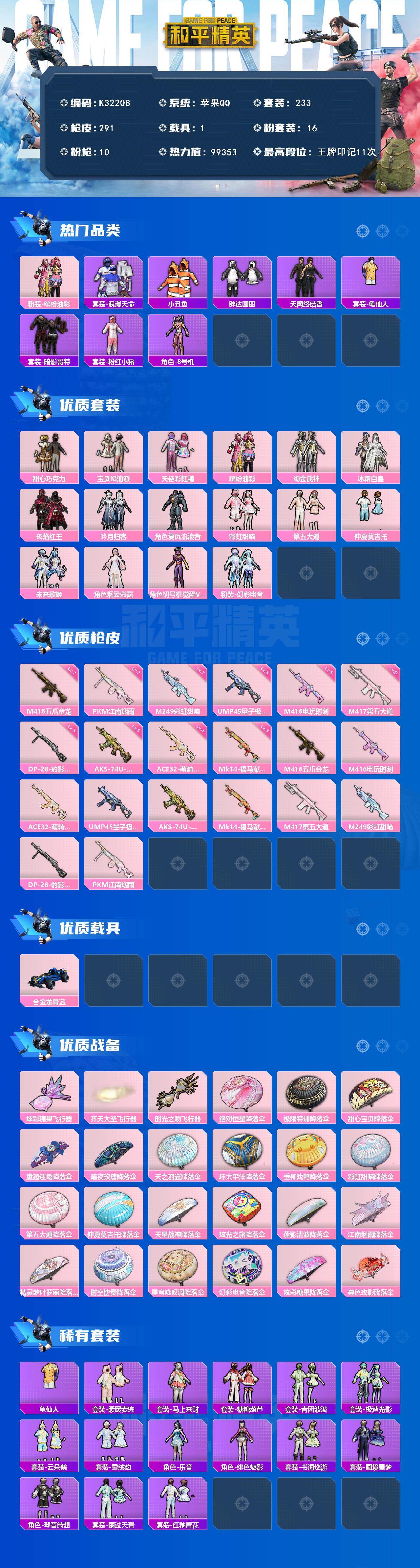 苹果 手Q-16粉装-10特效枪-1载具-3粉色飞行器-99353热力值-11王牌印记-233套装-291枪皮