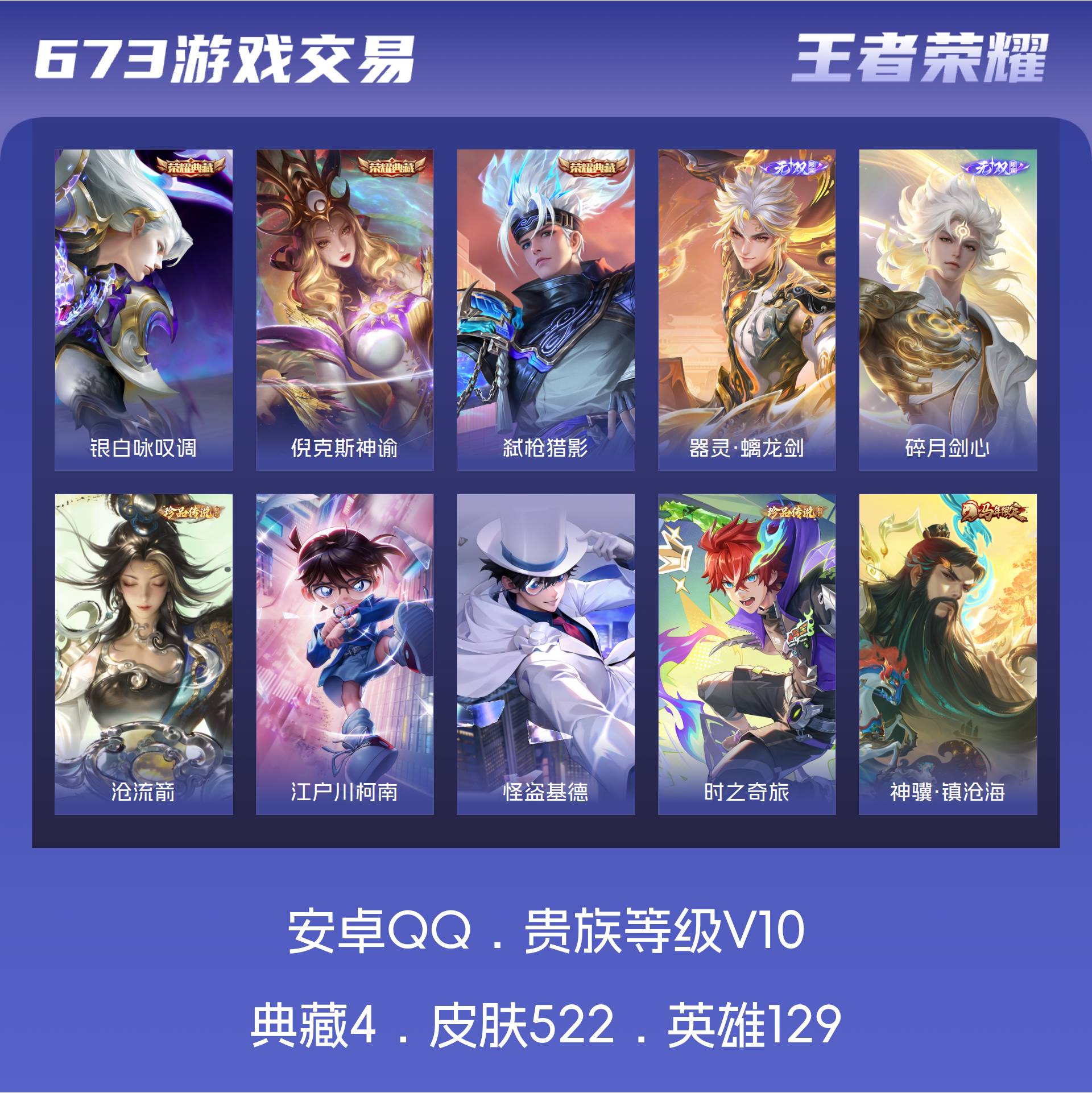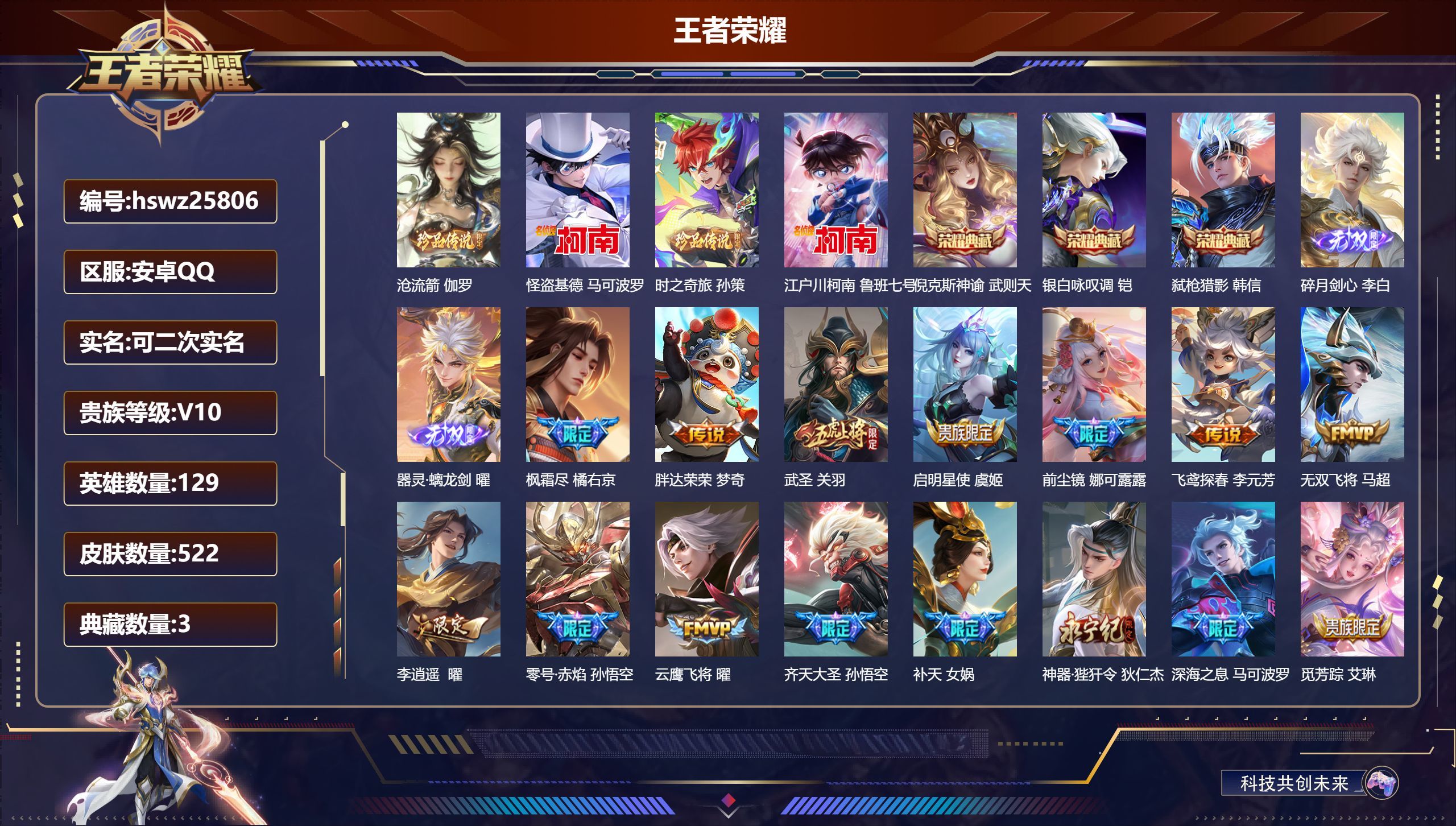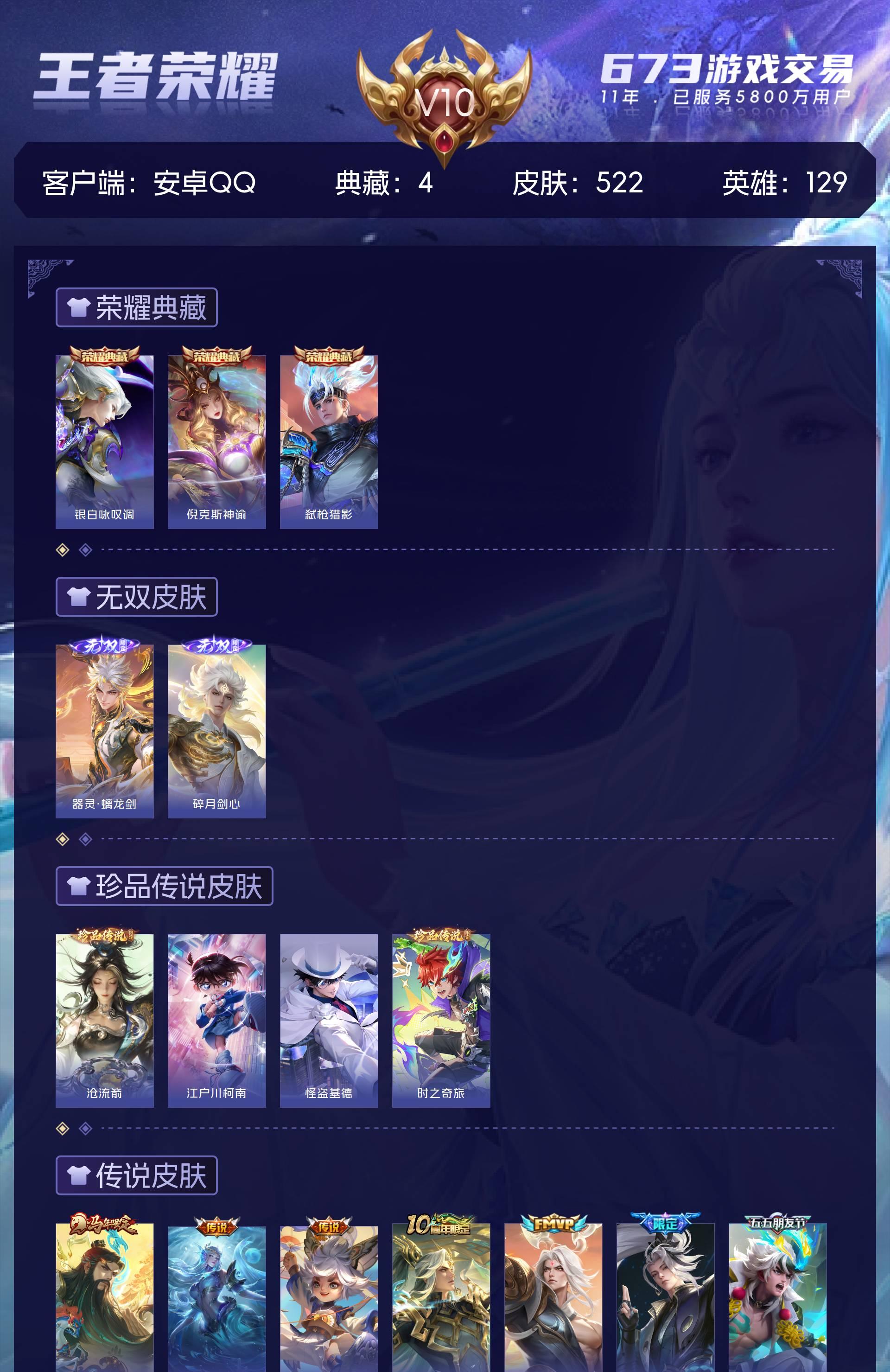 安卓QQ/荣耀王者/522皮肤/129英雄/3典藏/0珍品无双/2无双/4珍品传说/57传说/179