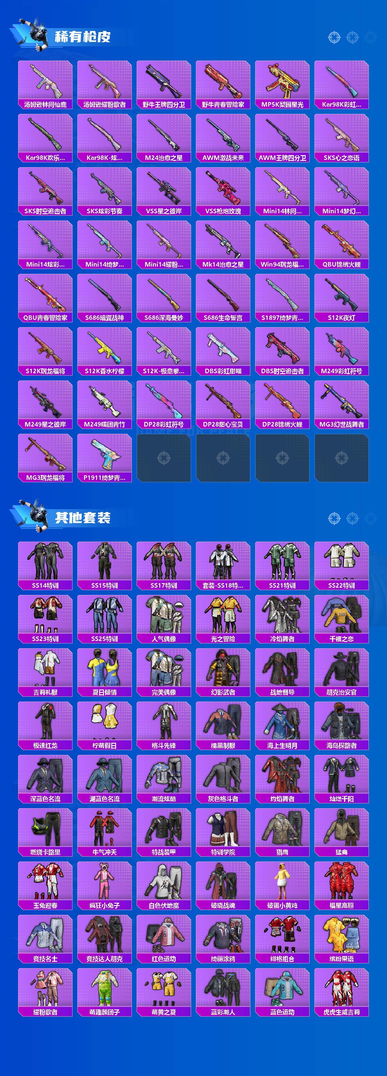 【粉色套装】:粉装-宝贝奶油派,粉装-天使彩虹糖,粉装-梦幻火箭,粉装-甜蜜誓约,粉装-苍蓝魅影,粉装-冰霜白皇,粉装-暗翼战神,粉装-王牌四分卫,粉装-绮梦青鸾,粉装-枪炮玫瑰,粉装-蜜桃特工,粉装-蝶舞蔷薇,粉装-山涧鹿灵,粉装-蓝莓炮弹