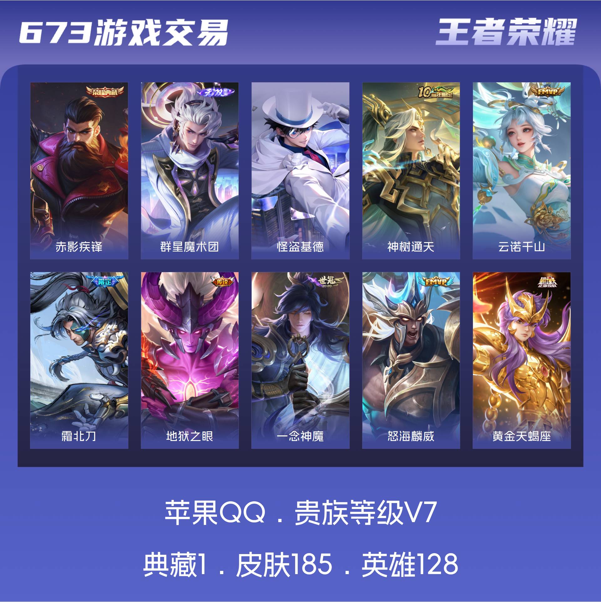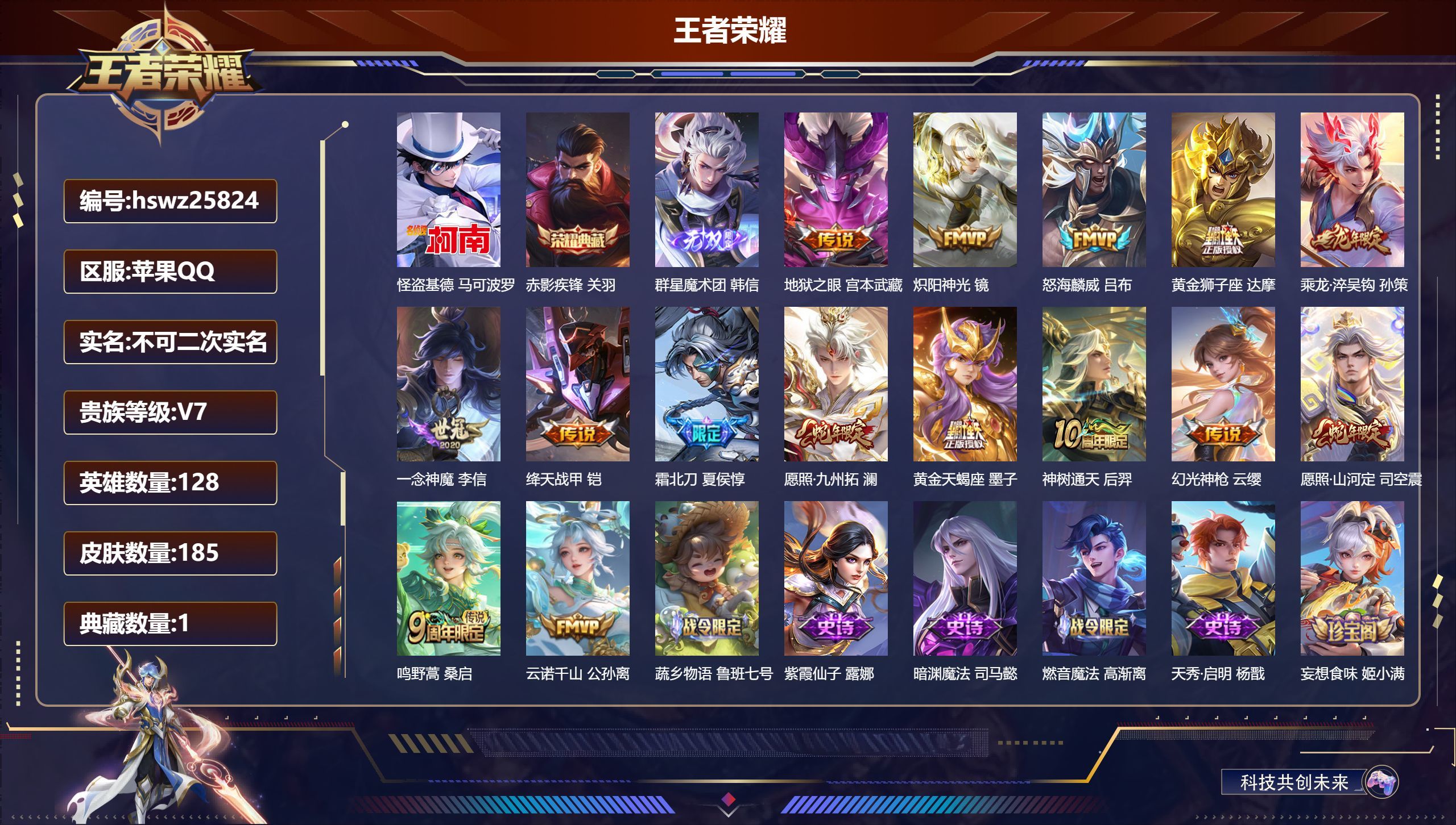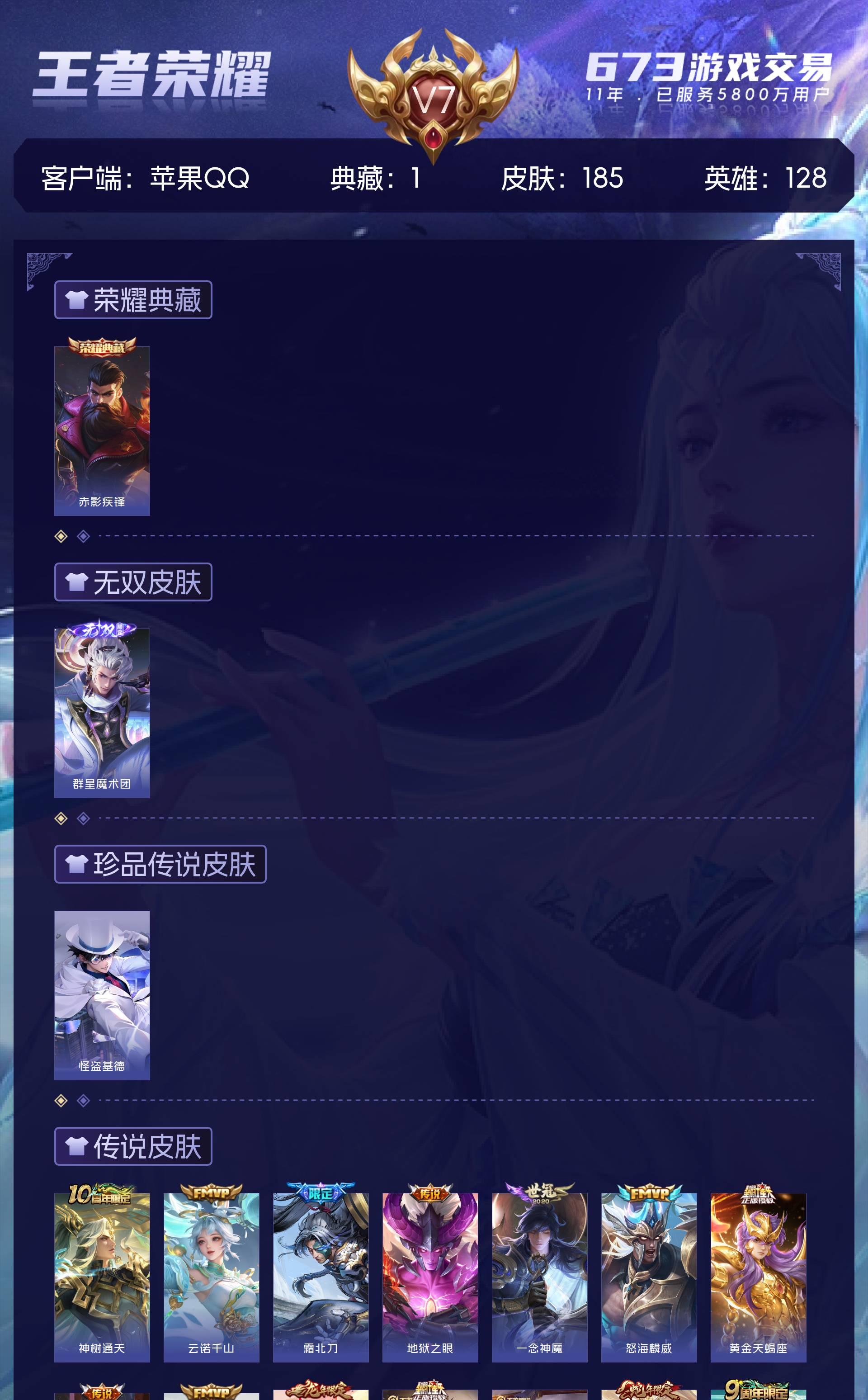 苹果QQ/至尊星耀/185皮肤/128英雄/1典藏/0珍品无双/1无双/1珍品传说/15传说/60史