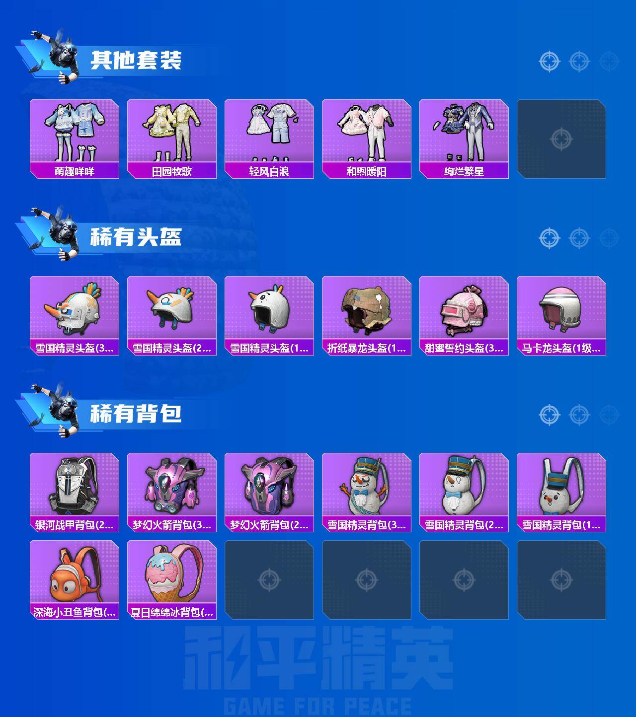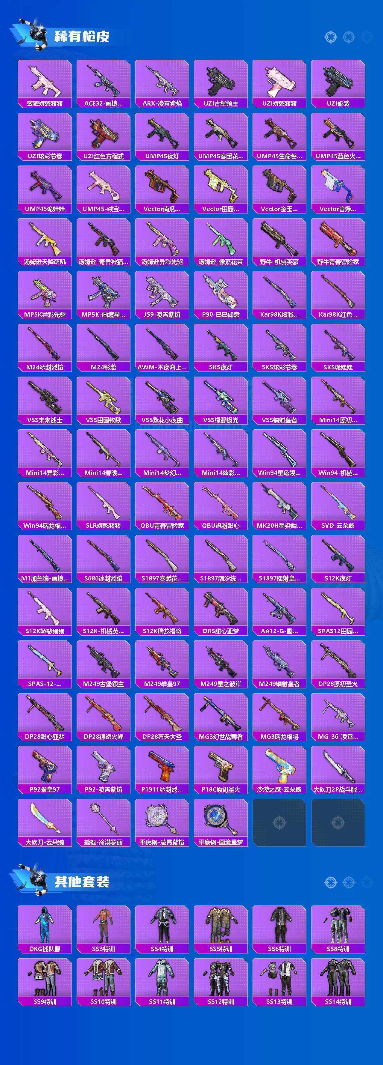【粉色枪皮等级】:AKM-星际浪客(七级),M416-心之恋语(七级),ACE32-萌骑漫游(三级),AKS-74U-森灵之息(五级),Kar98K-伏魔团(四级),Kar98K-巳巳如意(二级),Mk14-福马献瑞(一
