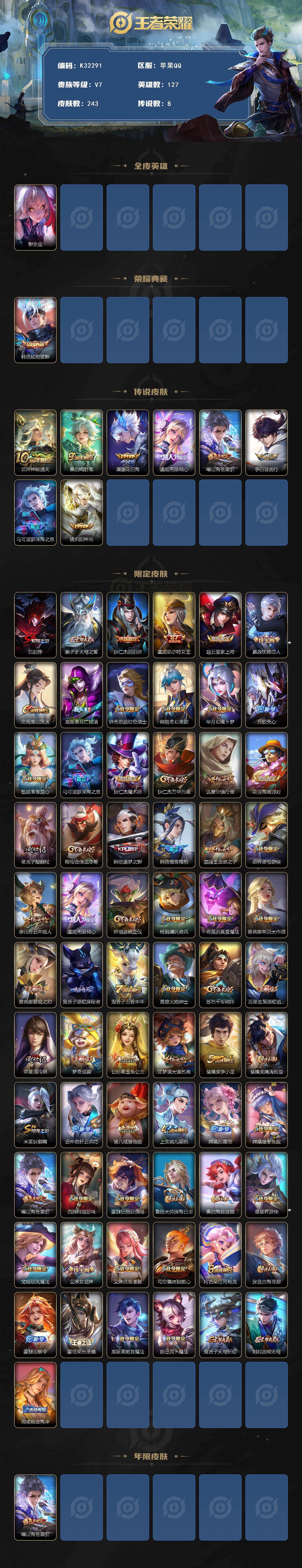 苹果Q-V7-最强王者段位-127英雄-243皮肤-1典藏皮肤-8传说-60史诗