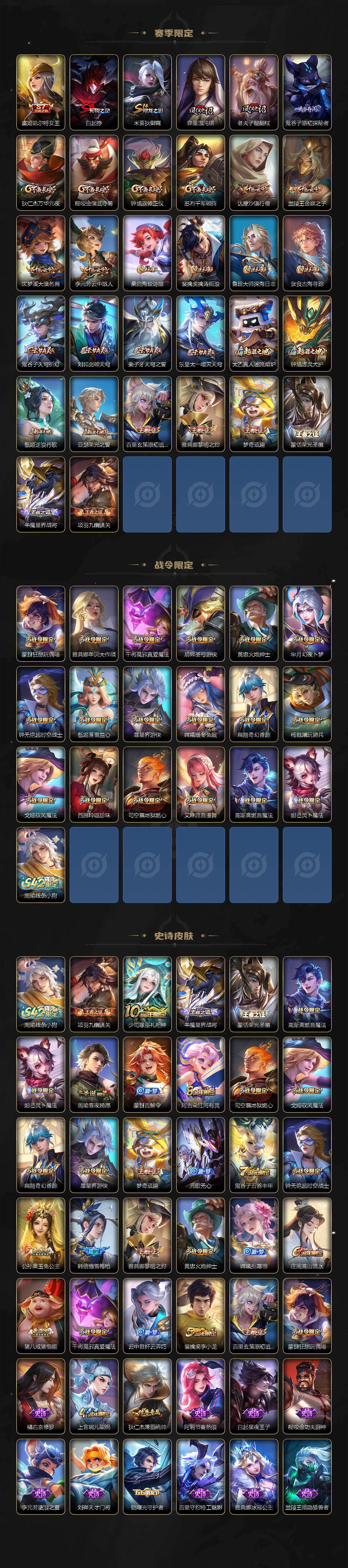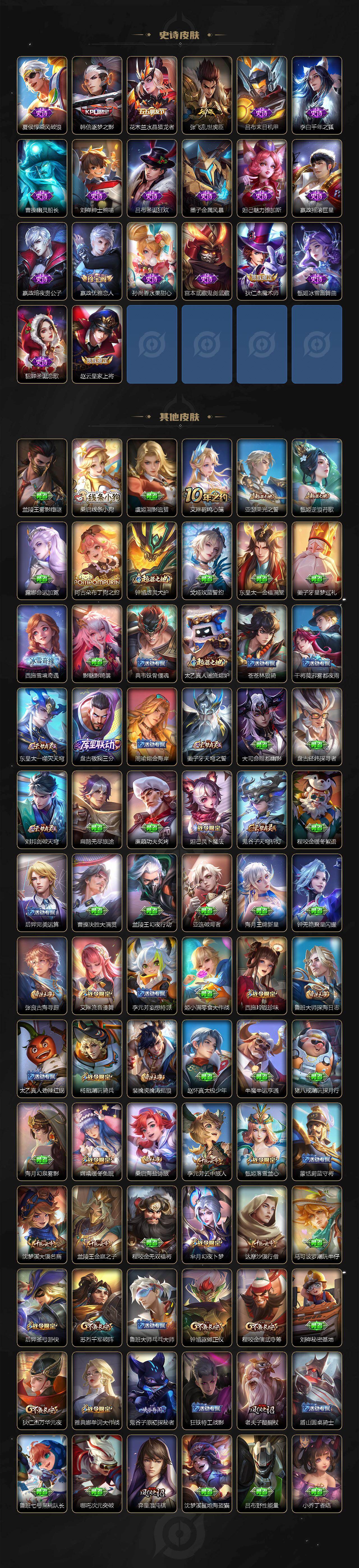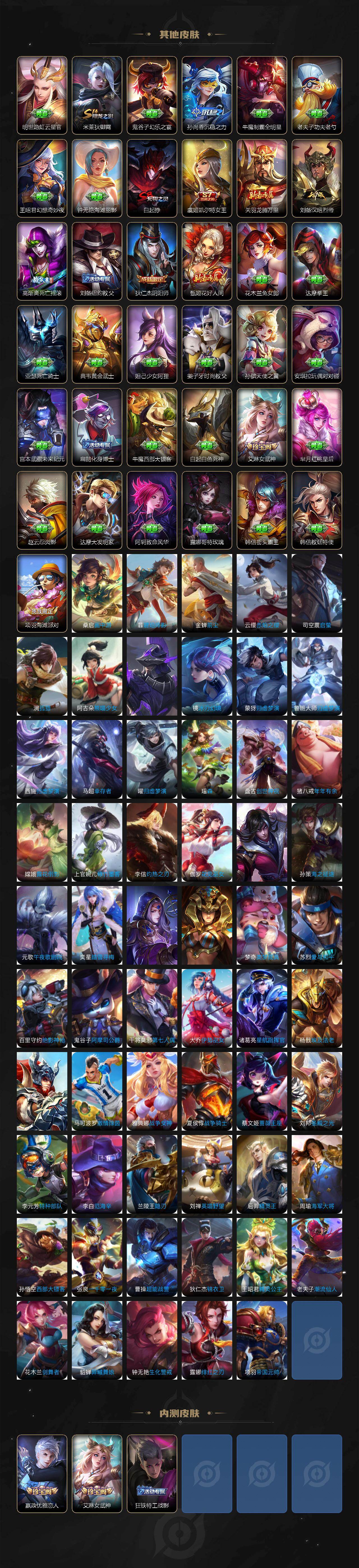 【限定皮肤】:白起狰,姜子牙天穹之誓,狄仁杰阴阳师,虞姬凯尔特女王,赵云皇家上将,嬴政优雅恋人,庄周高山流水,高渐离死亡摇滚,钟无艳超时空战士,扁鹊奇幻香踪,芈月幻夜卜梦,元歌无心,甄姬落雪兰心,马可波罗深海之息,狄仁杰魔术师,狄仁杰万华元夜,达