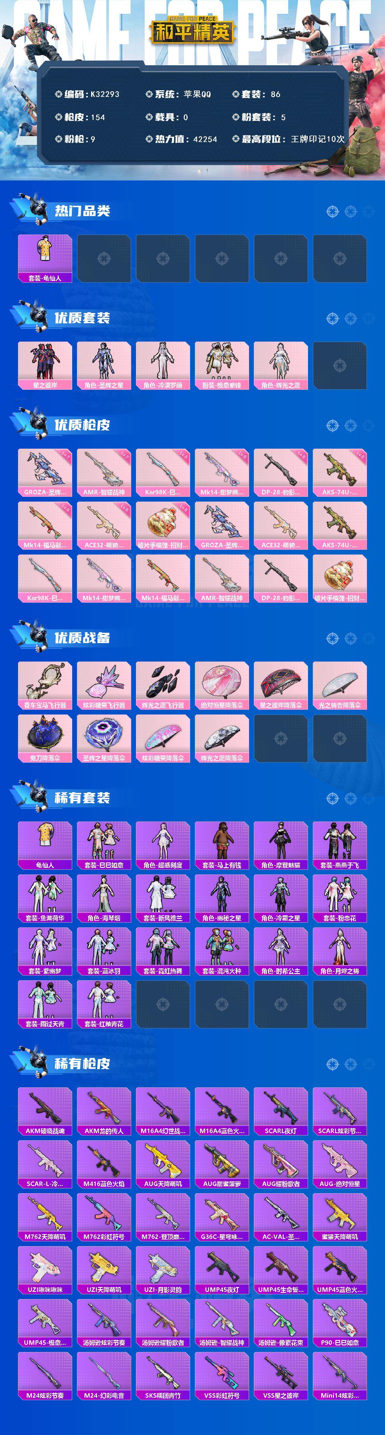 苹果 手Q-5粉装-9特效枪-0载具-3粉色飞行器-42254热力值-10王牌印记-86套装-154枪皮