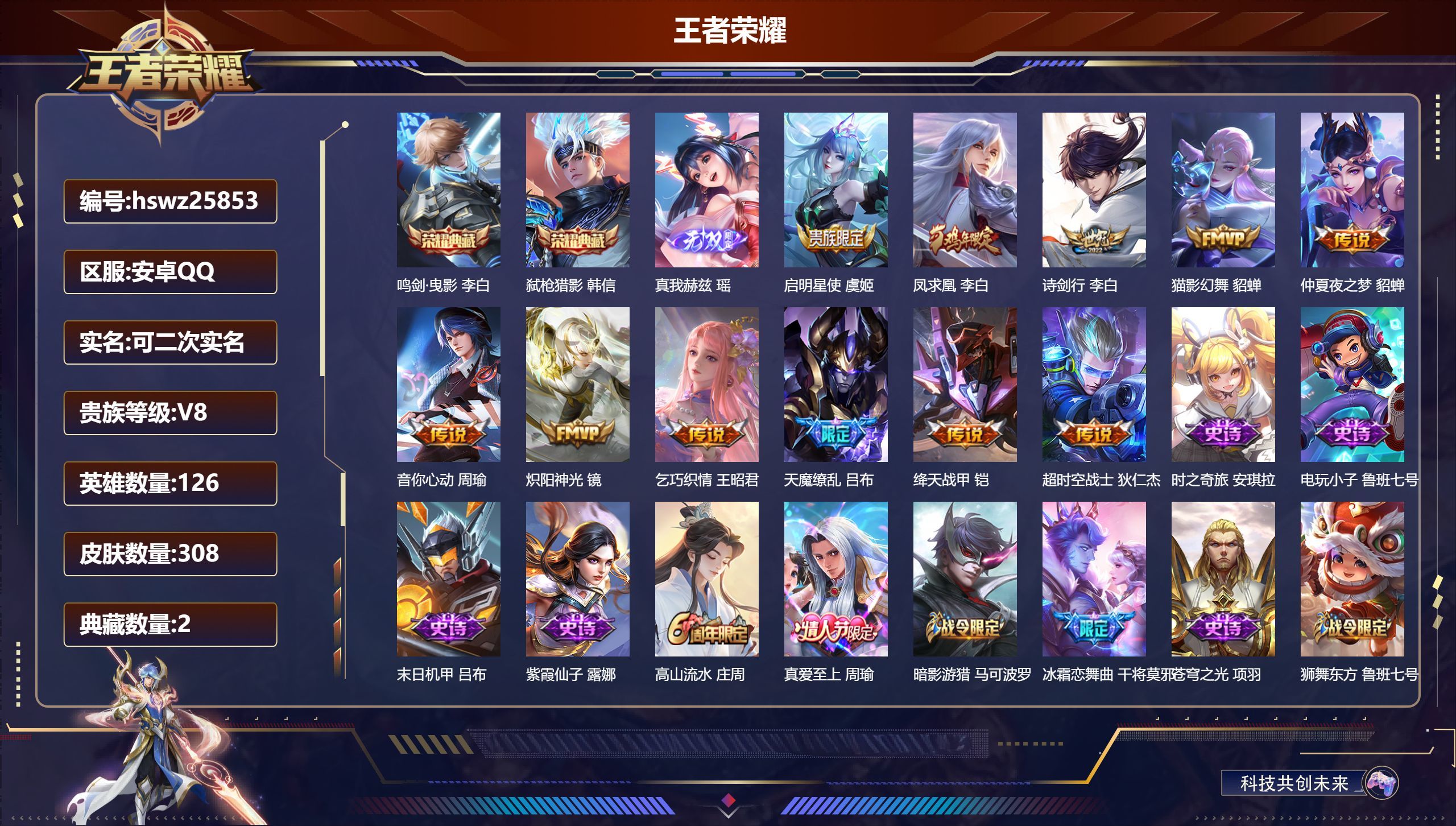 安卓QQ/永恒钻石/308皮肤/126英雄/2典藏/0珍品无双/1无双/0珍品传说/11传说/83史