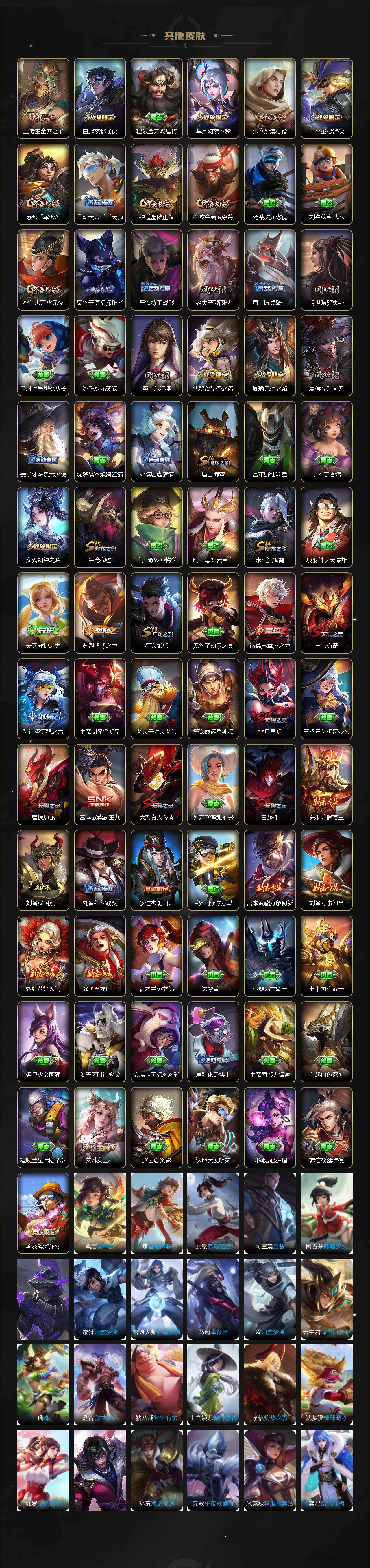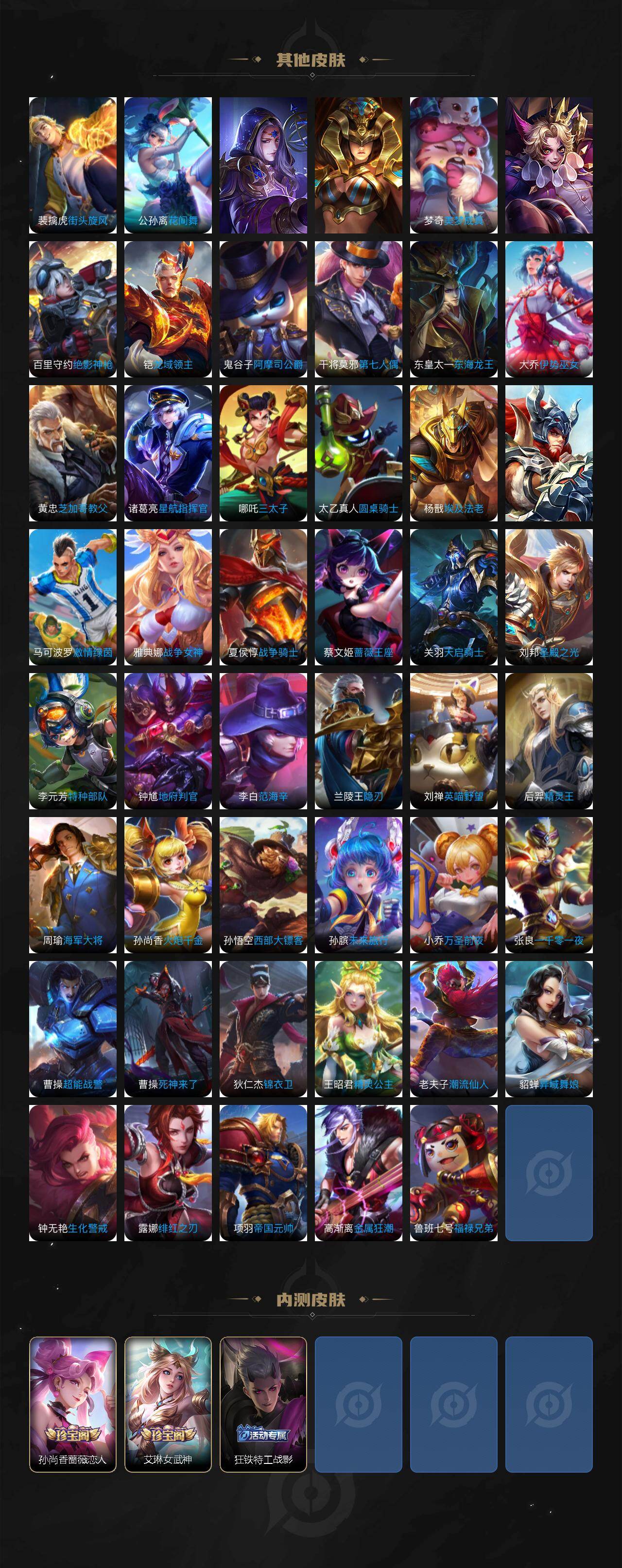 【限定皮肤】:白起狰,狄仁杰阴阳师,赵云皇家上将,孙尚香蔷薇恋人,庄周高山流水,白起夜都怪侠,芈月重明,芈月幻夜卜梦,周瑜赤莲之焰,夏侯惇朔风刀,甄姬女儿国国王,甄姬游园惊梦,曹操烛龙,典韦穷奇,典韦蓝屏警告,狄仁杰魔术师,狄仁杰万华元夜,达摩沙漠行僧,项羽海滩派对,老夫子醍醐杖,关羽百相守梦,