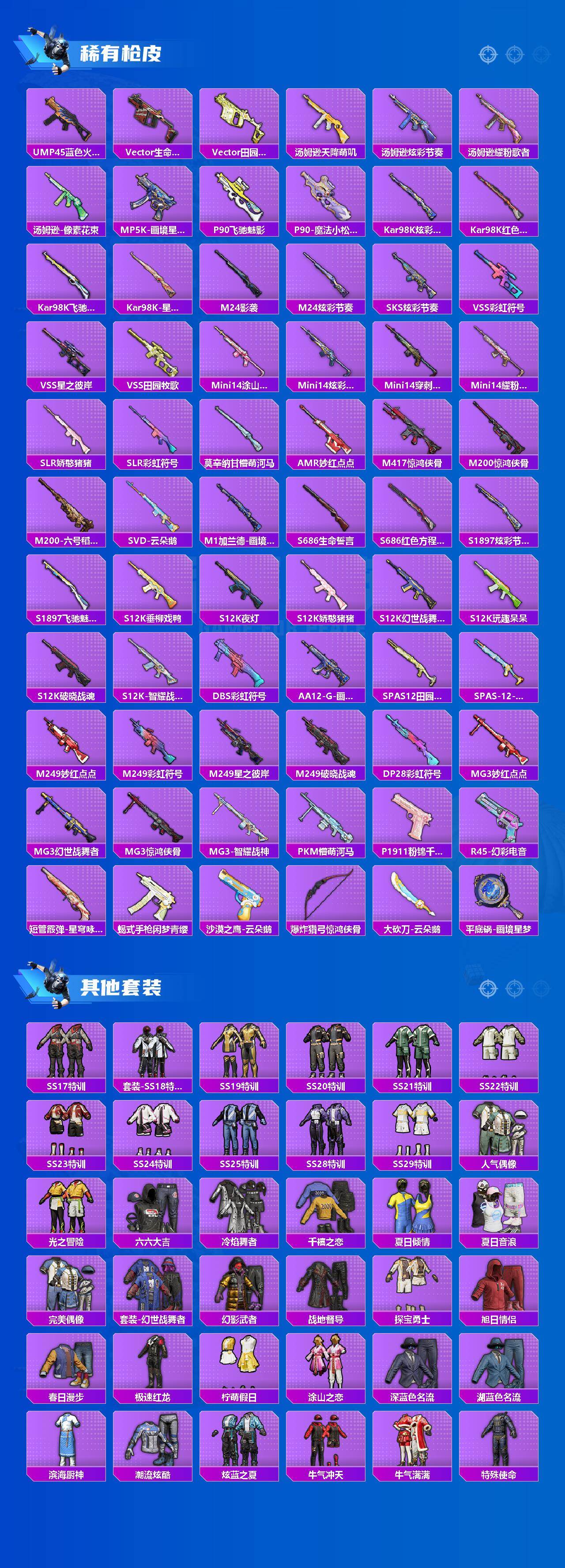 【粉色枪皮等级】:AUG-星之彼岸(四级),ACE32-萌骑漫游(三级),Kar98K-巳巳如意(五级),Mk14-福马献瑞(五级),DP-28-豹影疾电(五级)