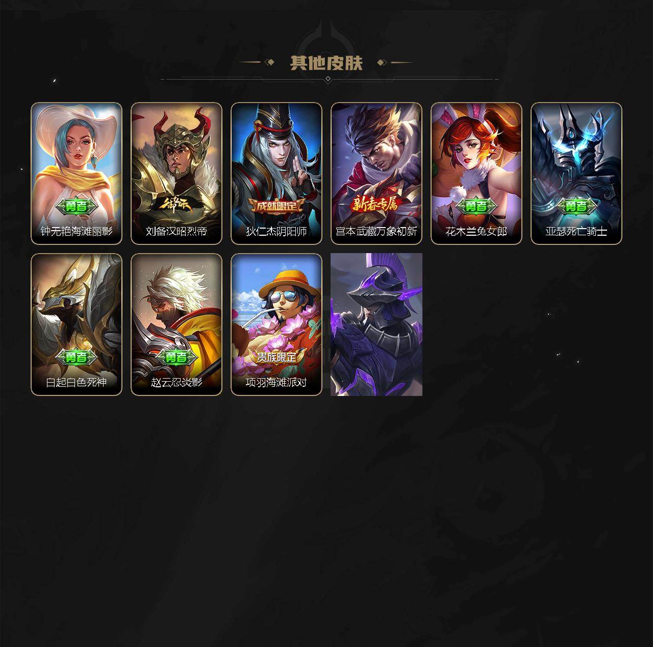 【限定皮肤】:狄仁杰阴阳师,赵云皇家上将,狄仁杰魔术师,项羽海滩派对,马超琥珀纪元