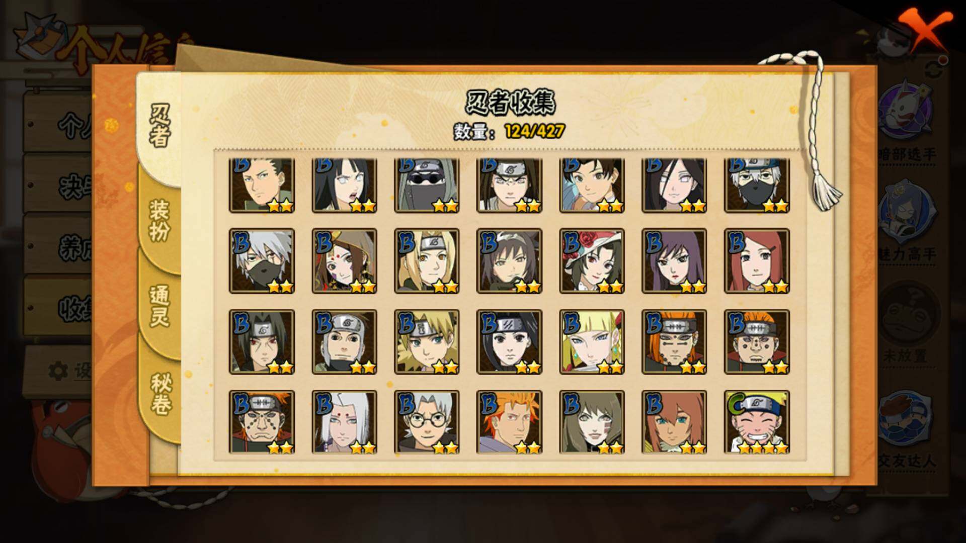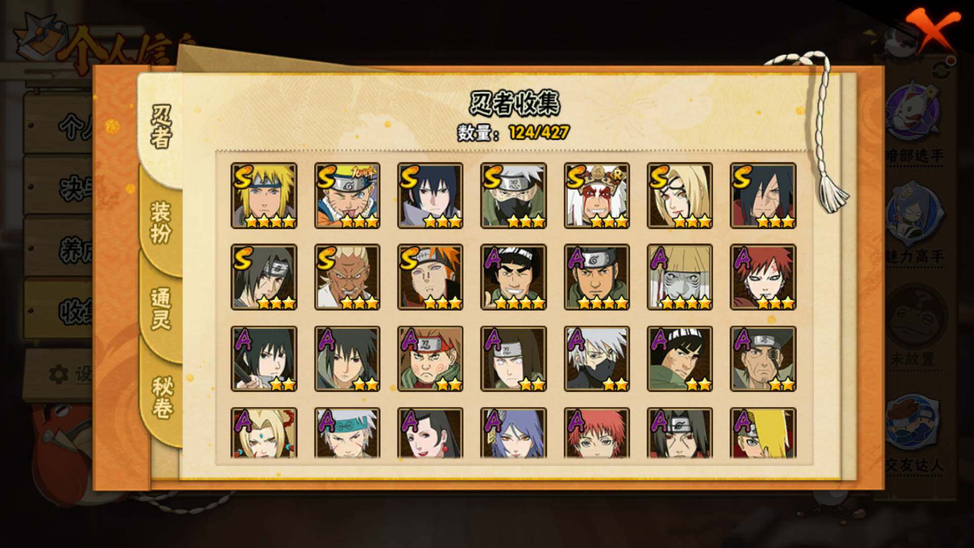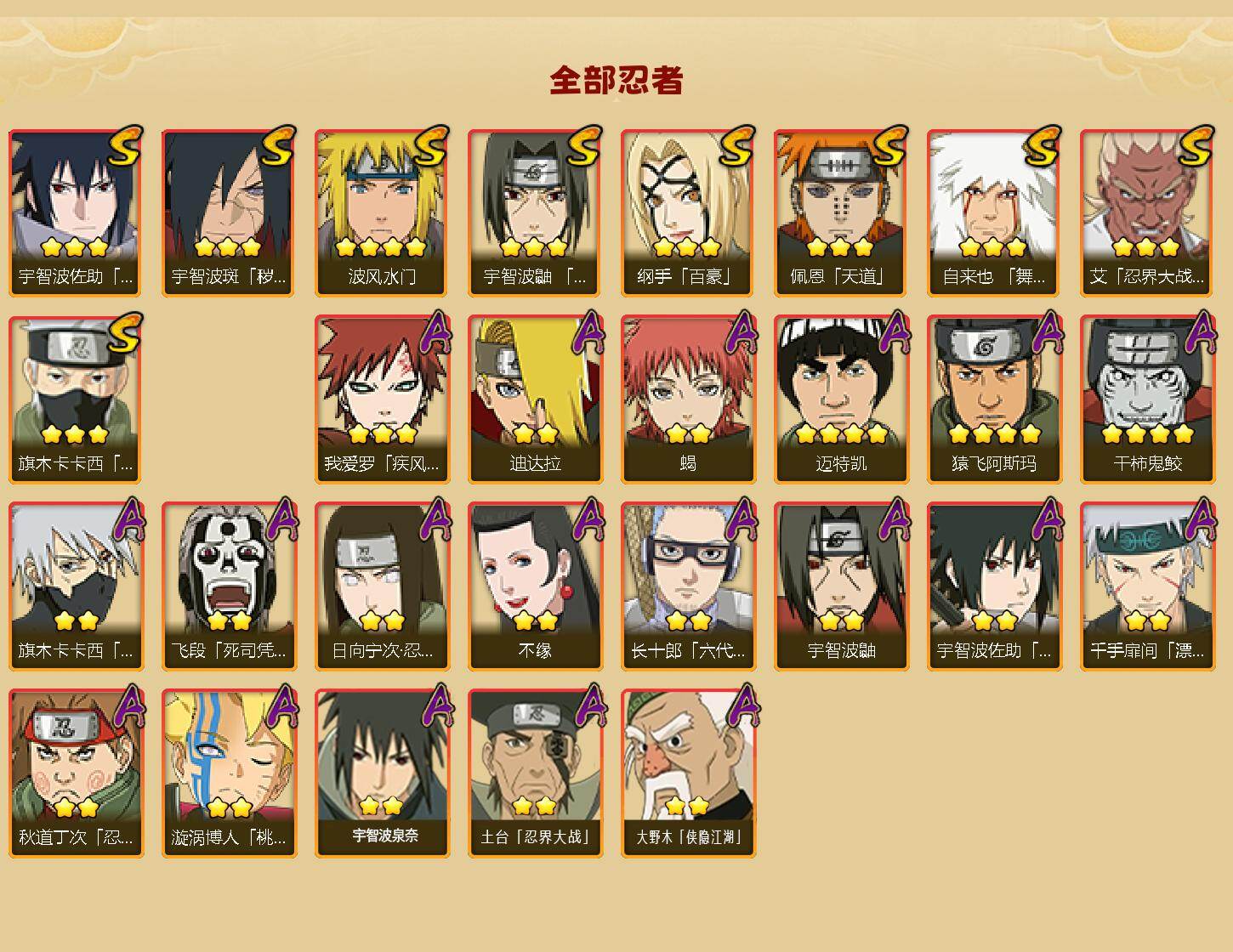 【S级忍者】:宇智波斑「秽土转生·解」(3星),艾「忍界大战」(3星),宇智波鼬「须佐能乎」(3星),旗木卡卡西「须佐能乎」(3星),自来也「舞之豪杰」(3星),纲手「百豪」(3星),波风水门(4星),佩恩「天道」(3星),宇智波佐助「永恒万花筒」(3星),漩涡鸣人·宇智波