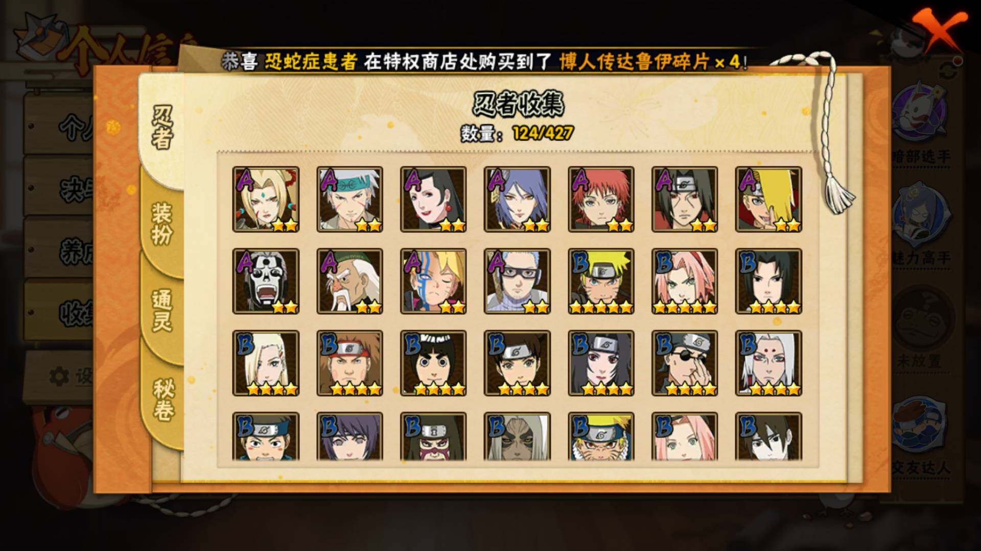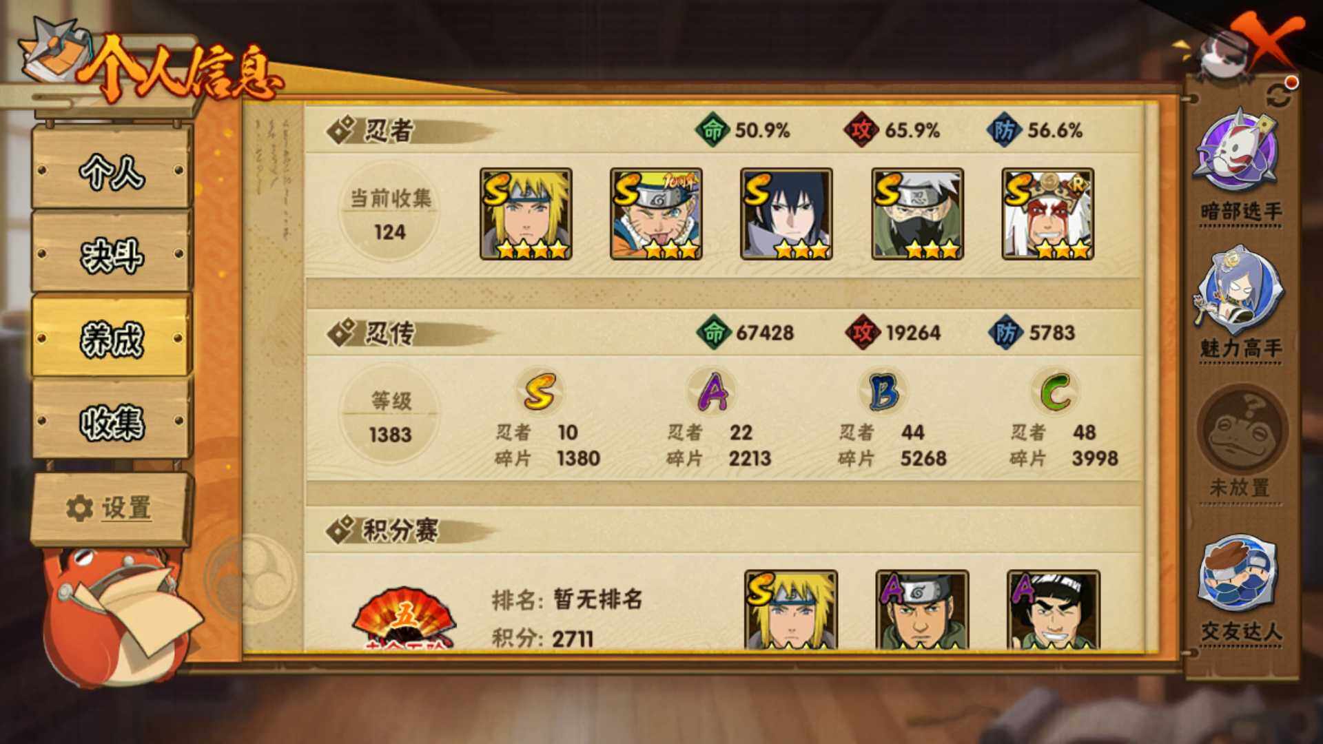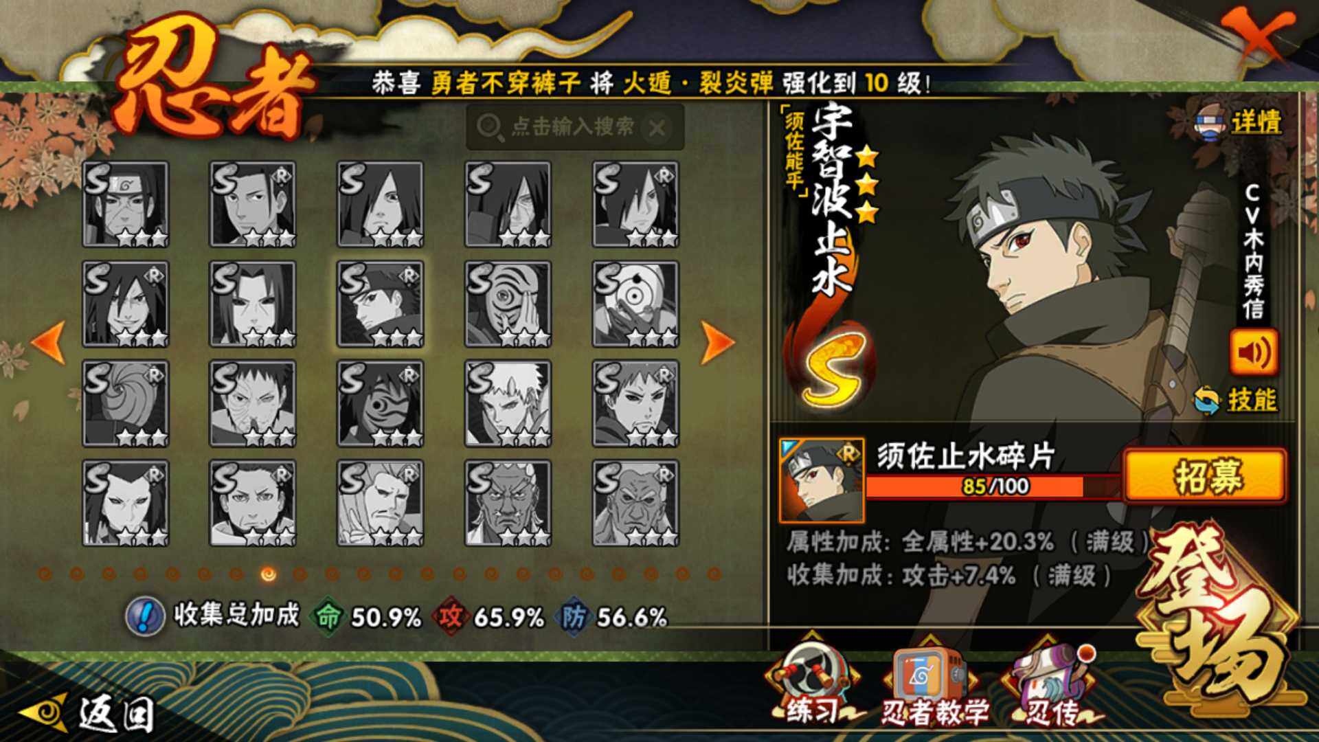 【S级忍者】:宇智波斑「秽土转生·解」(3星),艾「忍界大战」(3星),宇智波鼬「须佐能乎」(3星),旗木卡卡西「须佐能乎」(3星),自来也「舞之豪杰」(3星),纲手「百豪」(3星),波风水门(4星),佩恩「天道」(3星),宇智波佐助「永恒万花筒」(3星),漩涡鸣人·宇智波