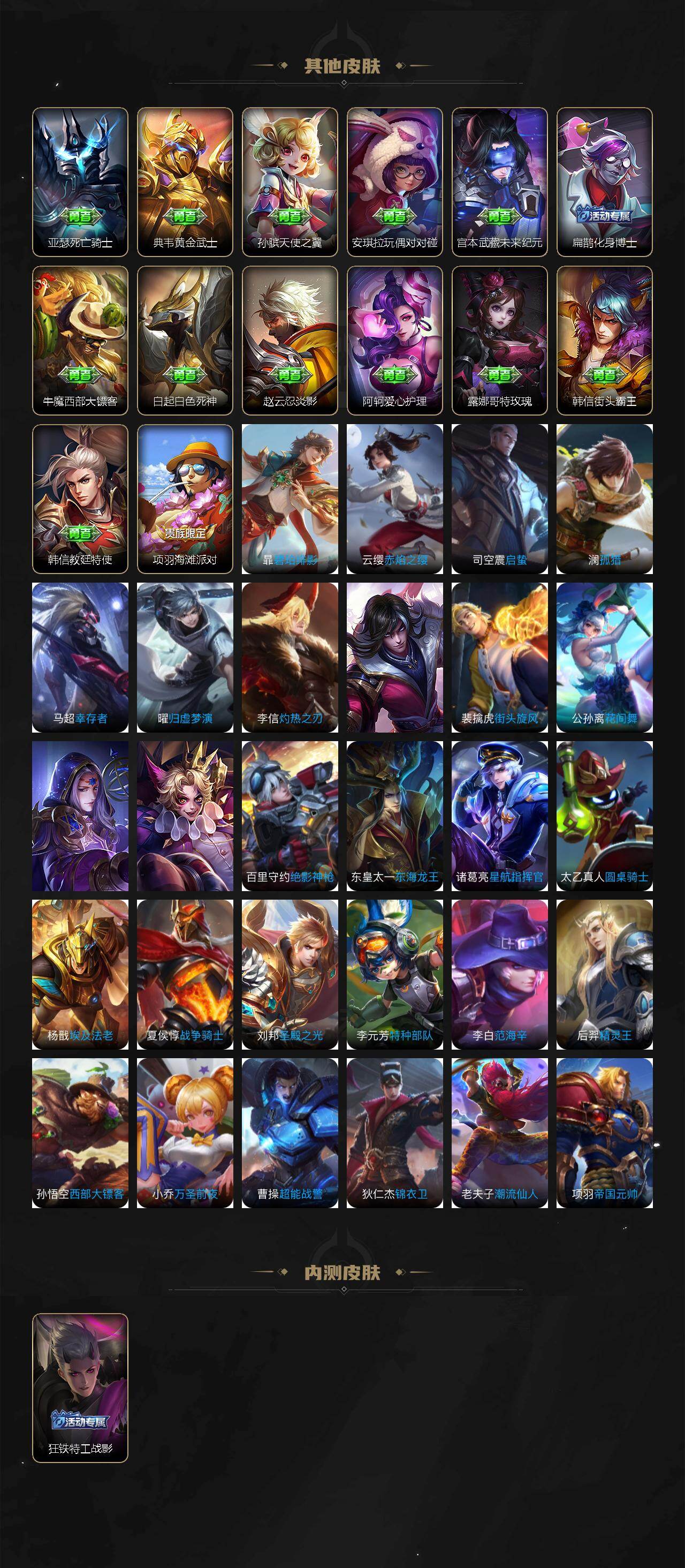 【限定皮肤】:大乔绒语心约,李白谪仙醉月,狄仁杰阴阳师,赵云皇家上将,元歌无心,狄仁杰魔术师,项羽海滩派对,蔡文姬繁星吟游,鬼谷子五谷丰年,百里玄策原初追逐者,裴擒虎李小龙,艾琳流音漫舞,司