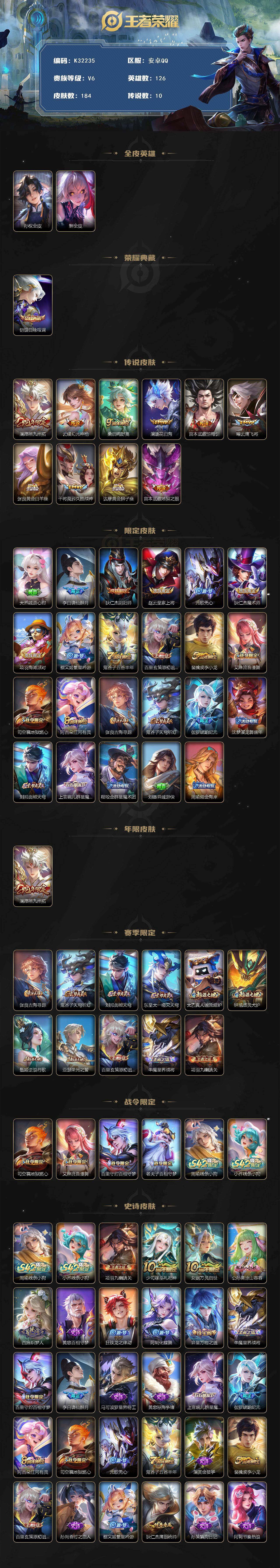 安卓Q-V6-至尊星耀II段位-126英雄-184皮肤-1典藏皮肤-10传说-5