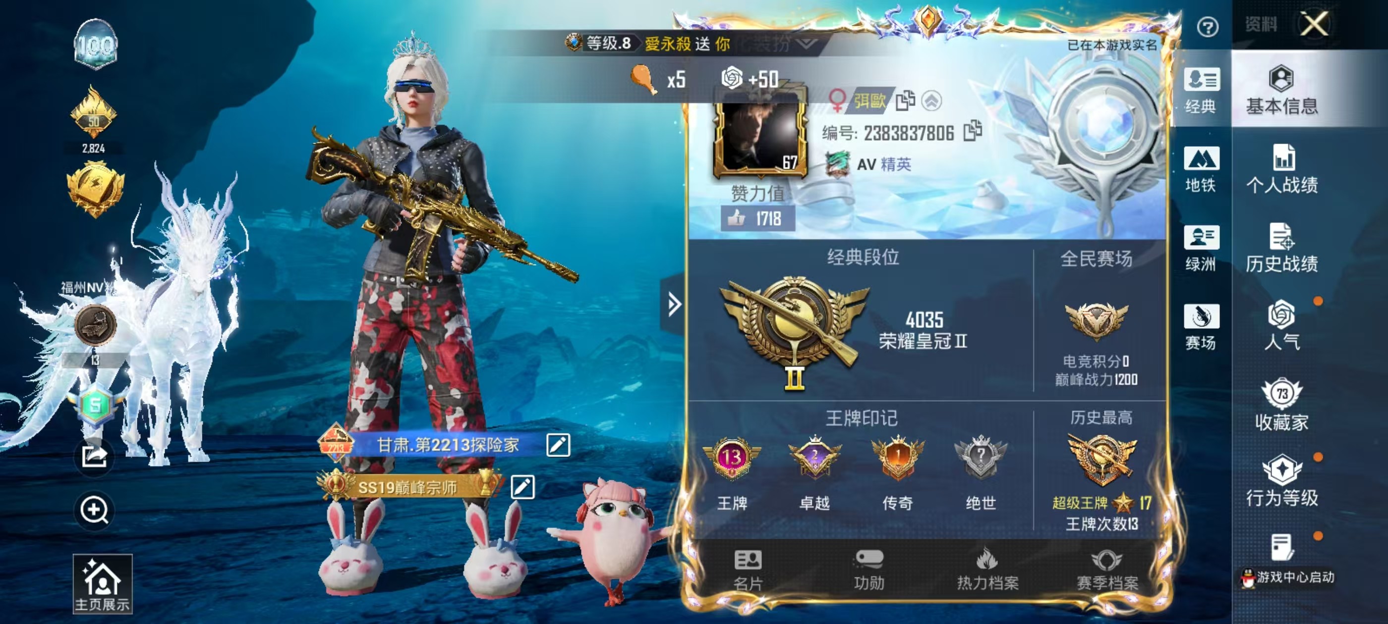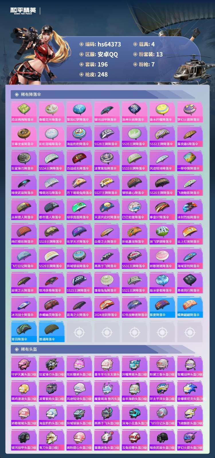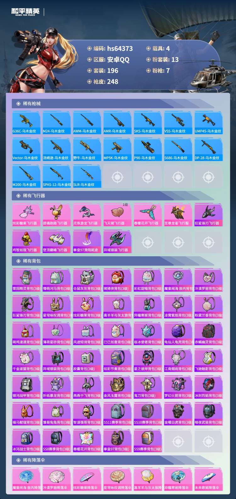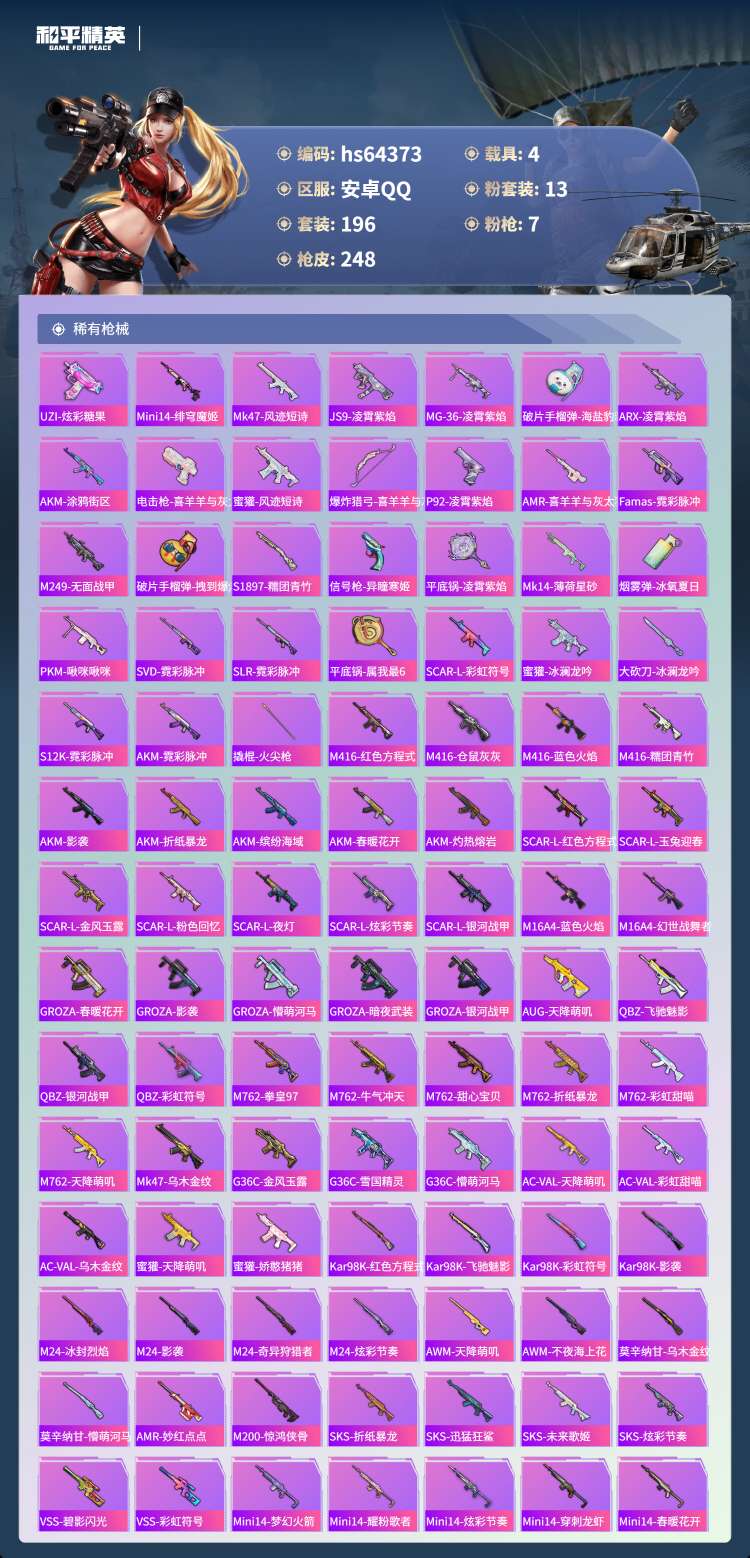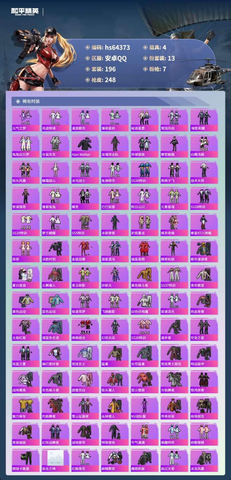 安卓手Q-13王牌印记-1红装-13粉装-7特效枪-4载具-88945热力值-196套装-248枪皮