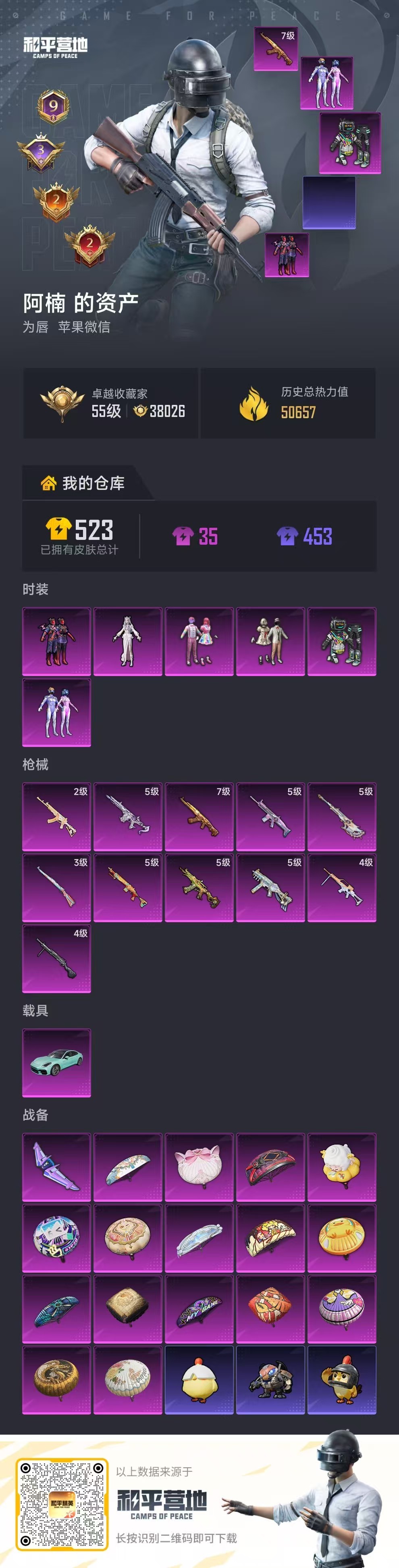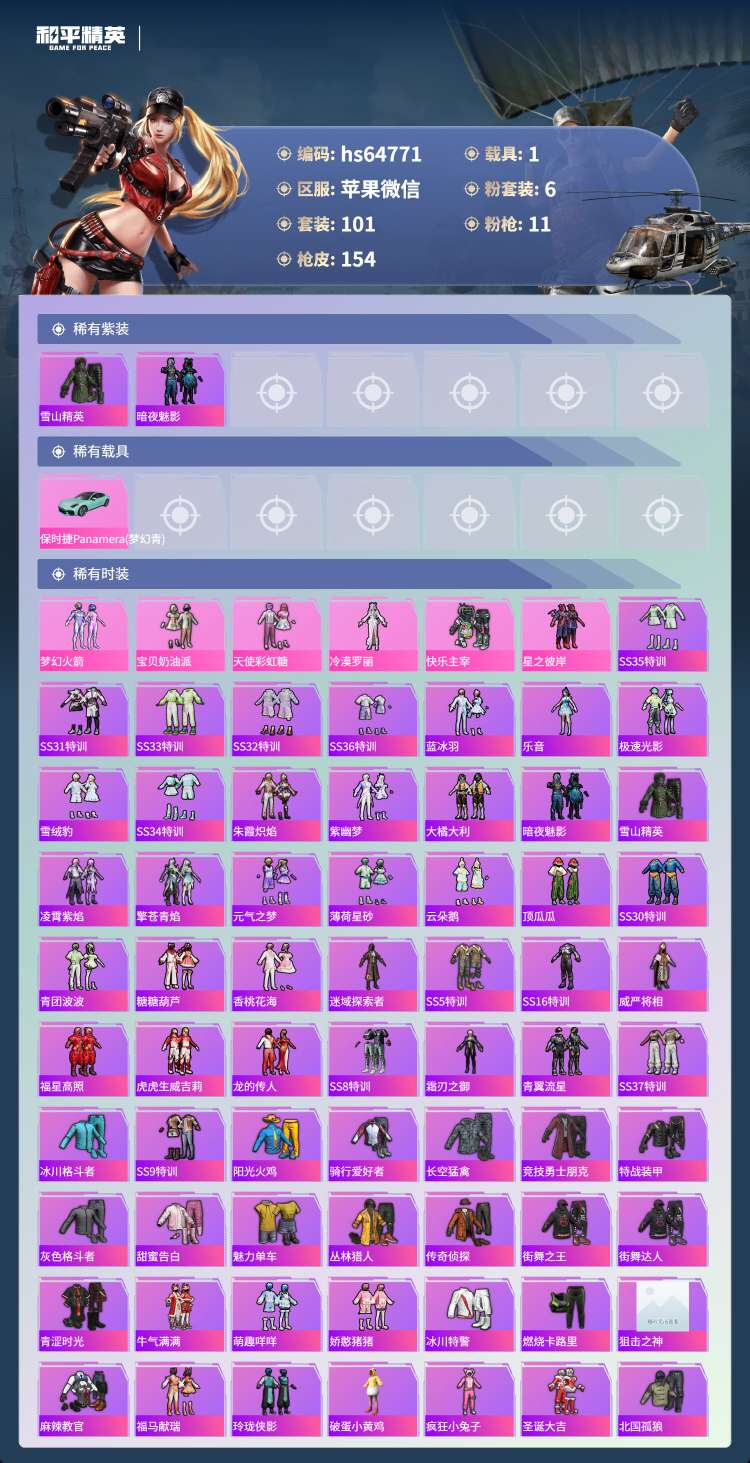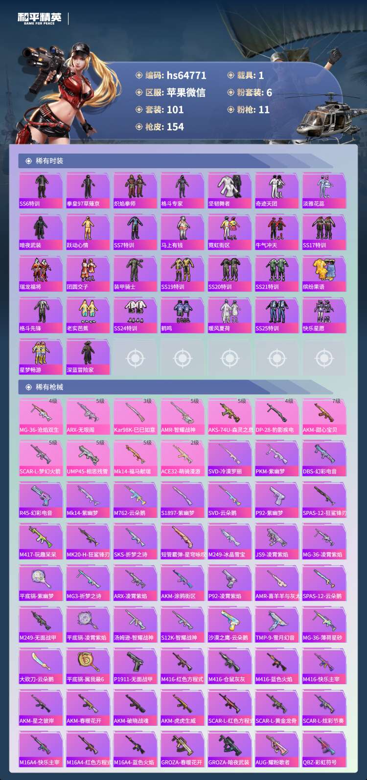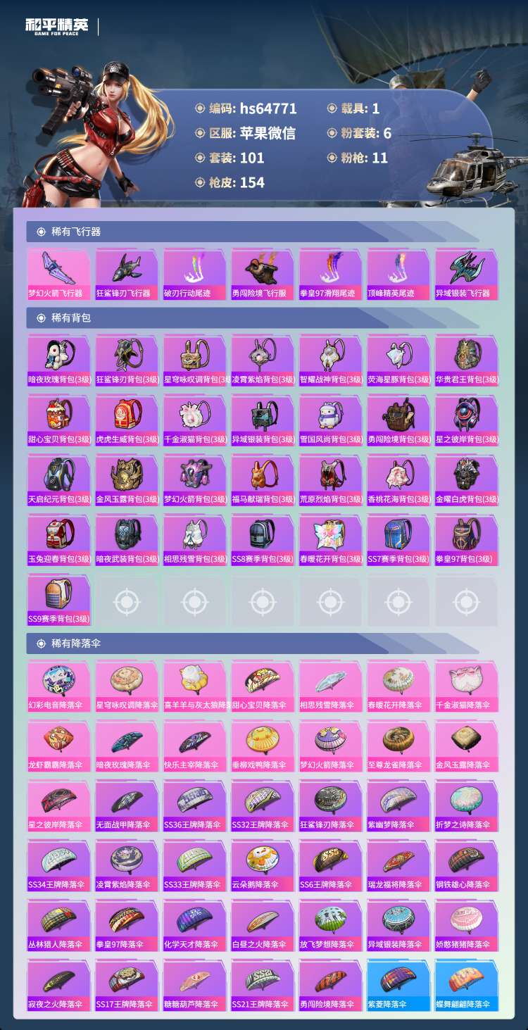 hs64771 苹果微-9王牌印记-6粉装-11特效枪-1载具-50657热力值-101套装-15