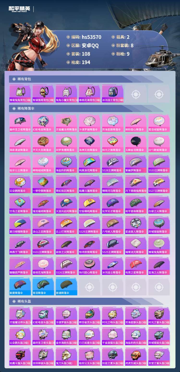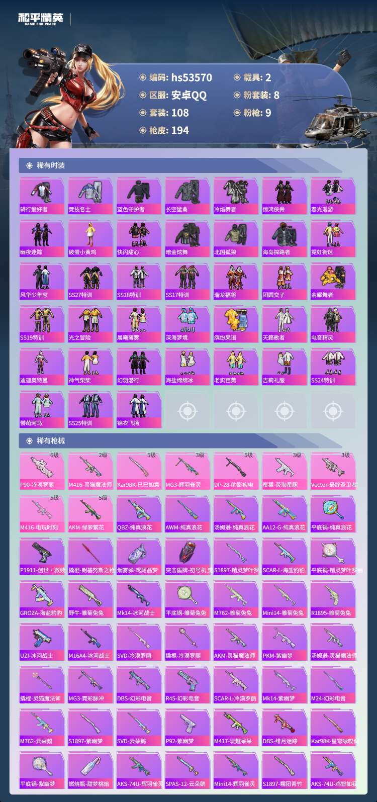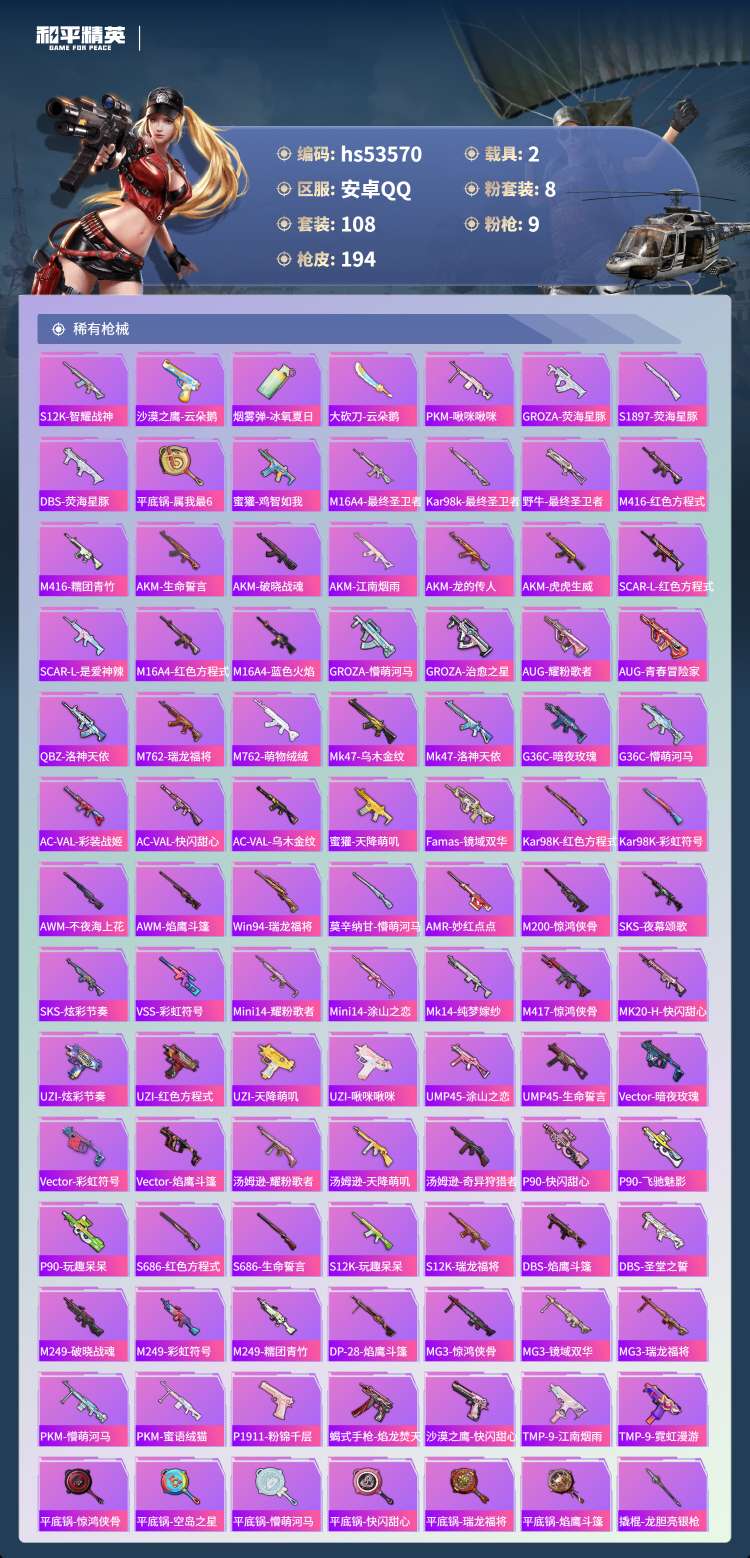 hs53570 安卓手Q-7王牌印记-8粉装-9特效枪-2载具-59709热力值-108套装-194