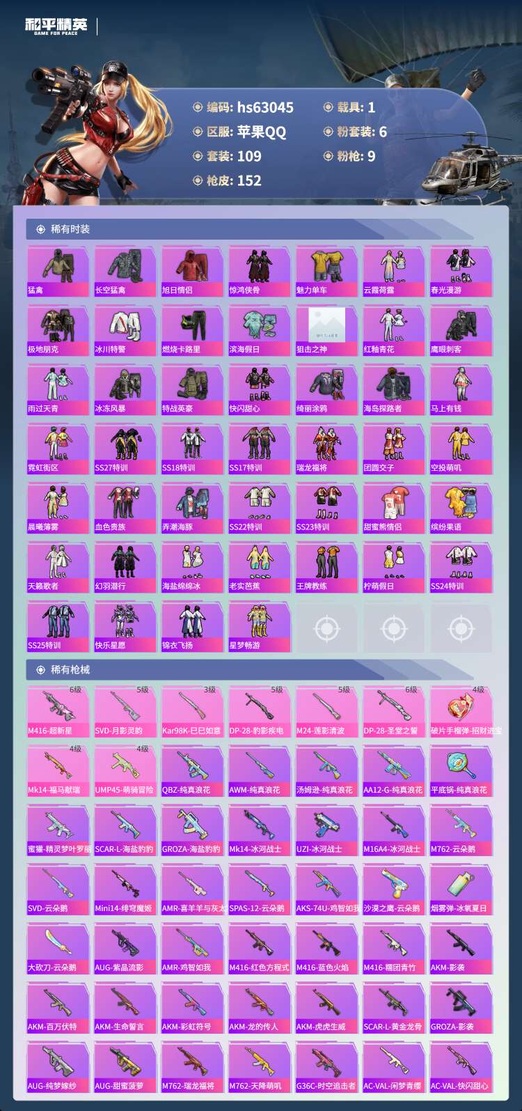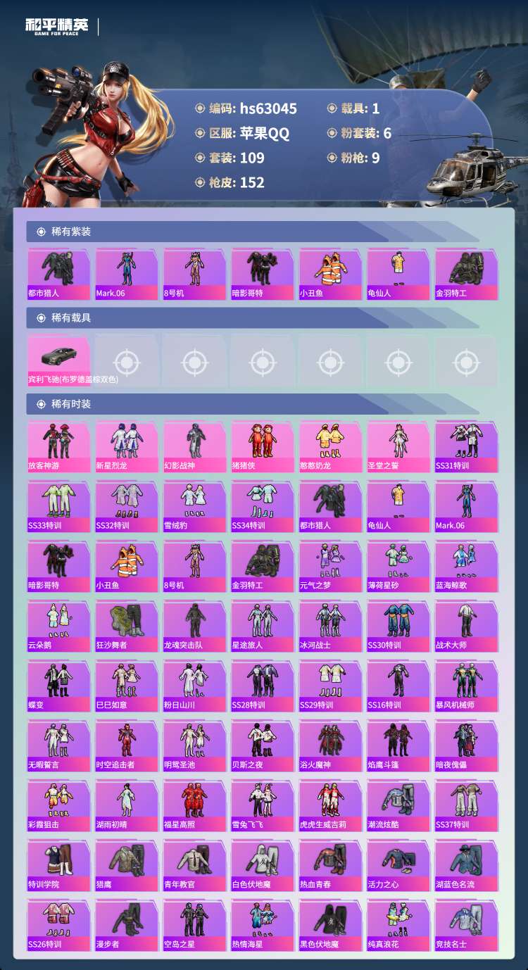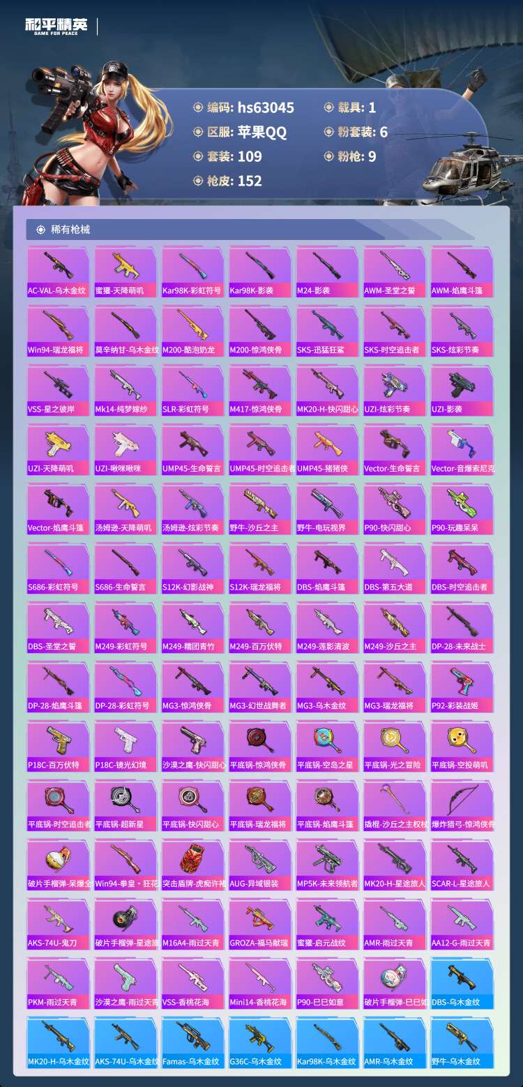 hs63045 苹果手Q-9王牌印记-6粉装-9特效枪-1载具-50557热力值-109套装-152
