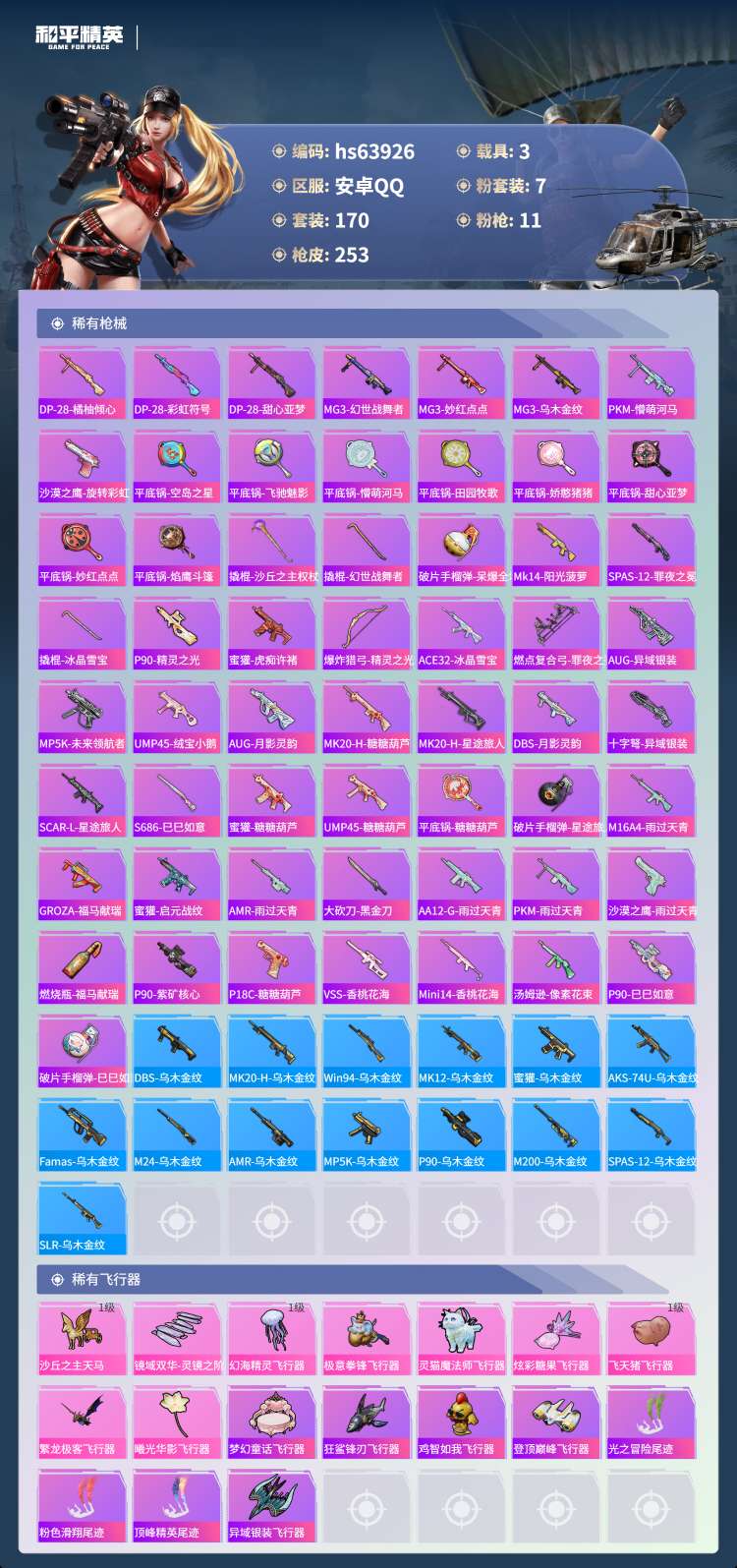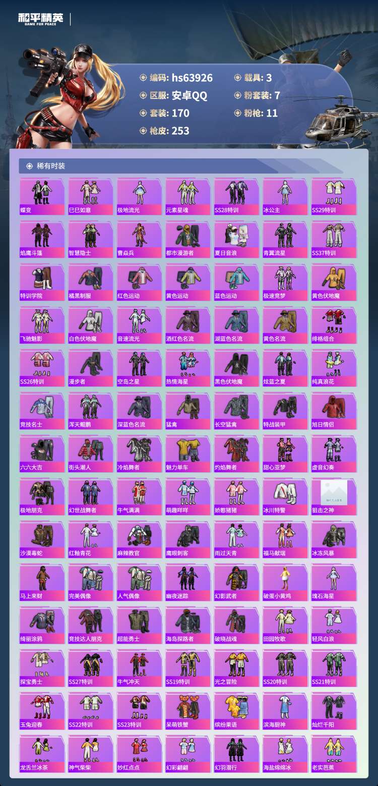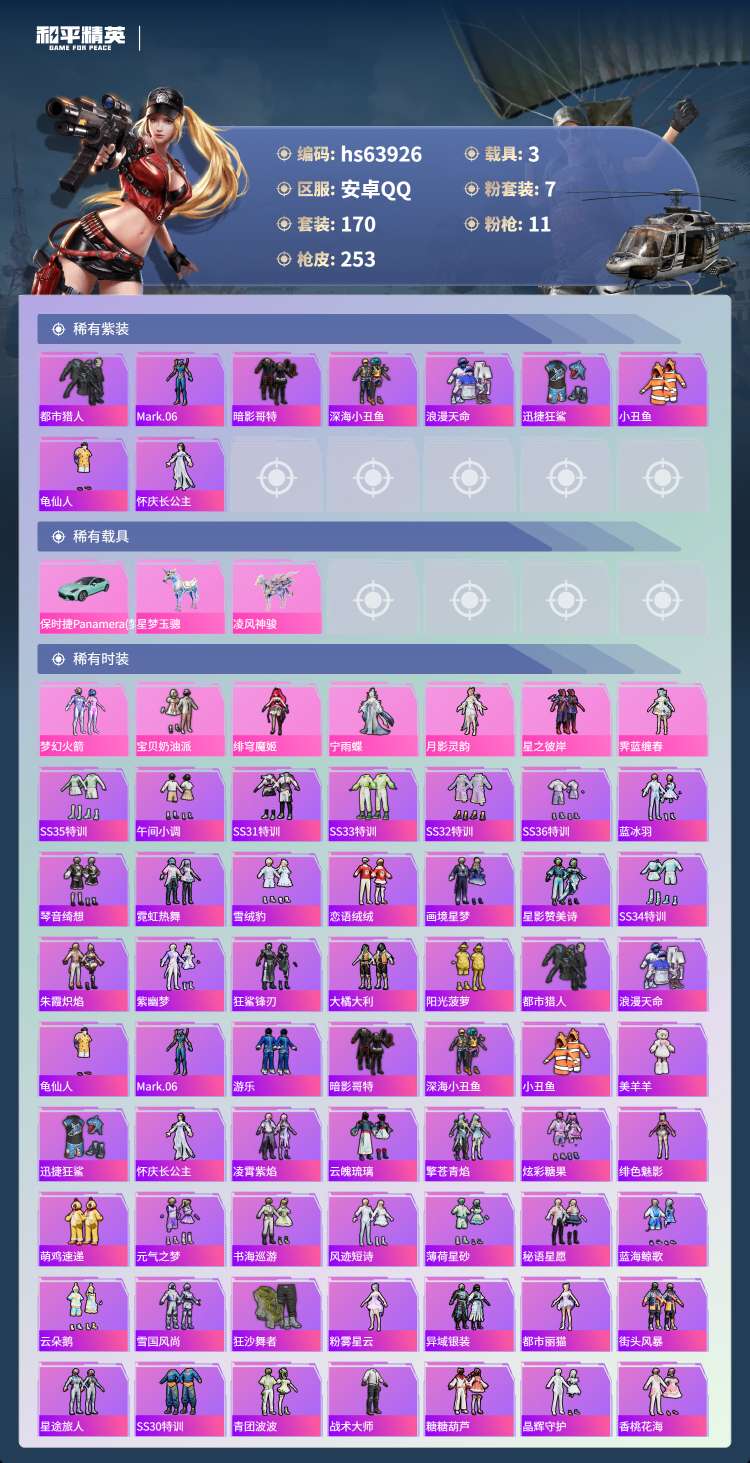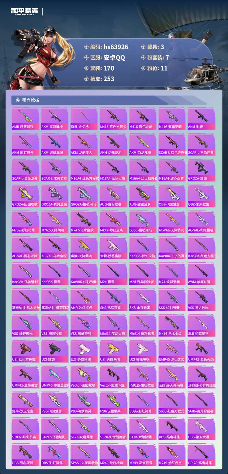hs63926 安卓手Q-8王牌印记-7粉装-11特效枪-3载具-80969热力值-170套装-25