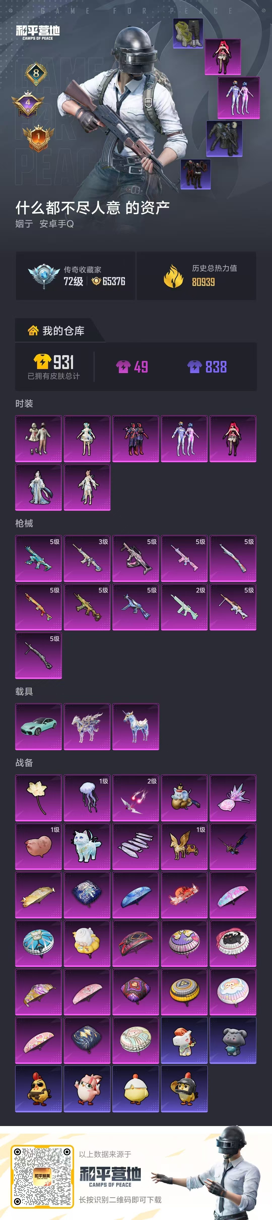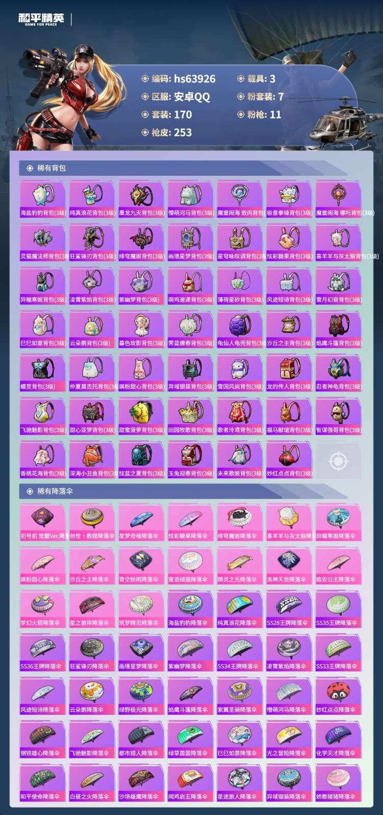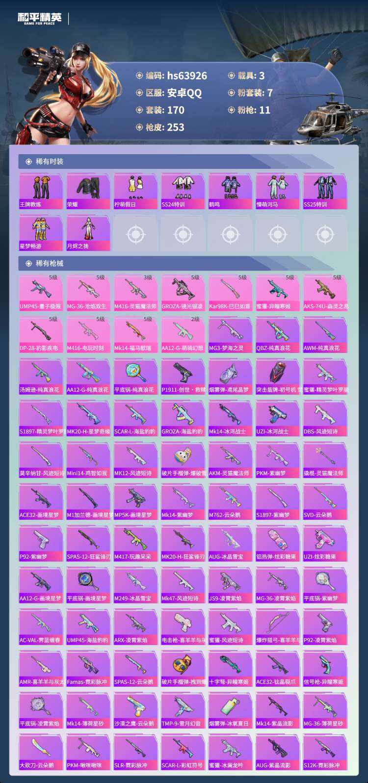 hs63926 安卓手Q-8王牌印记-7粉装-11特效枪-3载具-80969热力值-170套装-25