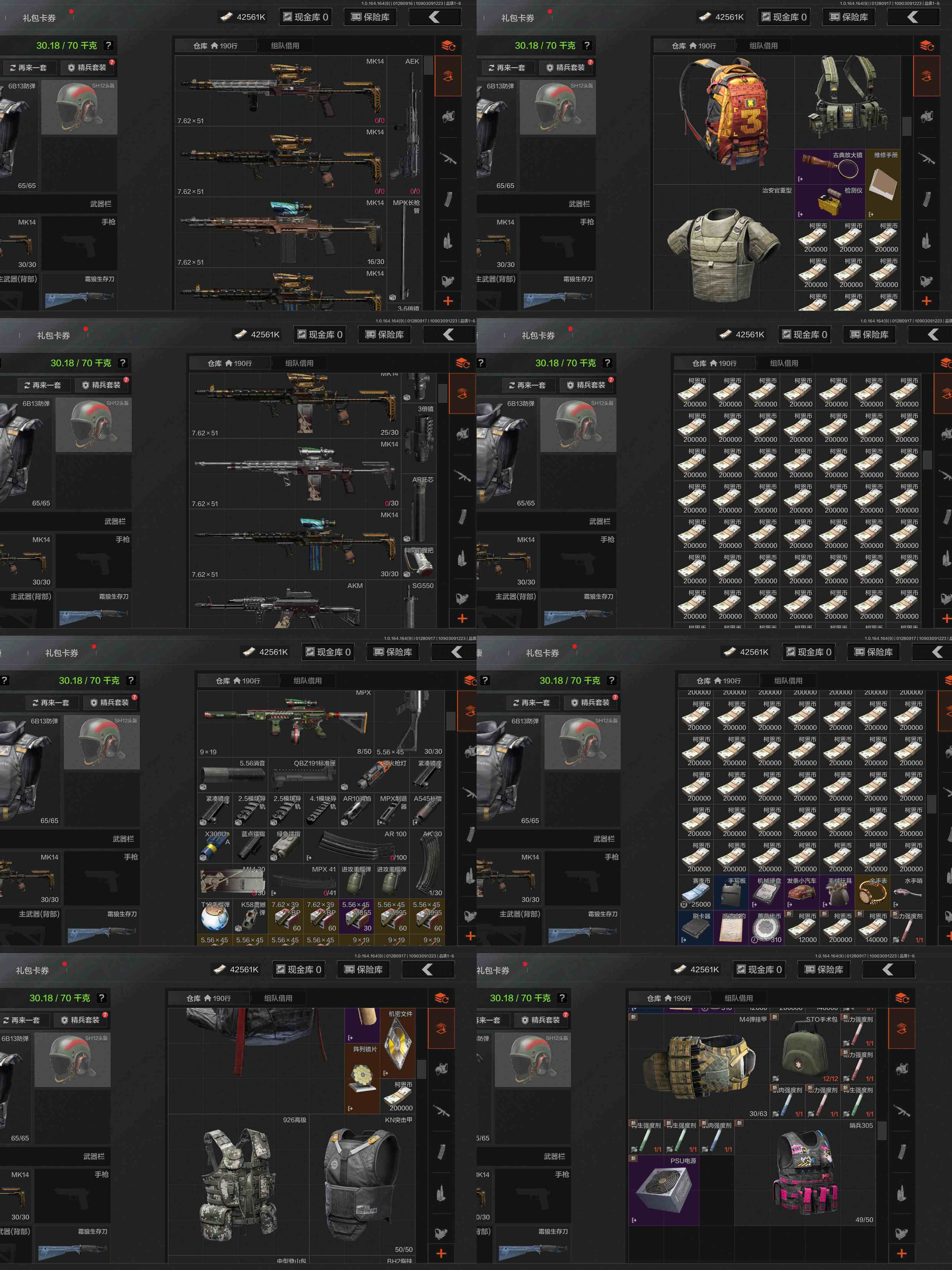 z44,4把刀热能武器.补牢突击匕首霜狼生存刀,仓库51.8M科恩币42561K,4黄枪,3外观,瓷蒺藜.T13手榴弹