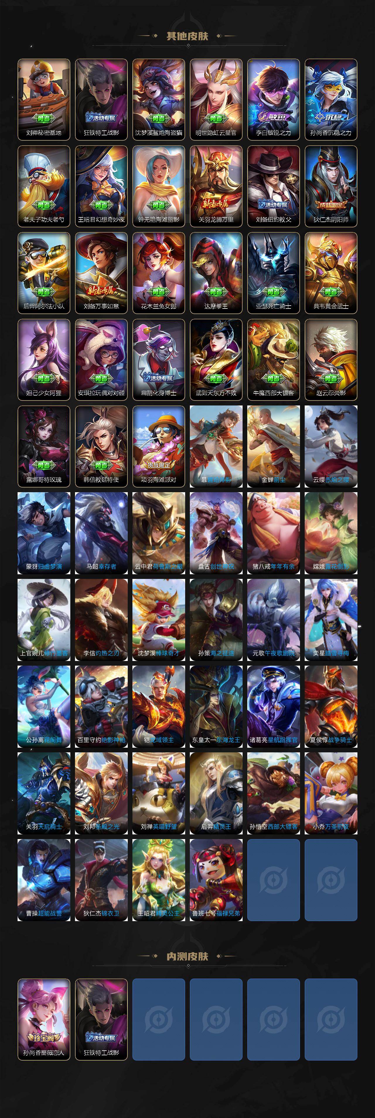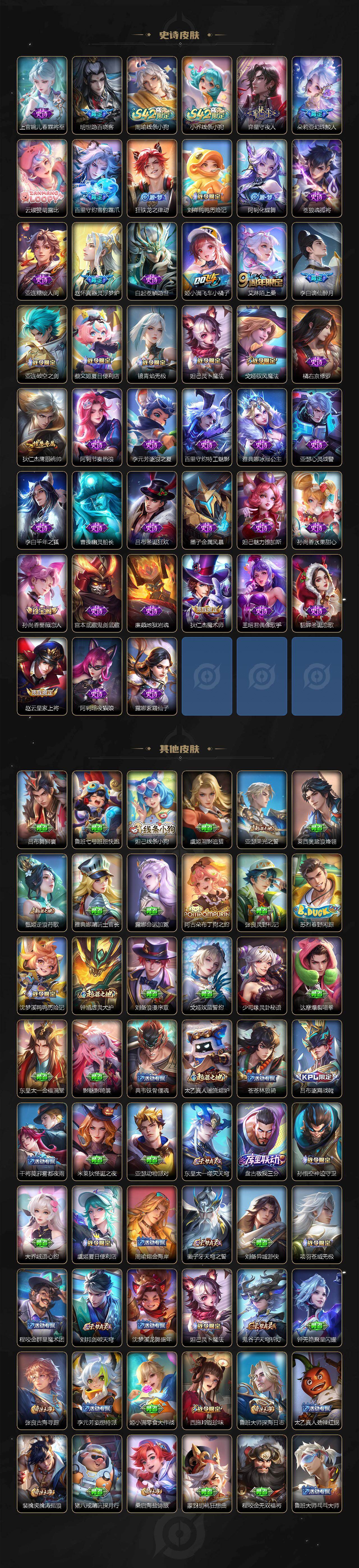 【传说皮肤】:云缨神骥越千峰,关羽神骥镇沧海,朵莉亚神骥鸣幻洲,狄仁杰神骥赴朔漠,貂蝉神骥聚万邦,马超神骥逐星野,花木兰异界灵契,大司命死亡执政官,司马懿九山相柳,司空震愿照山河定,女娲愿照千秋盛,妲己愿照众生和,澜愿照九州拓,蔡文姬愿照福禄聚,虞姬愿照岁时盈,云缨幻光神枪,裴擒虎祥瑞亨通,嬴政玄雷天君,王昭君映山客,桑启鸣野蒿,王昭君乞巧织情,铠绛天战甲