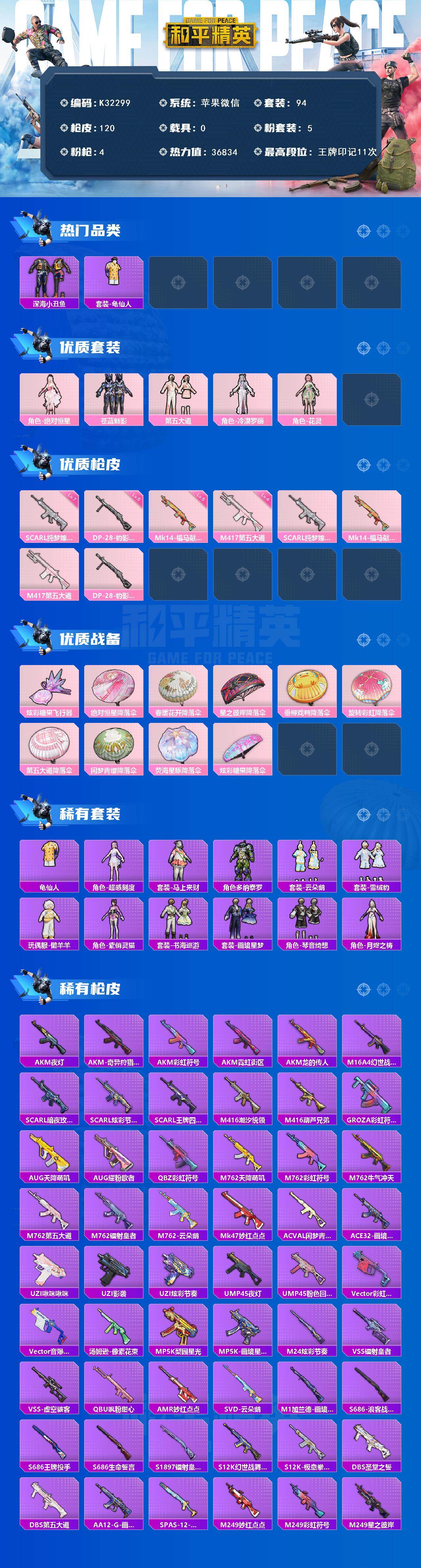 苹果 微信-5粉装-4特效枪-0载具-1粉色飞行器-36834热力值-11王牌印记-94套装-120枪皮