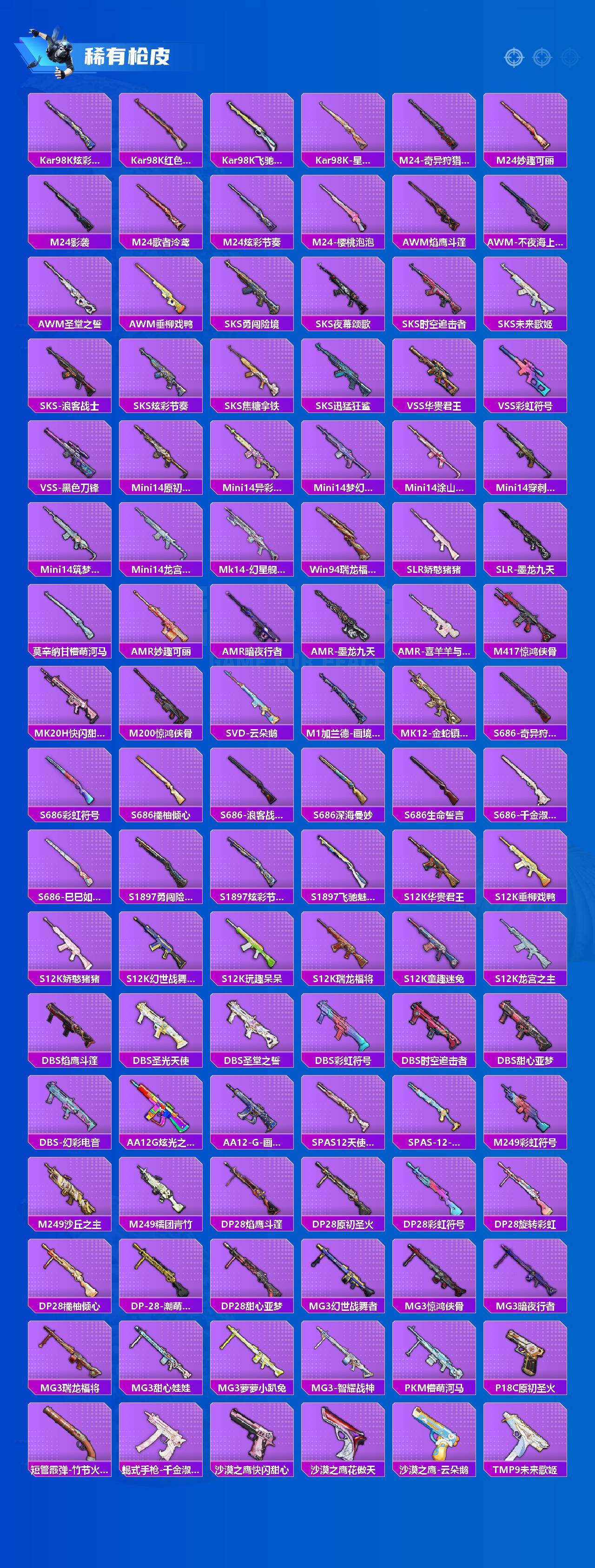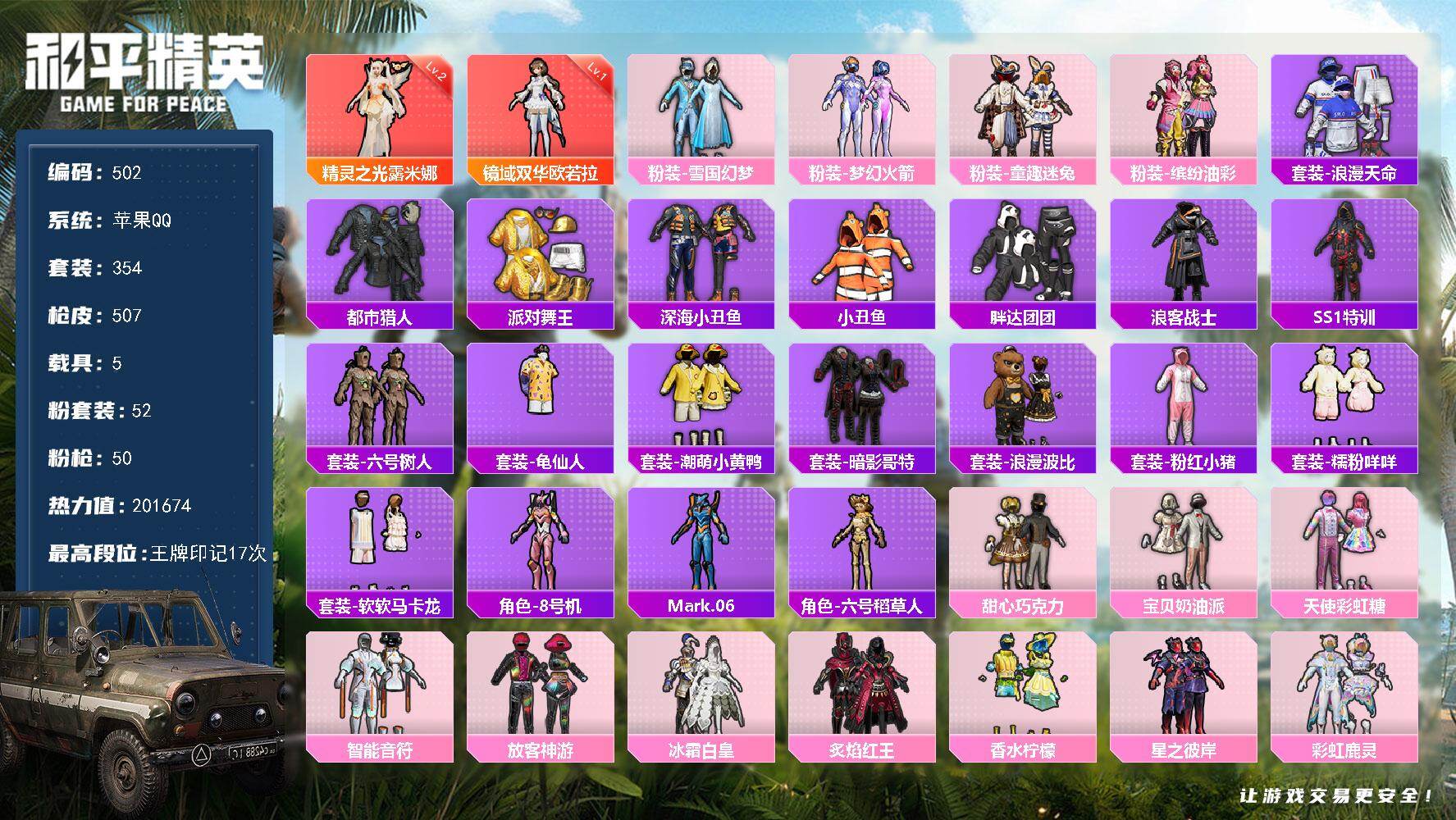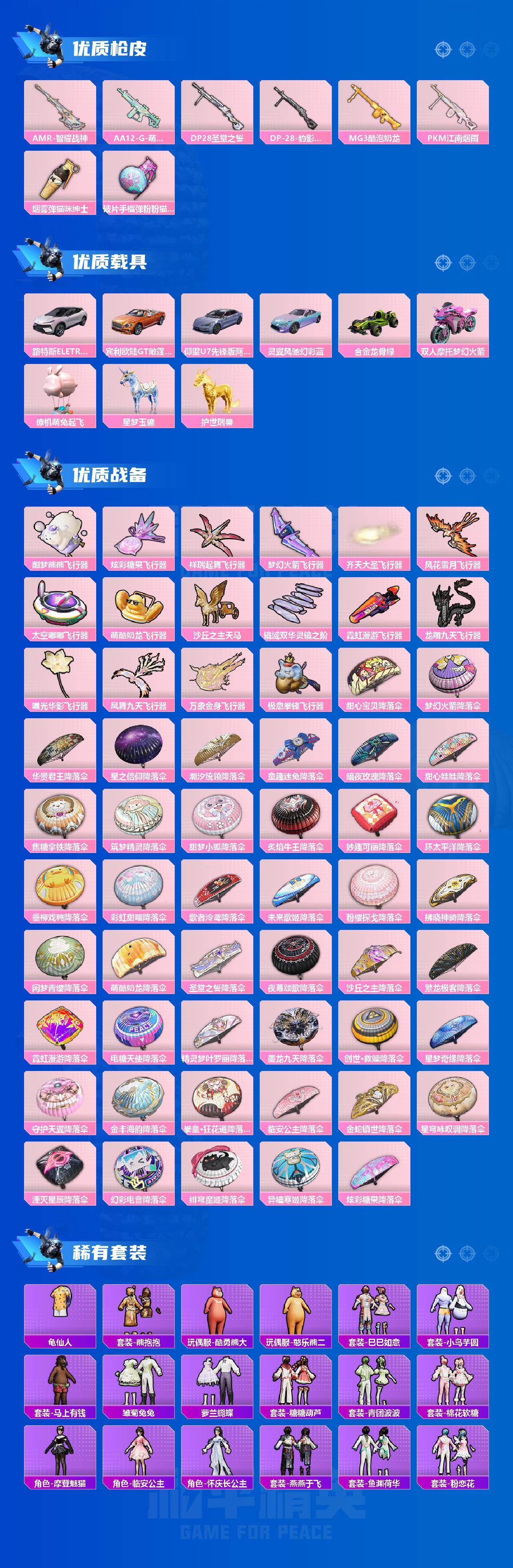 1神装-25粉装-26特效枪-8载具-17粉色飞行器-156516热力值-18王牌印记-267套装-369枪皮