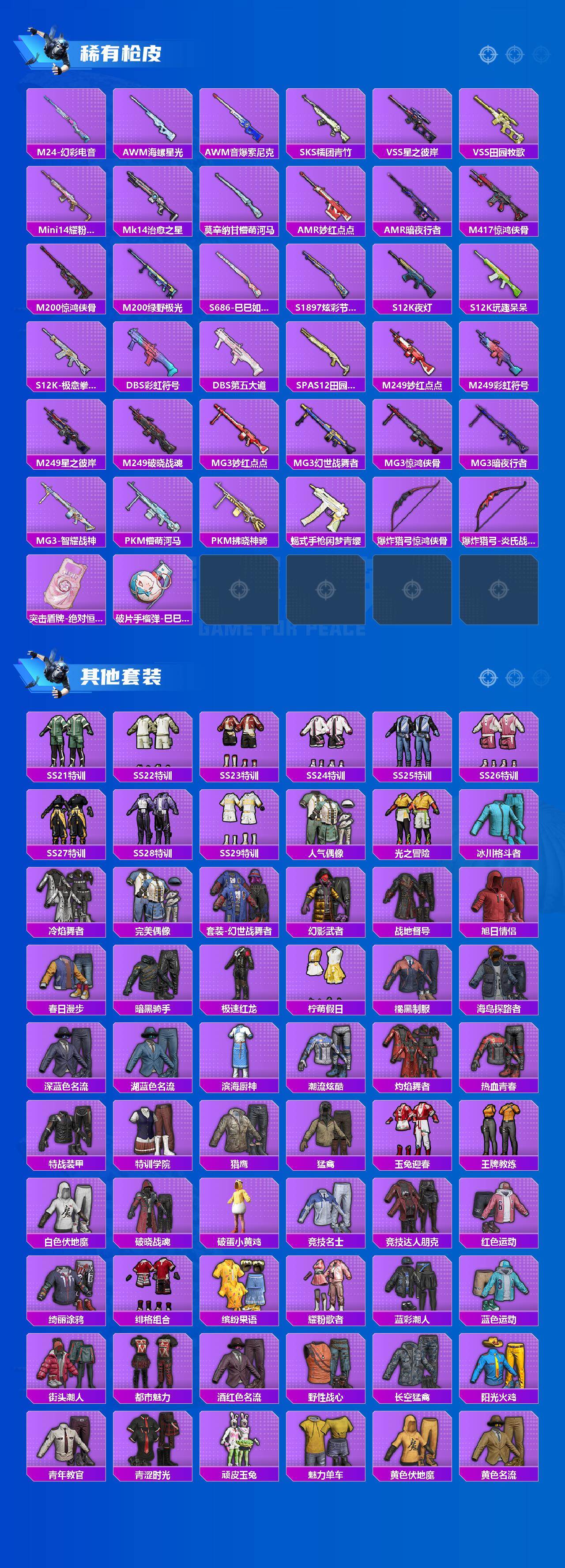 【粉色枪皮等级】:AKM-绿萝繁花(五级),M416-五爪金龙(七级),Kar98K-巳巳如意(五级),Mk14-福马献瑞(五级),DP-28-豹影疾电(五级),PKM-萌骑夺宝(四级)